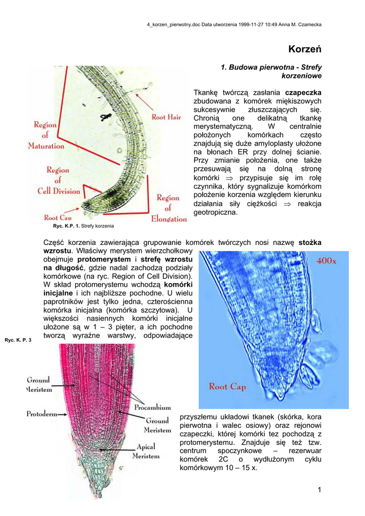 4_korzen_pierwotny.doc Data utworzenia 1999-11-27 10:49 Anna M. Czarnecka Korzeń 1. Budowa pierwotna - Strefy korzeniowe Tkankę twórczą zasłania czapeczka zbudowana z komórek miękiszowych sukcesywnie złuszczających się. Chronią one delikatną tkankę merystematyczną. W centralnie położonych komórkach często znajdują się duże amyloplasty ułożone na błonach ER przy dolnej ścianie. Przy zmianie położenia, one także przesuwają się na dolną stronę komórki ⇒ przypisuje się im rolę czynnika, który sygnalizuje komórkom położenie korzenia względem kierunku działania siły ciężkości ⇒ reakcja geotropiczna. Ryc. K.P. 1. Strefy korzenia Ryc. K. P. 3 Część korzenia zawierająca grupowanie komórek twórczych nosi nazwę stożka wzrostu. Właściwy merystem wierzchołkowy obejmuje protomerystem i strefę wzrostu na długość, gdzie nadal zachodzą podziały komórkowe (na ryc. Region of Cell Division). W skład protomerystemu wchodzą komórki inicjalne i ich najbliższe pochodne. U wielu paprotników jest tylko jedna, czterościenna komórka inicjalna (komórka szczytowa). U większości nasiennych komórki inicjalne ułożone są w 1 – 3 pięter, a ich pochodne tworzą wyraźne warstwy, odpowiadające Ryc. K. P. 2 przyszłemu układowi tkanek (skórka, kora pierwotna i walec osiowy) oraz rejonowi czapeczki, której komórki tez pochodzą z protomerystemu. Znajduje się też tzw. centrum spoczynkowe – rezerwuar komórek 2C o wydłużonym cyklu komórkowym 10 – 15 x. 1 4_korzen_pierwotny.doc Data utworzenia 1999-11-27 10:49 Anna M. Czarnecka Powyżej protomerystemu znajduje się strefa wydłużania (wzrostu na długość, elongacyjna), zwana inaczej merystematyczną strefą różnicowania. Na początkowym odcinku zachodzą intensywne podziały komórkowe (patrz. wyżej), a w miarę oddalania od protomerystemu, komórki rosą zwiększając swą objętość ⇒ zachodzą tu procesy polegające na zmianach struktury w wyniku specjalizowania się do pełnienia określonych funkcji. Komórki w poszczególnych rejonach tej strefy różnią się między sobą, przy czym różnice dotyczą częstości i orientacji podziałów oraz kierunku wzrostu objętościowego, np. pojedyncza, zewnętrzna warstwa komórek o podziałach antyklinalnych (prostopadłe do powierzchni organu) ⇒ praskórka (protoderma); pod nią pramiękisz prakory - dzielący się peryklinalnie (równolegle do powierzchni); prokambium tworzy walec osiowy i dzieli się podłużnie. Kolejna strefa to strefa różnicowania = strefa dojrzałości = strefa włośnikowa. W strefie tej widzimy Ryc. K. P. 4 Przekrój poprzeczny przez walec osiowy i korę pierwotną młodego 2. pierwotną budowę korzenia korzenia Z peryferycznie położonych komórek w strefie różnicowania korzenia powstaje tkanka okrywająca – skórka (tu zwana ryzodermą). Stanowi ją jedna warstwa ściśle przylegających komórek o żywym protoplaście. Ich celulozowe ściany tworzą charakterystyczne uwypuklenia – włośniki, za pomocą których pobierana jest woda z gleby oraz sole mineralne. Włośnik jest wydłużoną komórką epidermalną, której wnętrze wypełnia prawie całkowicie duża wakuola i której cytoplazma ograniczona jest do cienkiej warstewki. Jądra znajduje się blisko wierzchołka. Włośnik może mieć długość do kilu milimetrów. Żyje krótko, a nowe pojawiają się w młodszej części korzenia. Warstwa epidermy nie jest pokryta kutikulą, względnie kutikula jest bardzo cienka. Nie ma też szparek. Pod tkanką okrywającą znajduje się tkanka miękiszowa, którą tworzy korę pierwotną. Komórki są żywe, cienkościenne – przewodzą wodę i sole mineralne do włośników do wiązek przewodzących walca; ponad to są lużno ułożone, a ich duże przestwory międzykomórkowe ułatwiają wymianę gazową. W starszych roślinach często pełni funkcję spichrzową, a u wielu roślin istnieją w niej kanały żywicze lub zespoły innych komórek wydzielniczych. Warstwa zewnętrzna kory pierwotnej, leżąca bezpośrednio pod skórką również może ulegać 2 4_korzen_pierwotny.doc Data utworzenia 1999-11-27 10:49 Anna M. Czarnecka przekształceniom, np. u jaskra rozesłanego ściany korkowacieją i stają się nieprzepuszczalne dla wody. ! Zachodzi to kiedy włośniki przestają funkcjonować. W ten sposób powstaje egzoderma (hypoderma, podskórnia). U jednoliściennych powstaje ona dość wcześnie (wówczas różnicują się w niej komórki przepustowe). Najbardziej wewnętrzna warstwa kory to śródskórnia (endoderma). Jej komórki są drobne, ściśle do siebie przylegają, a ich ściany sukcesywnie ulegają suberynizacji i lignifikacji, dokładnie pasemka na ścianach promienistych i poprzecznych ⇒ pasemka Caspary’ego. Przez taką komórkę woda może przedostać się w poprzek ściany ustawionej prostopadle do promieni walca osiowego, a następnie przez cytoplazmę komórki i przez drugą ścianę. Warstwa ta stanowi więc barierę dla przepływu roztworów wodnych, który wcześniej odbywa się apoplastem, muszą one przejść przez plazmalemmę i odbyć drogę symplastem. Napotkane błony komórkowe kontrolują przepływ związków chemicznych – czynna regulacja przepływu wody1. Później (powyżej strefy wydłużania) ściany wewnętrzne i radialne tak korkowacieją, że ściana przyjmuje kształt litery U. Pośród nich znajdują się jednak komórki o ścianach pozbawionych zgrubień (zwykle położone naprzeciwko wiązek protoksylemu), które nie uległy ani lignifikacji, ani suberynizacji. To tzw. komórki przepustowe, dzięki którym woda przechodzi do wnętrza korzenia. Centralną część korzenia stanowi walec osiowy, którego pierwsza warstwa zachowuje twórczy charakter i nosi nazwę okolnicy (perycyklu, czasem zwana perykambium). Warstwa ta daje początek korzeniom bocznym, bierze udział we wzroście wtórnym zdrewniałych korzeni roślin wieloletnich. W st