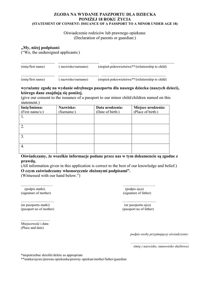 ZGODA NA WYDANIE PASZPORTU DLA DZIECKA PONIŻEJ 18 ROKU ŻYCIA (STATEMENT OF CONSENT: ISSUANCE OF A PASSPORT TO A MINOR UNDER AGE 18) Oświadczenie rodziców lub prawnego opiekuna: (Declaration of parents or guardian:) „My, niżej podpisani: (“We, the undersigned applicants:) ................................ ....................................... (imię/first name) ( nazwisko/surname) ............................................................. (stopień pokrewieństwa**/(relationship to child) ................................ ....................................... ............................................................. (imię/first name) ( nazwisko/surname) (stopień pokrewieństwa**/(relationship to child) wyrażamy zgodę na wydanie odrębnego paszportu dla naszego dziecka (naszych dzieci), którego dane znajdują się poniżej. (give our consent to the issuance of a passport to our minor child/children named on this statement.) Imię/Imiona: (First name/s:) Nazwisko: (Surname:) Data urodzenia: (Date of birth:) Miejsce urodzenia: (Place of birth:) 1. 2. 3. 4. Oświadczamy, że wszelkie informacje podane przez nas w tym dokumencie są zgodne z prawdą. (All information given in this application is correct to the best of our knowledge and belief.) O czym zaświadczamy własnoręcznie złożonymi podpisami”. (Witnessed with our hand below.”) .................................... (podpis matki) (signature of mother) ….........................….... (podpis ojca) (signature of father) ...................................... (nr paszportu matki) (passport no of mother) ...................................... (nr paszportu ojca) (passport no of father) ................................. Miejscowość i data: (Place and date) podpis osoby przyjmującej oświadczenie: .................................................................. (imię i nazwisko, stanowisko służbowe) *niepotrzebne skreślić/delete as appropriate **matka/ojciec/prawna opiekunka/prawny opiekun/mother/father/guardian