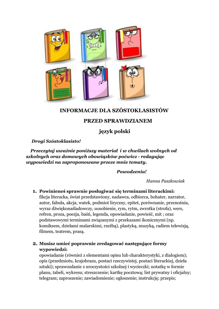 INFORMACJE DLA SZÓSTOKLASISTÓW PRZED SPRAWDZIANEM język polski Drogi Szóstoklasisto! Przeczytaj uważnie poniższy materiał i w chwilach wolnych od szkolnych oraz domowych obowiązków poćwicz - redagując wypowiedzi na zaproponowane przeze mnie tematy. Powodzenia! Hanna Paszkowiak 1. Powinieneś sprawnie posługiwać się terminami literackimi: fikcja literacka, świat przedstawiony, nadawca, odbiorca, bohater, narrator, autor, fabuła, akcja, watek, podmiot liryczny, epitet, porównanie, przenośnia, wyraz dźwiękonaśladowczy, uosobienie, rym, rytm, zwrotka (strofa), wers, refren, proza, poezja, baśń, legenda, opowiadanie, powieść, mit ; oraz podstawowymi terminami związanymi z przekazami ikonicznymi (np. komiksem, dziełami malarskimi, rzeźbą), plastyką, muzyką, radiem telewizją, filmem, teatrem, prasą. 2. Musisz umieć poprawnie zredagować następujące formy wypowiedzi: opowiadanie (również z elementami opisu lub charakterystyki, z dialogiem); opis (przedmiotu, krajobrazu, postaci rzeczywistej, postaci literackiej, dzieła sztuki); sprawozdanie z uroczystości szkolnej i wycieczki; notatkę w formie planu, tabeli, wykresu; streszczenie; kartkę pocztową; list prywatny i oficjalny; telegram; zaproszenie; zawiadomienie; ogłoszenie; instrukcję; przepis; 3. Powinieneś umieć formułować wypowiedzi ze świadomością celu (intencji): pytać i odpowiadać; potwierdzać i zaprzeczać; polecać i prosić; przyrzekać i obiecywać; zachęcać i zniechęcać; zapraszać; przepraszać; współczuć; żartować; wątpić; odmawiać; 4. Koniecznie przypomnij sobie takie zagadnienia: alfabet; słowniki i inne źródła(np. książki kulinarne, encyklopedie, przewodniki, czasopisma); wyrazy bliskoznaczne (synonimy); wyrazy przeciwstawne (antonimy); wyrazy pokrewne (rodzina wyrazów); Dobre rady Pracuj z różnymi tekstami kultury: obrazem, komiksem, czasopismem dla młodzieży, lekturami szkolnymi, słownikami, różnymi utworami literatury pięknej i młodzieżowej. Czytając, zwracaj uwagę na zapamiętywanie poprawnej pisowni trudnych wyrazów, utrwalenie zasad interpunkcji i ortografii. Czytaj uważnie i ze zrozumieniem – opowiedz innym o tym, czego się dowiedziałeś. Ćwicz umiejętność wypowiadania własnych sądów, opinii na różne tematy. Pracuj z tekstem; szukaj w nim różnych danych, np. imion, nazwisk, cech charakteru bohatera, przygód. Ćwicz krótkie formy wypowiedzi. Odróżniaj język potoczny (mówiony i pisany) od języka literackiego. Dbaj o poprawny język, poznawaj znaczenie nowych wyrazów, wzbogacaj słownictwo, szukaj synonimów, naśladuj dobre wzorce. Omawiaj i interpretuj różne utwory, szczególnie poetyckie. Posługuj się terminami, jakie są w słowniczkach na końcu książek. Przed przystąpieniem do zadań z różnych przedmiotów uważnie czytaj polecenia i instrukcje, kieruj się nimi, wykonując zadania. Pisz zdania pojedyncze rozwinięte zamiast złożonych. Unikaj powtarzania wyrazów w bliskim sąsiedztwie, dane słowo zastąp synonimem. Odpowiadaj dokładnie na pytania. Dobieraj argumenty, by uzasadnić swoje stanowisko. Redaguj teksty o charakterze użytkowym Zaglądaj do różnych słowników, encyklopedii, leksykonów, map, atlasów, czasopism itp. Korzystaj z edukacyjnych stron internetowych i edukacyjnych programów komputerowych. Wybieraj oferty odpowiednie dla swego wieku, zainteresowań i potrzeb. Dużo czytaj. Uważnie analizuj treść wszystkich poleceń. Dbaj o staranność i estetykę zapisu. Stosuj akapity. Pisz wymaganą ilość tekstu zgodnie z poleceniem (np. nie mniej niż połowę wyznaczonego miejsca) PRZYKŁADOWE TEMATY WYPRACOWAŃ (różne formy wypowiedzi) 1. Podróż moich marzeń. Opisz miejsce, które chciałbyś/chciałabyś zwiedzić. Uzasadnij swój wybór. 2. Śniło mi się, że w pięknym ogrodzie spotkałem… Opowiedz o spotkaniu ze znaną postacią z historii Polski (np. władcą, uczonym, pisarzem, sławnym twórcą, patronem szkoły). 3. Napisz ogłoszenie o organizowanych zawodach pływackich. Zachęć uczniów do uczestnictwa w tych zawodach. 4. Moja ulubiona pora roku. Opisz wybraną porę roku i uzasadnij, dlaczego ją lubisz. 5. Wyobraź sobie, że jesteś marynarzem pływającym w łodzi podwodnej Nautilus. Opisz swoje przeżycia podczas rejsu lub opowiedz o przygodzie, które wydarzyła się po dotarciu do Bieguna Północnego. 6. Opisz piękny zakątek sadu, parku lub lasu. Postaraj się, by Twój opis był barwny. W opisie uwzględnij: porę roku, wygląd np. drzew, krzewów, trawników, klombów, odgłosy przyrody, nastrój. 7. Co roku przed sezonem letnim media ostrzegają, że długie przebywanie na słońcu może być niebezpieczne, ponieważ grozi udarem słonecznym lub poparzeniami skóry. Twój najlepszy kolega wybiera się w upalny dzień na plażę. Udziel mu czterech porad. Zapisz je w formie instrukcji. 8. Napisz opowiadanie o zdarzeniu prawdziwym lub zmyślonym, które miało miejsce latem, w słoneczny dzień. 9. Napisz list do kolegi lub koleżanki, zachęcający do zwiedzenia… 10. Jest lato. Chcesz wysłać kartkę pocztową do bliskiej Ci osoby, by przekazać, gdzie i jak spędzasz wakacje. Napisz tę kartkę i poprawnie ja zaadresuj. 11. Napisz kilkuzdaniowa notatkę o gatunkach filmów, które najchętniej oglądasz. Uzasadnij swój wybór. 12. Opisz (scharakteryzuj) bohatera swojego ulubionego filmu. Napisz, czym kierowałeś się, dokonując wyboru. 13. Napisz list do władz miasta, w którym zwracasz się z prośbą o pomoc w organizacji Szkolnego Konkursu Wiedzy o …( przedstaw cel konkursu, sformułuj potrzeby związane z organizacja konkursu, uzasadnij prośbę). 14. Napisz list do kolegi lub koleżanki. Przekonaj go/ją, że nie warto i nie powinno się godzinami przesiadywać przed telewizorem. 15. Co i dlaczego najczęściej robisz, gdy w wolnym czasie nie oglądasz telewizji? 16. Zredaguj zaproszenie na swoje urodziny. Skieruj je do bliskiej Ci o