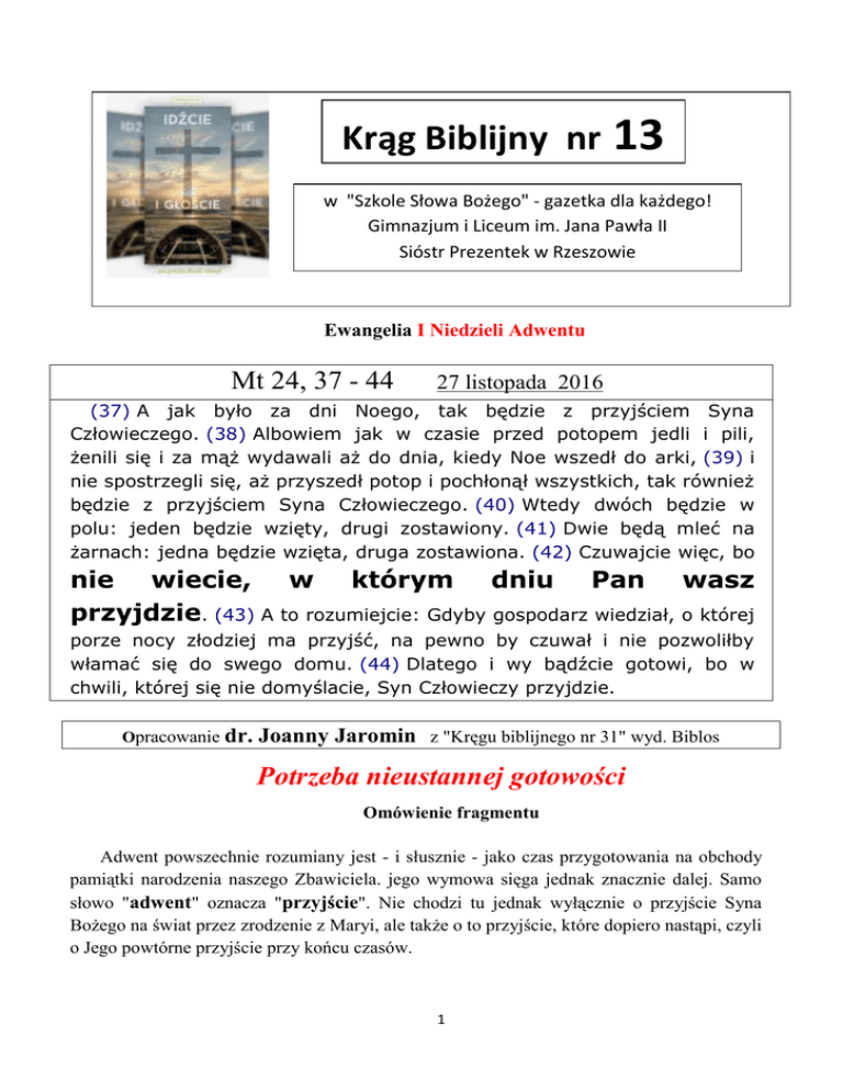 Krąg Biblijny nr 13 w "Szkole Słowa Bożego" - gazetka dla każdego! Gimnazjum i Liceum im. Jana Pawła II Sióstr Prezentek w Rzeszowie Ewangelia I Niedzieli Adwentu Mt 24, 37 - 44 27 listopada 2016 (37) A jak było za dni Noego, tak będzie z przyjściem Syna Człowieczego. (38) Albowiem jak w czasie przed potopem jedli i pili, żenili się i za mąż wydawali aż do dnia, kiedy Noe wszedł do arki, (39) i nie spostrzegli się, aż przyszedł potop i pochłonął wszystkich, tak również będzie z przyjściem Syna Człowieczego. (40) Wtedy dwóch będzie w polu: jeden będzie wzięty, drugi zostawiony. (41) Dwie będą mleć na żarnach: jedna będzie wzięta, druga zostawiona. (42) Czuwajcie więc, bo nie wiecie, w którym dniu Pan wasz przyjdzie. (43) A to rozumiejcie: Gdyby gospodarz wiedział, o której porze nocy złodziej ma przyjść, na pewno by czuwał i nie pozwoliłby włamać się do swego domu. (44) Dlatego i wy bądźcie gotowi, bo w chwili, której się nie domyślacie, Syn Człowieczy przyjdzie. Opracowanie dr. Joanny Jaromin z "Kręgu biblijnego nr 31" wyd. Biblos Potrzeba nieustannej gotowości Omówienie fragmentu Adwent powszechnie rozumiany jest - i słusznie - jako czas przygotowania na obchody pamiątki narodzenia naszego Zbawiciela. jego wymowa sięga jednak znacznie dalej. Samo słowo "adwent" oznacza "przyjście". Nie chodzi tu jednak wyłącznie o przyjście Syna Bożego na świat przez zrodzenie z Maryi, ale także o to przyjście, które dopiero nastąpi, czyli o Jego powtórne przyjście przy końcu czasów. 1 Ten podwójny charakter Adwentu jest widoczny przede wszystkim w czytaniach liturgicznych, w pierwszej bowiem, dłuższej, jego części dochodzi do głosu zapowiedź powtórnego przyjścia Chrystusa i konieczność przygotowania na to wydarzenie; natomiast w drugiej, krótszej, części - wybrzmiewają wydarzenia bezpośrednio poprzedzające pierwsze przyjście Jezusa na świat. Dlatego też fragment Ewangelii św. Mateusza, który pojawia się na początku oczekiwania adwentowego, ma właśnie charakter eschatologiczny, gdyż dotyczy paruzji, czyli powtórnego przyjścia Chrystusa. Św. Bernard mówi o trzech przyjściach Pana: "Za pierwszym swoim przyjściem Pan był widziany na ziemi i przebywał wśród ludzi, bo jak sam o tym mówi: ujrzeli i znienawidzili. Gdy nastąpi ostatnie przyjście, wtedy wszyscy ludzie ujrzą zbawienie Boże i będą patrzeć na tego, którego przebodli. Ale pośrednie przyjście, o którym mówimy, jest ukryte i tylko wybrani widzą Pana w sobie, a ich dusze dostępują zbawienia". Omawiana perykopa należy do większego fragmentu mówiącego o zburzeniu Jerozolimy i powtórnym przyjściu Chrystusa (Mt 24, 1- 25,46), czyli do tak zwanej mowy eschatologicznej; i bezpośrednio wpisuje się w to ostatnie wydarzenie. Mamy tu do czynienia z zapożyczonym z judaizmu językiem apokaliptycznym, który służy do wyrażenia odpowiedniego przesłania teologicznego. Jest ona także poprzedzona wersetem Mt 24, 36, który wprost mówi, że nikt, za wyjątkiem samego Boga, nie wie, kiedy nastąpi paruzja. Dlatego też wszelkie spekulacje na ten temat, które współcześnie są popularne, pozbawione są zupełnie podstaw, a co więcej - człowiek, próbując dociec, kiedy to nastąpi, stawia samego siebie w miejsce Boga, a tym samym popełnia grzech. Łukasz w Dziejach Apostolskich przytacza zresztą słowa Jezusa: "Nie wasza to rzecz znać czasy i chwile, które Ojciec ustalił swoją władzą" (Dz 1, 7). Jezus nazywa tu siebie Synem Człowieczym (por. Mt 24, 37.39.44). Tego tytułu chrystologicznego ewangelista używa wtedy, gdy mowa jest o Jezusie przychodzącym na sąd (np. Mt 10, 23; 13,41 i in.), a ponowne przyjście Pana wiązać się będzie właśnie z sądem. Chociaż królestwo Boże już przyszło, to chrześcijanie są wezwani do modlitwy i działania, aby osiągnęło ono pełnię. Jezus rozpoczyna swoją mowę od porównania obecnej sytuacji z historią Noego (Mt 24, 38; por. Rdz 6,9 - 7,24). Noe posłuszny Bogu, choć zapewne wyśmiewany przez ludzi, budował arkę, mimo że nic nie wskazywało na to, że będzie ona rzeczywiście potrzebna. Pracował niewątpliwie przy pięknej pogodzie, podczas gdy inni oddawali się wyłącznie własnym sprawom. 2 Tekst ewangelii wymienia trzy czynności: jedzenie, picie i zawieranie związków małżeńskich. Choć nie ma w nich niczego złego, to jednak w tym kontekście można dopatrzeć się pewnej przyziemności i rutyny, pochłaniają one bowiem ludzi bez reszty, nie pozostawiając miejsca dla Boga czy też na działania skierowane na dobro człowieka znajdującego się w potrzebie. Noe w tym czasie, w pełni ufając Bogu, pracował nad wykonaniem Jego poleceń i dzięki temu był gotowy na potop, w przeciwieństwie do pozostałych, których to wydarzenie zaskoczyło, i to tak bardzo, że nie mieli już żadnych szans na uratowanie własnego życia. Tak też będzie z przyjściem Syna Człowieczego. Przybędzie On niespodziewanie, nagle i zaskoczy tych wszystkich, którzy pogrążeni będą wyłącznie w sprawach materialnych i doczesnych. William Barclay w ten sposób to komentuje: "Wiersze te są ostrzeżeniem, aby nigdy nie dać się tak pochłonąć czasowi, abyśmy zapomnieli o wieczności, nigdy nie pozwolili świeckim sprawom, chociażby bardzo ważnym, do tego stopnia odwrócić naszą uwagę od Boga, abyśmy zapomnieli o Jego istnieniu; o tym, że wynik końcowy naszego życia i śmierci znajduje się w Jego rękach, i że powinniśmy być zawsze gotowi, w jakimkolwiek czasie Jego powołanie zabrzmi, czy to rankiem, czy w południe, czy wieczorem. Wiersze te mówią nam, że przyjście Chrystusa będzie czasem podziału i sądu, kiedy Jezus Chrystus zbierze przed sobą tych, którzy są Jego". Porównanie z czasami Noego ma przede wszystkim uświadomić niewiedzę co do czasu paruzji i zachęcić do czuwania. Jak potop był sądem nad pokoleniem Noego, podobnie 