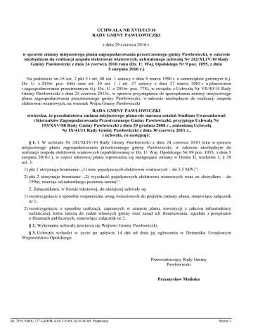 UCHWAŁA NR XVII/113/16 RADY GMINY PAWŁOWICZKI z dnia 29 czerwca 2016 r. w sprawie zmiany miejscowego planu zagospodarowania przestrzennego gminy Pawłowiczki, w zakresie niezbędnym do realizacji zespołu elektrowni wiatrowych, uchwalonego uchwałą Nr 242/XLIV/10 Rady Gminy Pawłowiczki z dnia 24 czerwca 2010 roku (Dz. U. Woj. Opolskiego Nr 9 poz. 1055, z dnia 5 sierpnia 2010 r.) Na podstawie art.18 ust. 2 pkt 5 i art. 40 ust. 1 ustawy z dnia 8 marca 1990 r. o samorządzie gminnym (t.j. Dz. U. z 2016r. poz. 446) oraz art. 20 ust. 1 i art. 27 ustawy z dnia 27 marca 2003 r o planowaniu i zagospodarowaniu przestrzennym (t.j. Dz. U. z 2016r. poz. 778), w związku z Uchwałą Nr VII/40/15 Rady Gminy Pawłowiczki z dnia 25 czerwca 2015r., w sprawie przystąpienia do sporządzania zmiany miejscowego planu zagospodarowania przestrzennego gminy Pawłowiczki, w zakresie niezbędnym do realizacji zespołu elektrowni wiatrowych, na wniosek Wójta Gminy Pawłowiczki RADA GMINY PAWŁOWICZKI stwierdza, że przedmiotowa zmiana miejscowego planu nie narusza ustaleń Studium Uwarunkowań i Kierunków Zagospodarowania Przestrzennego Gminy Pawłowiczki, przyjętego Uchwałą Nr 153/XXV/08 Rady Gminy Pawłowiczki z dnia 29 grudnia 2008 r., zmienioną Uchwałą Nr IX/41/11 Rady Gminy Pawłowiczki z dnia 30 czerwca 2011 r., i uchwala, co następuje: § 1. 1. W uchwale Nr 242/XLIV/10 Rady Gminy Pawłowiczki z dnia 24 czerwca 2010 roku w sprawie miejscowego planu zagospodarowania przestrzennego gminy Pawłowiczki, w zakresie niezbędnym do realizacji zespołu elektrowni wiatrowych (opublikowanej w Dz. U. Woj. Opolskiego Nr 89 poz. 1055, z dnia 5 sierpnia 2010 r.), w części tekstowej planu wprowadza się następujące zmiany w Dziale II, rozdziale 2, § 29 ust. 3: 1) pkt 1 otrzymuje brzmienie: „1) moc pojedynczych elektrowni wiatrowych – do 3,5 MW;”; 2) pkt 2 otrzymuje brzmienie: „2) wysokość pojedynczych elektrowni wiatrowych wraz ze skrzydłem – do 199m, mierząc od naturalnego poziomu terenu;”. 2. Załącznikami, w formie tekstowej, do niniejszej uchwały są: 1) rozstrzygnięcie o sposobie rozpatrzenia uwag wniesionych do projektu zmiany planu, stanowiące załącznik nr 1; 2) rozstrzygnięcie o sposobie realizacji, zapisanych w zmianie planu, inwestycji z zakresu infrastruktury technicznej, które należą do zadań własnych gminy oraz zasad ich finansowania, zgodnie z przepisami o finansach publicznych, stanowiące załącznik nr 2. § 2. Wykonanie uchwały powierza się Wójtowi Gminy Pawłowiczki. § 3. Uchwała wchodzi w życie po upływie 14 dni od dnia jej ogłoszenia w Dzienniku Urzędowym Województwa Opolskiego. Przewodniczący Rady Gminy Pawłowiczki Przemysław Malinka Id: 7F5C54BE-7273-4D5B-AAC3-F45CAC074C60. Podpisany Strona 1 Załącznik Nr 1 do Uchwały Nr XVII/113/16 RADY GMINY PAWŁOWICZKI z dnia 29 czerwca 2016 r. ROZSTRZYGNIĘCIE RADY GMINY PAWŁOWICZKI O SPOSOBIE ROZPATRZENIA UWAG, WNIESIONYCH DO PROJEKTU ZMIANY PLANU. Do projektu zmiany miejscowego planu zagospodarowania przestrzennego gminy Pawłowiczki, w zakresie niezbędnym do realizacji zespołu elektrowni wiatrowych, w trakcie wyłożenia do publicznego wglądu, nie zgłoszono żadnych uwag, nie zachodziła więc potrzeba ich rozpatrywania i podejmowania stosownych rozstrzygnięć. Id: 7F5C54BE-7273-4D5B-AAC3-F45CAC074C60. Podpisany Strona 1 Załącznik Nr 2 do Uchwały Nr XVII/113/16 RADY GMINY PAWŁOWICZKI z dnia 29 czerwca 2016 r. ROZSTRZYGNIĘCIE RADY GMINY PAWŁOWICZKI O SPOSOBIE REALIZACJI ZAPISANYCH W PLANIE INWESTYCJI Z ZAKRESU INFRASTRUKTURY TECHNICZNEJ, KTÓRE NALEŻĄ DO ZADAŃ WŁASNYCH GMINY ORAZ ZASAD ICH FINANSOWANIA, ZGODNIE Z PRZEPISAMI O FINANSACH PUBLICZNYCH. Zmiana miejscowego planu zagospodarowania przestrzennego gminy Pawłowiczki, w zakresie niezbędnym do realizacji zespołu elektrowni wiatrowych, nie ustala nowych inwestycji z zakresu infrastruktury technicznej, należących do zadań własnych gminy Pawłowiczki, w związku z powyższym, nie zachodziła więc potrzeba podejmowania stosownych rozstrzygnięć. Id: 7F5C54BE-7273-4D5B-AAC3-F45CAC074C60. Podpisany Strona 1 Uzasadnienie Na podstawie art. 20 ust.1 i art. 27 ustawy z dnia 27 marca 2003 roku o planowaniu i zagospodarowaniu przestrzennym (t.j. Dz. U. z 2016r. poz. 778) przedmiotem uchwalenia, przez Radę Gminy Pawłowiczki, jest projekt zmiany miejscowego planu zagospodarowania przestrzennego gminy Pawłowiczki w zakresie niezbędnym do realizacji zespołu elektrowni wiatrowych, uchwalony uchwałą Nr 242/XLIV/10 Rady Gminy Pawłowiczki z dnia 24 czerwca 2010 roku (opublikowaną w Dzienniku Urzędowym Województwa Opolskiego z dnia 5 sierpnia 2010 roku, Nr 89 poz. 1055), w trybie nowelizacji, zwany dalej projektem zmiany planu w trybie nowelizacji. Podstawą sporządzenia ww. projektu zmiany planu w trybie nowelizacji jest uchwała Nr VII/40/15 Rady Gminy Pawłowiczki z dnia 25 czerwca 2015r. w sprawie przystąpienia do sporządzenia zmiany miejscowego planu zagospodarowania przestrzennego gminy Pawłowiczki w zakresie niezbędnym do realizacji zespołu elektrowni wiatrowych. Zakres zmian nie narusza bytu uchwały dotychczasowej, ogranicza się do jej nowelizacji poprzez zmianę treści zawartych w § 29 ust. 3 pkt 1 i pkt 2 (dotyczących zasad zagospodarowania i zabudowy terenów rolniczych, oznaczonych symbolem Rw, na których możliwa jest lokalizacja elektrowni wiatrowych wraz ze skrzydłem) w zakresie: – zwiększenia mocy pojedynczych elektrowni wiatrowych do 3,5MW (zmiana treści ww. punktu 1), – zwiększenia wysokości pojedynczych elektrowni wiatrowych – do 199m, mierząc od naturalnego poziomu terenu (zmiana treści ww. punktu 2). Projekt zmiany planu w trybie nowelizacji został wykonany zgodnie z procedurą sporządzania planu, ustaloną przepisami art. 17 – 20, przy uwzględnieniu, odpowiednio do trybu nowelizacji, sposobu realizacji wymogów wynikających z art. 1 ust. 2 ÷ 4 ustawy z dnia 27 marca 2003r. o p