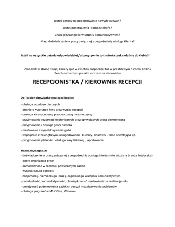 Jesteś gotowy na podejmowanie nowych wyzwań? Jesteś punktualny/a i samodzielny/a? Znasz język angielki w stopniu komunikatywnym? Masz doświadczenie w pracy związanej z bezpośrednią obsługą klienta? Jeżeli na wszystkie pytania odpowiedziałeś/aś pozytywnie to ta oferta czeka właśnie do Ciebie!!! Zrób krok w stronę swojej kariery i już w kwietniu rozpocznij staż w prestiżowym ośrodku Collins Beach nad samym polskim morzem na stanowisku RECEPCJONISTKA / KIEROWNIK RECEPCJI Do Twoich obowiązków należeć będzie: - obsługa urządzeń biurowych - dbanie o wizerunek firmy oraz wygląd recepcji - obsługa korespondencji przychodzącej i wychodzącej - przyjmowanie rezerwacji telefonicznych oraz spływających drogą elektroniczną - przyjmowanie i obsługa gości ośrodka - meldowanie i wymeldowywanie gości - współpraca z zewnętrznymi usługodawcami : kurierzy, dostawcy , firma sprzątająca itp. - przyjmowanie płatności , obsługa kasy fiskalnej , raportowanie Nasze wymagania: - doświadczenie w pracy związanej z bezpośrednią obsługą klienta (mile widziana branża hotelarska) - dobra organizacja pracy - samodzielność w realizacji powierzonych zadań - wysoka kultura osobista - znajomość j. niemieckiego oraz j. angielskiego w stopniu komunikatywnym - punktualność, komunikatywność, obowiązkowość, nastawienie na realizację celu - umiejętność podejmowania szybkich decyzji i rozwiązywania problemów - obsługa programów MS Office, Windows W zamian oferujemy: - umowę zlecenie/ o dzieło - pracę w prestiżowym ośrodku wypoczynkowym - zakwaterowanie wraz z wyżywieniem - możliwość odbycia płatnych praktyk - pracę od kwietnia do września (terminy do ustalenia) - pracę w dynamicznie rozwijającej się firmie - przyjazną atmosferę - system motywacyjny, dla najlepszych premie - interesującą pracę w młodym kreatywnym zespole