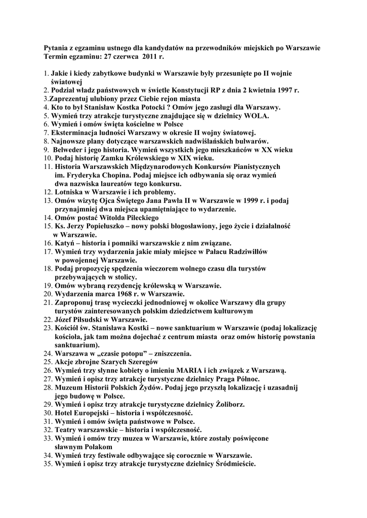 Pytania z egzaminu ustnego dla kandydatów na przewodników miejskich po Warszawie Termin egzaminu: 27 czerwca 2011 r. 1. Jakie i kiedy zabytkowe budynki w Warszawie były przesunięte po II wojnie światowej 2. Podział władz państwowych w świetle Konstytucji RP z dnia 2 kwietnia 1997 r. 3.Zaprezentuj ulubiony przez Ciebie rejon miasta 4. Kto to był Stanisław Kostka Potocki ? Omów jego zasługi dla Warszawy. 5. Wymień trzy atrakcje turystyczne znajdujące się w dzielnicy WOLA. 6. Wymień i omów święta kościelne w Polsce 7. Eksterminacja ludności Warszawy w okresie II wojny światowej. 8. Najnowsze plany dotyczące warszawskich nadwiślańskich bulwarów. 9. Belweder i jego historia. Wymień wszystkich jego mieszkańców w XX wieku 10. Podaj historię Zamku Królewskiego w XIX wieku. 11. Historia Warszawskich Międzynarodowych Konkursów Pianistycznych im. Fryderyka Chopina. Podaj miejsce ich odbywania się oraz wymień dwa nazwiska laureatów tego konkursu. 12. Lotniska w Warszawie i ich problemy. 13. Omów wizytę Ojca Świętego Jana Pawła II w Warszawie w 1999 r. i podaj przynajmniej dwa miejsca upamiętniające to wydarzenie. 14. Omów postać Witolda Pileckiego 15. Ks. Jerzy Popiełuszko – nowy polski błogosławiony, jego życie i działalność w Warszawie. 16. Katyń – historia i pomniki warszawskie z nim związane. 17. Wymień trzy wydarzenia jakie miały miejsce w Pałacu Radziwiłłów w powojennej Warszawie. 18. Podaj propozycję spędzenia wieczorem wolnego czasu dla turystów przebywających w stolicy. 19. Omów wybraną rezydencję królewską w Warszawie. 20. Wydarzenia marca 1968 r. w Warszawie. 21. Zaproponuj trasę wycieczki jednodniowej w okolice Warszawy dla grupy turystów zainteresowanych polskim dziedzictwem kulturowym 22. Józef Piłsudski w Warszawie. 23. Kościół św. Stanisława Kostki – nowe sanktuarium w Warszawie (podaj lokalizację kościoła, jak tam można dojechać z centrum miasta oraz omów historię powstania sanktuarium). 24. Warszawa w „czasie potopu” – zniszczenia. 25. Akcje zbrojne Szarych Szeregów 26. Wymień trzy słynne kobiety o imieniu MARIA i ich związek z Warszawą. 27. Wymień i opisz trzy atrakcje turystyczne dzielnicy Praga Północ. 28. Muzeum Historii Polskich Żydów. Podaj jego przyszłą lokalizację i uzasadnij jego budowę w Polsce. 29. Wymień i opisz trzy atrakcje turystyczne dzielnicy Żoliborz. 30. Hotel Europejski – historia i współczesność. 31. Wymień i omów święta państwowe w Polsce. 32. Teatry warszawskie – historia i współczesność. 33. Wymień i omów trzy muzea w Warszawie, które zostały poświęcone sławnym Polakom 34. Wymień trzy festiwale odbywające się corocznie w Warszawie. 35. Wymień i opisz trzy atrakcje turystyczne dzielnicy Śródmieście. 36. Podaj lokalizację trzech największych synagog w przedwojennej Warszawie i omów jedną z nich. 37. Co oznacza wpis na Listę Światowego Dziedzictwa Kulturowego i Przyrodniczego UNESCO. Podaj pięć obiektów w Polsce wpisanych na tą Listę. 38. Artystyczne uczelnie Warszawy, podaj ich lokalizację i omów historię powstania jednej z nich. 39. Katedra Św. Jana. 40. Wymień i podaj lokalizację trzech największych sal koncertowych w Warszawie. 41. Opisz turyście polskie tradycje Bożego Narodzenia. 42. Plac Konstytucji –jego historia i zabudowa. 43. Mosty Warszawy okresu międzywojennego XX wieku, podaj ich historię powstania. 44. Dlaczego Tadeusza Kościuszkę nazywamy „bohaterem dwóch narodów”. Wymień miejsca w Warszawie z nim związane. 45. Pomniki na terenie Parku Łazienkowskiego. 46. Wymień wszystkich polskich laureatów nagrody Nobla. 47. Wymień, podaj lokalizację i omów trzy pomniki w Warszawie związane z II wojną światową. 48. Salon Warszawy – Krakowskie Przedmieście. 49. Bajki i legendy warszawskie – opowiedz co najmniej dwie z nich. 50. Grób Nieznanego Żołnierza i jego okolice. 51. Opisz miejsca znajdujące sie w pobliżu Warszawy związane z Fryderykiem Chopinem. Jak można do nich dojechać korzystając z komunikacji podmiejskiej 52. Janusz Korczak, jego życie i miejsca z nim związane w Warszawie. 53. Wymień i uzasadnij wszystkie święta obchodzone w Polsce w miesiącu maju. 54. Maria Skłodowska- Curie i jej związki z Warszawą 55. Zabudowania Parlamentu Polskiego - historia i wydarzenia. 56. Wymień zasługi Stefana Starzyńskiego dla miasta i pomniki jemu poświęcone. 57. Krzysztof Kamil Baczyński – miejsca jego pamięci w Warszawie 58. Historia pomnika Ks. Józefa Poniatowskiego 59. Wymień trzy atrakcje turystyczne obywające się w sezonie letnim w stolicy. 60. Królikarnia – historia i dzień dzisiejszy 61. Opisz turyście polskie tradycje wielkanocne. 62. Omów zniszczenia Warszawy w czasie II wojny światowej. 63. Park im. Ignacego Jana Paderewskiego jego historia i pomniki znajdujące się w nim (wymień co najmniej trzy z nich) 64. Wyjaśnienie pojęć : kolegiata, bazylika oraz ich lokalizacja w Warszawie. 65. Gdzie można zaparkować autokar w okolicy Starego i Nowego Miasta. 66. Plac Teatralny w Warszawie. 67. Polskie Państwo Podziemne – struktury cywilne i wojskowe. 68. Spacer szlakiem pomników od Pałacu Staszica do Zamku Królewskiego. 69. Święci patroni Warszawy. 70. Wymień pomniki królów Polski w Warszawie oraz ich zasługi dla miasta. 71. Podaj najkrótszą trasę przejazdu od pomnika F. Chopina do cmentarza wojskowego na Powązkach 72. Warszawa – miasto sejmów. 73. Wymień pomniki sławnych pisarzy w Warszawie i ich związki ze stolicą. 74. Żydowska Organizacja Bojowa (ŻOB) – jej działalność w getcie warszawskim75. Krystyna Krahelska – omów jej związek z Warszawą i podaj miejsce jej grób.