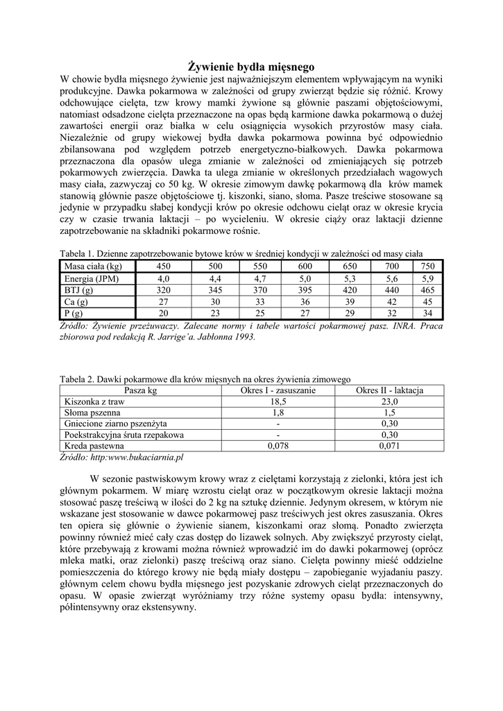Żywienie bydła mięsnego W chowie bydła mięsnego żywienie jest najważniejszym elementem wpływającym na wyniki produkcyjne. Dawka pokarmowa w zależności od grupy zwierząt będzie się różnić. Krowy odchowujące cielęta, tzw krowy mamki żywione są głównie paszami objętościowymi, natomiast odsadzone cielęta przeznaczone na opas będą karmione dawka pokarmową o dużej zawartości energii oraz białka w celu osiągnięcia wysokich przyrostów masy ciała. Niezależnie od grupy wiekowej bydła dawka pokarmowa powinna być odpowiednio zbilansowana pod względem potrzeb energetyczno-białkowych. Dawka pokarmowa przeznaczona dla opasów ulega zmianie w zależności od zmieniających się potrzeb pokarmowych zwierzęcia. Dawka ta ulega zmianie w określonych przedziałach wagowych masy ciała, zazwyczaj co 50 kg. W okresie zimowym dawkę pokarmową dla krów mamek stanowią głównie pasze objętościowe tj. kiszonki, siano, słoma. Pasze treściwe stosowane są jedynie w przypadku słabej kondycji krów po okresie odchowu cieląt oraz w okresie krycia czy w czasie trwania laktacji – po wycieleniu. W okresie ciąży oraz laktacji dzienne zapotrzebowanie na składniki pokarmowe rośnie. Tabela 1. Dzienne zapotrzebowanie bytowe krów w średniej kondycji w zależności od masy ciała Masa ciała (kg) 450 500 550 600 650 700 750 Energia (JPM) 4,0 4,4 4,7 5,0 5,3 5,6 5,9 BTJ (g) 320 345 370 395 420 440 465 Ca (g) 27 30 33 36 39 42 45 P (g) 20 23 25 27 29 32 34 Źródło: Żywienie przeżuwaczy. Zalecane normy i tabele wartości pokarmowej pasz. INRA. Praca zbiorowa pod redakcją R. Jarrige’a. Jabłonna 1993. Tabela 2. Dawki pokarmowe dla krów mięsnych na okres żywienia zimowego Pasza kg Okres I - zasuszanie Okres II - laktacja Kiszonka z traw 18,5 23,0 Słoma pszenna 1,8 1,5 Gniecione ziarno pszenżyta 0,30 Poekstrakcyjna śruta rzepakowa 0,30 Kreda pastewna 0,078 0,071 Źródło: http:www.bukaciarnia.pl W sezonie pastwiskowym krowy wraz z cielętami korzystają z zielonki, która jest ich głównym pokarmem. W miarę wzrostu cieląt oraz w początkowym okresie laktacji można stosować paszę treściwą w ilości do 2 kg na sztukę dziennie. Jedynym okresem, w którym nie wskazane jest stosowanie w dawce pokarmowej pasz treściwych jest okres zasuszania. Okres ten opiera się głównie o żywienie sianem, kiszonkami oraz słomą. Ponadto zwierzęta powinny również mieć cały czas dostęp do lizawek solnych. Aby zwiększyć przyrosty cieląt, które przebywają z krowami można również wprowadzić im do dawki pokarmowej (oprócz mleka matki, oraz zielonki) paszę treściwą oraz siano. Cielęta powinny mieść oddzielne pomieszczenia do którego krowy nie będą miały dostępu – zapobieganie wyjadaniu paszy. głównym celem chowu bydła mięsnego jest pozyskanie zdrowych cieląt przeznaczonych do opasu. W opasie zwierząt wyróżniamy trzy różne systemy opasu bydła: intensywny, półintensywny oraz ekstensywny. Opas intensywny Celem tego systemu jest uzyskanie najwyższej wagi w krótkim czasie. Podczas opasu intensywnego zwierzęta nie korzystają z wybiegów, cały czas przebywają zamknięte w budynkach inwentarskich. Dawka pokarmowa podczas opasu intensywnego opiera się głównie o pasze zawierające duże ilości energii oraz pasze treściwe. Zaleca się przeznaczać do opasu intensywnego młode, dobrze odchowane buhajki o masie około 120-150 kg. W żywieniu intensywnym opasów z pasz objętościowych stosuje się głównie kiszonkę z kukurydzy oraz w mniejszej ilości w celach dietetycznych siano. Pasze treściwe zazwyczaj stanowią udział w wysokości 50% suchej masy dawki pokarmowej, jednak w pierwszym okresie nie powinno się zadawać mniej jak 2kg paszy treściwej na sztukę. W tym systemie opasu dobowe przyrosty masy ciała są bardzo wysokie i powinny przekraczać 1000 g. Zwierzęta najczęściej opasa się do wagi 600 kg, którą powinny uzyskać w wieku około 15 miesięcy. Tusze młodych zwierząt żywione intensywnie charakteryzują się bardzo dobrym umięśnieniem i niskim stopniem otłuszczenia. Do wad tego systemu użytkowania bydła należy zaliczyć znaczny jego koszt, głównie spowodowany wysokimi cenami pasz treściwych. Opas półintensywny Najpopularniejszy sposób opasu w Polsce. Ma on charakter dwuetapowy i przeznaczony jest dla gospodarstw dysponującymi dużym areałem łąk i pastwisk. W systemie tym opas trwa do masy buhajków 550-670 kg i wieku około 20-24 miesięcy. W pierwszym etapie, młode półroczne zwierzęta utrzymywane są na pastwisku gdzie żywią się świeżą zielonką. Okres wypasu jest swego rodzaju okresem przygotowawczym do właściwego opasu., dzięki którem buhajki mają dobrze rozwinięty przewód pokarmowy przystosowany już do pobierania większych ilości paszy. Gdy kończy się sezon pastwiskowy, zwierzęta przenosi się do budynków gdzie rozpoczyna się drugi etap opasu półintensywnego. Etap tan charakteryzuje się typowymi zasadami dla opasu intensywnego. w tym momencie ma miejsce wykorzystanie tzw. kompensacji wzrostu. Zjawisko to ma miejsce gdy zastosujemy intensywne żywienie dla trochę niedożywionego bydła po sezonie pastwiskowym. Zjawisko to pozwala na uzyskanie przyrostów dziennych sięgających nawet 1500 g/dzień. Tusze pochodzące od zwierząt utrzymywanych w tym systemie charakteryzują się dobrym umięśnieniem oraz umiarkowanym otłuszczeniem. Opas ekstensywny Ekstensywny system opasu bydła bazuje na tanim, oszczędnym żywieniu, przede wszystkim pasz gospodarskich. Opas ten opiera się na dwóch sezonach pastwiskowych, więc polecany jest dla gospodarstw posiadających w swoim areale głównie niezbyt dobre użytki zielone. Przyrosty podczas tego opasu przekraczają 500-600 g/dobę. Po zakończeniu pierwszego okresu wypasu młode zwierzęta przenoszone są do budynków inwentarskich, gdzie żywione są głównie paszami objętościowymi, np. siano, kiszonki z traw. W drugi