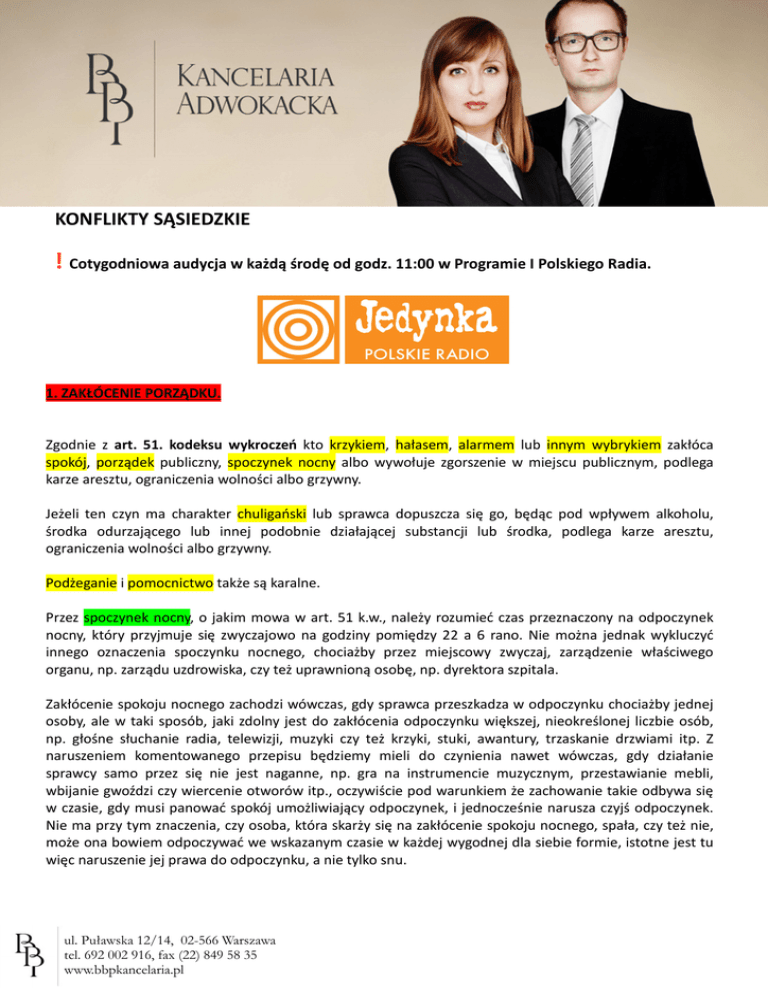 KONFLIKTY SĄSIEDZKIE ! Cotygodniowa audycja w każdą środę od godz. 11:00 w Programie I Polskiego Radia. 1. ZAKŁÓCENIE PORZĄDKU. Zgodnie z art. 51. kodeksu wykroczeń kto krzykiem, hałasem, alarmem lub innym wybrykiem zakłóca spokój, porządek publiczny, spoczynek nocny albo wywołuje zgorszenie w miejscu publicznym, podlega karze aresztu, ograniczenia wolności albo grzywny. Jeżeli ten czyn ma charakter chuligański lub sprawca dopuszcza się go, będąc pod wpływem alkoholu, środka odurzającego lub innej podobnie działającej substancji lub środka, podlega karze aresztu, ograniczenia wolności albo grzywny. Podżeganie i pomocnictwo także są karalne. Przez spoczynek nocny, o jakim mowa w art. 51 k.w., należy rozumieć czas przeznaczony na odpoczynek nocny, który przyjmuje się zwyczajowo na godziny pomiędzy 22 a 6 rano. Nie można jednak wykluczyć innego oznaczenia spoczynku nocnego, chociażby przez miejscowy zwyczaj, zarządzenie właściwego organu, np. zarządu uzdrowiska, czy też uprawnioną osobę, np. dyrektora szpitala. Zakłócenie spokoju nocnego zachodzi wówczas, gdy sprawca przeszkadza w odpoczynku chociażby jednej osoby, ale w taki sposób, jaki zdolny jest do zakłócenia odpoczynku większej, nieokreślonej liczbie osób, np. głośne słuchanie radia, telewizji, muzyki czy też krzyki, stuki, awantury, trzaskanie drzwiami itp. Z naruszeniem komentowanego przepisu będziemy mieli do czynienia nawet wówczas, gdy działanie sprawcy samo przez się nie jest naganne, np. gra na instrumencie muzycznym, przestawianie mebli, wbijanie gwoździ czy wiercenie otworów itp., oczywiście pod warunkiem że zachowanie takie odbywa się w czasie, gdy musi panować spokój umożliwiający odpoczynek, i jednocześnie narusza czyjś odpoczynek. Nie ma przy tym znaczenia, czy osoba, która skarży się na zakłócenie spokoju nocnego, spała, czy też nie, może ona bowiem odpoczywać we wskazanym czasie w każdej wygodnej dla siebie formie, istotne jest tu więc naruszenie jej prawa do odpoczynku, a nie tylko snu. ul. Puławska 12/14, 02-566 Warszawa tel. 692 002 916, fax (22) 849 58 35 www.bbpkancelaria.pl Strona 2 z 4 2. ZŁOŚLIWE NIEPOKOJENIE. Art. 107. kodeksu wykroczeń mówi z kolei, że kto w celu dokuczenia innej osobie złośliwie wprowadza ją w błąd lub w inny sposób złośliwie niepokoi, podlega karze ograniczenia wolności, grzywny do 1.500 złotych albo karze nagany. 3. SAMOPOMOC. W art. 343. kodeksu cywilnego przewidziano instytucję samopomocy. Zgodnie z nią posiadacz może zastosować obronę konieczną, ażeby odeprzeć samowolne naruszenie posiadania. Jeśli mamy do czynienia z posiadaczem nieruchomości, to może on niezwłocznie po samowolnym naruszeniu posiadania przywrócić własnym działaniem stan poprzedni; nie wolno mu jednak stosować przy tym przemocy względem osób. Posiadacz rzeczy ruchomej, jeżeli grozi mu niebezpieczeństwo niepowetowanej szkody, może natychmiast po samowolnym pozbawieniu go posiadania zastosować niezbędną samopomoc w celu przywrócenia stanu poprzedniego. "Posiadacz działający w obronie koniecznej może w razie potrzeby zaatakować osobę dokonującą zamachu i zastosować względem niej niezbędną przemoc, nawet jeżeli dobro chronione przez posiadacza przedstawia mniejszą wartość w porównaniu z dobrem zagrożonym zniszczeniem lub uszkodzeniem w obronie koniecznej." (wyrok SN z dnia 27 maja 1985 r., I CR 152/85.) 4. PRAWA SĄSIEDZKIE (art. 144-154 k.c.) IMMISJE Właściciel nieruchomości powinien przy wykonywaniu swego prawa powstrzymywać się od działań, które by zakłócały korzystanie z nieruchomości sąsiednich ponad przeciętną miarę, wynikającą ze społecznogospodarczego przeznaczenia nieruchomości i stosunków miejscowych. • Immisje dzieli się na bezpośrednie i pośrednie. Pierwsze z nich stanowią bezpośrednią ingerencję w sferę cudzej własności, na przykład sztuczne skierowanie na nieruchomość sąsiednią wód opadowych. Drugie natomiast pośrednio oddziałują na nieruchomość sąsiednią, na przykład na skutek wytwarzania hałasu, nieprzyjemnych zapachów itp. Właśnie immisji pośrednich dotyczy art. 144 k.c., zarówno tych, które oddziałują na sąsiednie nieruchomości przez przenikanie różnych substancji i energii (immisje pozytywne), jak i tych, które polegają na utrudnianiu przenikania, na przykład światła słonecznego, powietrza (immisje negatywne). • Wśród immisji pośrednich rozróżnia się też immisje materialne, gdy następuje przenikanie na nieruchomości sąsiednie cząstek materii (np. pyłów) lub pewnych sił (np. wstrząsów), oraz immisje niematerialne, które oddziałują na psychikę właściciela, w szczególności na jego poczucie bezpieczeństwa lub estetyki. • Jako przykłady immisji pośrednich można wskazać między innymi: - wytwarzanie pary, dymu, pyłów, spalin, zapachów, emitowanie nadmiernego hałasu, - utrudnianie odbioru programu telewizyjnego, - dopuszczenie przez zaniechanie właściciela nieruchomości do rozrostu drzew zmniejszającego nasłonecznienie na nieruchomości sąsiedniej, - immisje mogą stanowić już same przygotowania do zakłócenia korzystania z nieruchomości. • Oddziaływanie pośrednie na nieruchomości sąsiednie jest dopuszczalne, jeśli mieści się w granicach przeciętnej miary. Co do oceny przeciętnej miary w rozumieniu art. 144 k.c. wypowiedział się ul. Puławska 12/14, 02-566 Warszawa tel. 692 002 916, fax (22) 849 58 35 www.bbpkancelaria.p Strona 3 z 4 Sąd Najwyższy w wyroku z dnia 22 listopada 1985 r. (II CR 149/85, OSNCP 1986, nr 10, poz. 162), stwierdzając, że: "musi być ona dokonana na podstawie obiektywnych warunków, panujących w środowisku osób zamieszkujących na danym terenie, a nie na podstawie subiektywnych odczuć osób, których przestrzeń w miejscu zamieszkania w następstwie dalszego budowania budynku mieszkalnego uległaby ograniczeniu." •