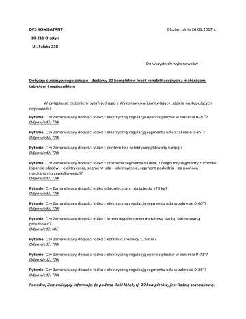 DPSKOMBATANT Olsztyn,dnia26.01.2017r. Dowszystkichwykonawców 10-211Olsztyn Ul.Fałata23K Dotyczy:sukcesywnegozakupuidostawy20kompletówłóżekrehabilitacyjnychzmateracem, tabletemiwysięgnikiem WzwiązkuzezłożeniempytańjednegozWykonawcówZamawiającyudzielanastępujących odpowiedzi: Pytanie:CzyZamawiającydopuściłóżkozelektrycznąregulacjaoparciaplecówwzakresie0-70o? Odpowiedź:TAK Pytanie:CzyZamawiającydopuściłóżkozelektrycznąregulacjąsegmentuudazzakresie0-35o? Odpowiedź:TAK Pytanie:CzyZamawiającydopuściłóżkozpilotembezselektywnejblokadyfunkcji? Odpowiedź:TAK Pytanie:CzyZamawiającydopuściłóżkozczteremasegmentamileża,zczegotrzysegmentyruchome (oparciepleców–elektrycznie,segmentuda–elektrycznie,segmentpodudzia–zapomocą mechanizmuzapadkowego)? Odpowiedź:TAK Pytanie:CzyZamawiającydopuściłóżkoobezpiecznymobciążeniu175kg? Odpowiedź:TAK Pytanie:CzyZamawiającydopuściłóżkozelektrycznąregulacjąsegmentuudawzakresie0-40o? Odpowiedź:TAK Pytanie:CzyZamawiającydopuściłóżkozleżemwypełnionymmetalowąsiatką,lakierowaną proszkowo? Odpowiedź:NIE Pytanie:CzyZamawiającydopuściłóżkozkołamiośrednicy125mm? Odpowiedź:TAK Pytanie:CzyZamawiającydopuściłóżkozelektrycznąregulacjąoparciaplecówwzakresie0-72o? Odpowiedź:TAK Pytanie:CzyZamawiającydopuściłóżkozelektrycznąregulacjąsegmentuudawzakresie0-36o? Odpowiedź:TAK Ponadto,Zamawiającyinformuje,żepodanailośćłóżek,tj.20kompletów,jestilościąszacunkową.