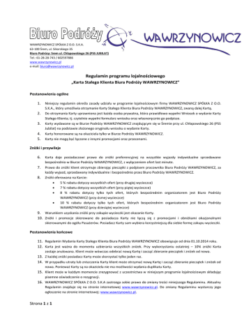 WAWRZYNOWICZ SPÓŁKA Z O.O. S.K.A. 63-100 Śrem, ul. Sikorskiego 35 Biuro Podrózy: Srem ul. Chlapowskiego 26 (PSS JUBILAT) Tel.: 61-28-28-743 / 602597886 www.wawrzynowicz.pl e-mail: [email protected] Regulamin programu lojalnościowego „Karta Stałego Klienta Biura Podróży WAWRZYNOWICZ” Postanowienia ogólne 1. Niniejszy regulamin określa zasady udziału w programie lojalnościowym firmy WAWRZYNOWICZ SPÓŁKA Z O.O. S.K.A., który umożliwia otrzymanie Karty Stałego Klienta Biura Podróży WAWRZYNOWICZ, zwaną dalej Kartą. 2. Do otrzymania Karty uprawniona jest każda osoba prywatna, która prawidłowo wypełni Wniosek o wydanie Karty Stałego Klienta; tj. czytelnie wypełni formularz wniosku oraz własnoręcznie go podpisze. 3. Karty wydawane są w Biurze Podróży WAWRZYNOWICZ znajdującym się w Śremie przy ul. Chłapowskiego 26 (PSS Jubilat) na podstawie złożonego oryginału wniosku o wydanie Karty. 4. 5. Karty honorowane są na okaziciela tylko w Biurze Podróży WAWRZYNOWICZ. Karty nie mogą być łączone z innymi promocjami oraz przecenami. Zniżki i przywileje 6. Karta daje posiadaczowi prawo do zniżki preferencyjnej na wszystkie wyjazdy indywidualne sprzedawane bezpośrednio w Biurze Podróży WAWRZYNOWICZ, z wyłączeniem ofert last minute. 7. Prawo do zniżki klient otrzymuje zbierając pieczątki z podpisem pracownika Biura Podróży WAWRZYNOWICZ, za każdy wyjazd, sprzedawany indywidualnie i bezpośrednio przez Biuro Podróży WAWRZYNOWICZ. 8. Zniżki oferowana na Karcie: 5 % rabatu dotyczy wszystkich ofert (przy drugiej wycieczce) 7 % rabatu dotyczy wszystkich ofert (przy piątej wycieczce) 8 % rabatu dotyczy tylko tych ofert, których bezpośrednim organizatorem jest Biuro Podróży WAWRZYNOWICZ (przy ósmej wycieczce) 10 % rabatu dotyczy tylko tych ofert, których bezpośrednim organizatorem jest Biuro Podróży WAWRZYNOWICZ (przy dziesiątej wycieczce) 9. Warunkiem uzyskania zniżki przy zakupie wycieczki jest okazanie Karty. 10. Zniżki i promocje skierowane do posiadacza Karty nie łączą się z promocjami i obniżkami okazjonalnymi skierowanymi do ogółu Pasażerów. Posiadacz Karty sam wybiera korzystniejszą dla siebie formę zakupu wycieczki. Postanowienia końcowe 11. Regulamin Wydania Karty Stałego Klienta Biura Podróży WAWRZYNOWICZ obowiązuje od dnia 01.10.2014 roku. 12. Karta jest ważna do momentu uzbierania wszystkich zniżek. Przy wykorzystaniu ostatniej – 10% zniżki Karta zostaje anulowana. Klient może wówczas odebrać nową Kartę i zacząć zbieranie pieczątek i zniżek od nowa. 13. Z każdej zniżki posiadacz Karty może skorzystać tylko jeden raz. 14. W przypadku utraty lub zniszczenia Karty klient może otrzymać nową Kartę i zacząć zbieranie pieczątek i zniżek od nowa. Ponieważ Karty są na okaziciela nie ma możliwości wydania duplikatu Karty. 15. Klient może w każdym momencie zrezygnować z uczestnictwa w niniejszym programie lojalnościowym składając pisemne oświadczenie o rezygnacji. 16. WAWRZYNOWICZ SPÓŁKA Z O.O. S.K.A zastrzega sobie prawo do zmiany treści niniejszego Regulaminu. Aktualny Regulamin znajduje się na stronie internetowej www.wawrzynowicz.pl. Do zmiany Regulaminu wystarczy jego ogłoszenie na stronie internetowej: www.wawrzynowicz.pl. Strona 1 z 1