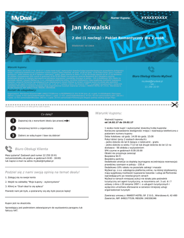 #XXXXXXXXX Jan Kowalski 2 dni (1 nocleg) - Pakiet Romantyczny dla 2 osób Wiadomość od ciebie Warunki kuponu: Ważność kuponu: od 14.02.17 do 19.02.17 1 osoba może kupić i wykorzystać dowolną liczbę kuponów Konieczne sprawdzenie dostępności miejsc i rezerwacja telefoniczna z podaniem numeru kuponu Doba hotelowa: od godz. 14.00 do godz. 15:00 Pobyt dzieci (przy 2 osobach dorosłych):- jedno dziecko do lat 6 (śpiące z rodzicami) - gratis- jedno dziecko w wieku 7-12 lat lub drugie dziecko do lat 12 na dostawce 90 zł/doba z wyżywieniem SPA czynne w godzinach 8.00-20.00 Obiekt nie przyjmuje zwierząt Bezpłatne Wi-Fi Bezpłatny parking Dodatkowe atrakcje za dopłatą (wymagana wcześniejsza rezerwacja): prawdziwy szampan w pokoju - 150 zł Dodatkowo 10% rabatu na pozostałe zabiegi i masaże MyDeal sp. z o.o. udostępnia platformę online, na której Użytkownicy mają wyjątkową możliwość kupowania towarów i usług od Partnerów (sprzedających) po rewelacyjnych cenach MyDeal w ramach niniejszej aukcji nie działa jako pośrednik turystyczny ani agent turystyczny, w rozumieniu art. 3 ust. 6 i 7 ustawy z dnia z 29 sierpnia 1997 r. o usługach turystycznych i wyłącznie umożliwia oferowanie w serwisie niniejszej usługi organizatorowi turystyki Zawierasz umowę z: INWEST-HOTEL SP. Z O.O., Wierzbowa 6, 42-400 Zawiercie, NIP: 6492177539, REGON: 240336346 Kontakt do usługodawcy: Organizatorul. Wierzbowa 6ZawiercieNIP: 6492177539Pomoc w REZERWACJI:22 201 93 84 (pon.-pt. w godz. 8-18)Odległości:Warszawa: 268 km / 3 godz. 4 min samochodemKraków: 69 km / 1 godz. 17 min. samochodemKatowice: 47 km / 43 min samochodemLublin: 285 km / 4 godz. 15 min samochodemWrocław: 246 km / 2 godz. 26 min samochodem*Orientacyjna długość podróży według Google Maps Wystarczy, że weźmiesz ze sobą górną część kuponu. Warunki kuponu: Co dalej? Zapoznaj się z warunkami dealu (po prawej ) Zarezerwuj termin u organizatora Zabierz ze sobą kupon i baw się dobrze! Biuro Obsługi Klienta Masz pytania? Zadzwoń pod numer 22 250 20 61 (od poniedziałku do piątku w godzinach 8:00 - 18:00) lub napisz e-mail na adres [email protected] Podziel się z nami swoją opinią na temat dealu! 1. Zaloguj się na swoje konto 2. Wejdź na zakładkę "Moje kupony - wykorzystane" 3. Kliknij w "Oceń deal to się opłaca" Powiedz nam jak było, a postaramy się aby było jeszcze lepiej! Ważność kuponu: od 14.02.17 do 19.02.17 1 osoba może kupić i wykorzystać dowolną liczbę kuponów Konieczne sprawdzenie dostępności miejsc i rezerwacja telefoniczna z podaniem numeru kuponu Doba hotelowa: od godz. 14.00 do godz. 15:00 Pobyt dzieci (przy 2 osobach dorosłych): - jedno dziecko do lat 6 (śpiące z rodzicami) - gratis - jedno dziecko w wieku 7-12 lat lub drugie dziecko do lat 12 na dostawce - 90 zł/doba z wyżywieniem SPA czynne w godzinach 8.00-20.00 Obiekt nie przyjmuje zwierząt Bezpłatne Wi-Fi Bezpłatny parking Dodatkowe atrakcje za dopłatą (wymagana wcześniejsza rezerwacja): prawdziwy szampan w pokoju - 150 zł Dodatkowo 10% rabatu na pozostałe zabiegi i masaże MyDeal sp. z o.o. udostępnia platformę online, na której Użytkownicy mają wyjątkową możliwość kupowania towarów i usług od Partnerów (sprzedających) po rewelacyjnych cenach MyDeal w ramach niniejszej aukcji nie działa jako pośrednik turystyczny ani agent turystyczny, w rozumieniu art. 3 ust. 6 i 7 ustawy z dnia z 29 sierpnia 1997 r. o usługach turystycznych i wyłącznie umożliwia oferowanie w serwisie niniejszej usługi organizatorowi turystyki Zawierasz umowę z: INWEST-HOTEL SP. Z O.O., Wierzbowa 6, 42-400 Zawiercie, NIP: 6492177539, REGON: 240336346 Kupon jest na okaziciela. Sprzedający jest podmiotem zobowiązanym do wystawienia paragonu lub faktury VAT.