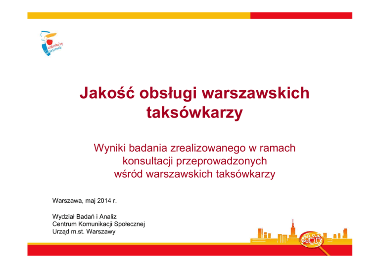 Jakość obsługi warszawskich taksówkarzy Wyniki badania zrealizowanego w ramach konsultacji przeprowadzonych wśród warszawskich taksówkarzy Warszawa, maj 2014 r. Wydział Badań i Analiz Centrum Komunikacji Społecznej Urząd m.st. Warszawy Informacje o badaniu Cel: Poznanie opinii warszawskich taksówkarzy na temat jakości obsługi w Urzędzie m.st. Warszawy oraz preferencji w zakresie lokalizacji miejsca obsługi licencjonowanych taksówkarzy. Technika: 1.Ankieta do samodzielnego wypełnienia dostępna w punkcie obsługi taksówkarzy w Biurze Administracji i Spraw Obywatelskich (Al. Jerozolimskie 28), 2.Ankieta online dostępna na stronie http://konsultacje.um.warszawa.pl, Facebooku, a także przesłana drogą mailową do warszawskich korporacji taksówkowych. Próba: W badaniu uczestniczyły osoby deklarujące, że pracują jako taksówkarz na podstawie licencji wydanej przez m.st. Warszawę. W trakcie badania zgromadzono 230 ankiet, przy czym 121 w punkcie obsługi taksówkarzy w Biurze Administracji i Spraw Obywatelskich oraz 109 drogą elektroniczną. Realizacja: 4-29 kwietnia 2014 r. Wykonawca: Centrum Komunikacji Społecznej 2 Główne wyniki i rekomendacje Bardzo dobra ocena jakości obsługi. Zdecydowana większość (87%) taksówkarzy, którzy wzięli udział w badaniu pozytywnie Negatywna ocena obecnej lokalizacji punktu obsługi. Nowa lokalizacja biura, w którym respondenci mogą załatwić sprawę związaną ze swoją Przyzwolenie na rozproszenie miejsca obsługi, ALE … należy zadbać, aby nowe zasady nie spowodowały chaosu. Większość badanych (60%) pozytywnie odniosła się do pomysłu, aby sprawy dotyczące ocenia jakość obsługi w trakcie załatwiania sprawy związanej z ich pracą zawodową. pracą u większości (64%) spotkała się z negatywnym nastawieniem. Jednym z powodów takiej oceny jest brak miejsc parkingowych. Taksówkarze zwracają uwagę na ten aspekt przy wyborze nowej lokalizacji. obsługi licencjonowanych taksówkarzy można było załatwić nie w jednej lokalizacji – jak dotychczas – lecz w kilku. Jednocześnie blisko 30% oceniło tę propozycję negatywnie – głównie ze względu na bałagan, jaki może z tego wyniknąć. Większość badanych (64%) pozytywnie oceniła pomysł, aby sprawy dotyczące obsługi licencjonowanych taksówkarzy można było załatwić w Urzędzie Dzielnicy Śródmieście, Żoliborz oraz Praga Północ. 1/4 natomiast uważa, że propozycja ta jest zła – podobnie jak w przypadku wcześniejszego pytania - głównie ze względu na bałagan, jaki może wyniknąć z nowych zasad. Rekomendacje Wprowadzając nowe zasady obsługi taksówkarzy należy zwrócić szczególną uwagę na kwestie podnoszone przez przeciwników tego pomysłu. Istotne jest, aby rozproszenie miejsca obsługi nie spowodowało chaosu, rozmycia odpowiedzialności oraz braku kompetencji ze strony urzędników. Ważne jest, aby w każdym punkcie obowiązywały takie same procedury i standardy. Wybierając lokalizacje należy kierować się dostępnością miejsc parkingowych oraz sprawnością obsługi. Czas obsługi nie może być dłuższy niż obecnie i na pewno nie można odsyłać interesantów „od okienka do okienka” z powodu braku dokumentów. Warto takie zapewnienia wykorzystać w kampanii informacyjnej przed wprowadzeniem nowych zasad. 3 Jakość obsługi taksówkarzy w Urzędzie m.st. Warszawy Jak, ogólnie rzecz biorąc, ocenia Pan(i) jakość obsługi w Urzędzie m.st. Warszawy w trakcie załatwiania Pana/Pani sprawy związanej z pracą taksówkarza? 87% pozytywnych ocen 8% negatywnych ocen 5% trudno powiedzieć N=221 4 Ocena obecnej lokalizacji Czy odpowiada Panu/Pani obecna lokalizacja biura (przy Al. Jerozolimskich 28), w którym może Pan(i) załatwić sprawy związane z pracą taksówkarza? 27% pozytywnych ocen 64% negatywnych ocen 9% trudno powiedzieć N=228 5 Ocena nowej propozycji – kilka lokalizacji Jak ocenia Pan(i) pomysł, aby sprawy dotyczące obsługi licencjonowanych taksówkarzy można było załatwiać nie w jednej lokalizacji – jak dotychczas – lecz w kilku? 60% pozytywnych ocen 28% negatywnych ocen 12% trudno powiedzieć N=219 6 Kilka lokalizacji – powody negatywnej opinii Dlaczego negatywnie ocenia Pan(i) pomysł, aby sprawy związane z obsługą licencjonowanych taksówkarzy można było załatwiać w kilku lokalizacjach? Analiza wypowiedzi respondentów Wielkość wyrazu jest proporcjonalna do liczby użytego wyrazu. Najczęściej respondenci wskazywali na jedno miejsce załatwienia sprawy. Zmiana spowoduje bałagan oraz stratę czasu. n=55 7 Kilka lokalizacji – powody negatywnej opinii (cytaty) Bałagan - nadmierna biurokracja. Będzie większy bałagan niż jest w wydawaniu licencji i powstanie jeszcze więcej "lewizny„. Bo będę latał z miejsca na miejsce a darmozjady będą kawkę popijać. Bo jest to rynek ogólnowarszawski, a nie dzielnicowy, na chwilę obecną jest sporo bałaganu, gdy się to rozbije na mniejsze grupy bałagan będzie dużo większy. Bo tak jak jest teraz jest dobrze - wszystko w jednym miejscu, nie ma odsyłania z miejsca na miejsce. Bo zawsze okaże się, że gdzieś czegoś nie ma i trzeba będzie jechać do innego punktu. Brak jednolitości w załatwieniu sprawy. Coraz więcej nowych osób do obsługi to i więcej różnych dziwnych interpretacji przepisów w/g „widzi mi się”. Czasochłonne byłoby to. Czy to pytanie rzeczywiście padło? Przecież powszechnie wiadomo, że łatwiej i szybciej załatwię sprawę w jednym, konkretnym miejscu, a nie w kilku. Dlatego że powinno się wszystko załatwiać w jednym miejscu a nie jeździć po całym mieście. Bardzo ważny jest duży parking, ponieważ taksówkarze przyjeżdżają swoimi samochodami i muszą mieć gdzie zaparkować. Doprowadzi to do dalszego niekontrolowanego wydawania licencji osobom, które nie powinny ich otrzymać. Dużo komplikacji przy załatwianiu spraw. Gdyż jak jest w jednej to i tak j