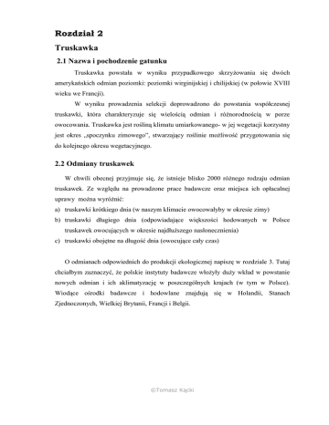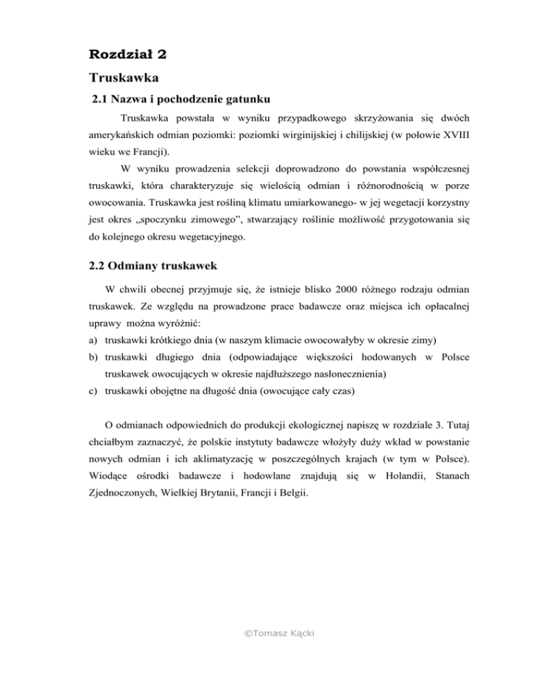 Rozdział 2 Truskawka 2.1 Nazwa i pochodzenie gatunku Truskawka powstała w wyniku przypadkowego skrzyżowania się dwóch amerykańskich odmian poziomki: poziomki wirginijskiej i chilijskiej (w połowie XVIII wieku we Francji). W wyniku prowadzenia selekcji doprowadzono do powstania współczesnej truskawki, która charakteryzuje się wielością odmian i różnorodnością w porze owocowania. Truskawka jest rośliną klimatu umiarkowanego- w jej wegetacji korzystny jest okres „spoczynku zimowego”, stwarzający roślinie możliwość przygotowania się do kolejnego okresu wegetacyjnego. 2.2 Odmiany truskawek W chwili obecnej przyjmuje się, że istnieje blisko 2000 różnego rodzaju odmian truskawek. Ze względu na prowadzone prace badawcze oraz miejsca ich opłacalnej uprawy można wyróżnić: a) truskawki krótkiego dnia (w naszym klimacie owocowałyby w okresie zimy) b) truskawki długiego dnia (odpowiadające większości hodowanych w Polsce truskawek owocujących w okresie najdłuższego nasłonecznienia) c) truskawki obojętne na długość dnia (owocujące cały czas) O odmianach odpowiednich do produkcji ekologicznej napiszę w rozdziale 3. Tutaj chciałbym zaznaczyć, że polskie instytuty badawcze włożyły duży wkład w powstanie nowych odmian i ich aklimatyzację w poszczególnych krajach (w tym w Polsce). Wiodące ośrodki badawcze i hodowlane znajdują się w Holandii, Stanach Zjednoczonych, Wielkiej Brytanii, Francji i Belgii. ©Tomasz Kącki 2.3 Produkcja truskawek Głównym rejonem produkcji truskawek są kraje półkuli północnej. 40 % produkcji przypada na Europę (wg produkcji: Hiszpania, Polska, Włochy i inne), 30 % Ameryka Północna i Środkowa (największy producent światowy Stany Zjednoczone), następnie Azja (Japonia, Korea Południowa a od 2003 r. w coraz większym stopniu Chiny) – ok. 18 %. Światowa produkcja jest w miarę stabilna i wynosi ok. 3 mln ton rocznie. Zmienia się jednak geografia tej produkcji, wynikająca głównie z wysokich kosztów produkcji owoców (trudności z mechanizacją zbioru). Znaczącymi producentami stają się takie kraje jak: Maroko, Algieria, Rosja, Turcja, Meksyk oraz w tej chwili najważniejszy gracz na światowych rynkach - Chiny. W większości krajów dominująca staje się produkcja odmian deserowych, prowadzona w formie sterowanej produkcji (sadzonki frigo, odmiany powtarzające czy owocujące cały czas, produkcja przyspieszana). W zasadzie świeże owoce są dostępne na wielu rynkach praktycznie cały rok. Polska nadal pozostaje światowym liderem w produkcji truskawek, zwłaszcza przemysłowych. W 2002 r. jej uprawy zajmowały ok. 40 tys ha i truskawka stanowiła ok. 5 % całej produkcji owoców w Polsce. Rok 2004 (wejście do UE) a zwłaszcza 2005 (duże zbiory, konkurencja mrożonek z Chin, zmiany w produkcji w Niemczech) wpływają na coraz większe zainteresowanie produkcją truskawki deserowej przeznaczonej również w coraz większym stopniu na eksport. Wielu producentów wykorzystując fundusze krajowe i unijne inwestuje w nowoczesne metody uprawy, chłodnie, systemy pakowania, przechowywania i transportu truskawek, maszyny do produkcji. Na terenie Polski otwierają swoje filie światowi liderzy w produkcji sadzonek truskawek – eksportując je w znacznej mierze za granicę. I nadal naszym atutem pozostaje specyficzny klimat, powodujący, że truskawki są bardziej smaczne niż z innych krajów oraz jeszcze w miarę tania siła robocza, potrzebna do pracochłonnego zbioru. Powstaje coraz więcej gospodarstw dużych, specjalizujących się w produkcji truskawki i osiągających znacznie większą wydajność w produkcji (pow. 10 ton z ha – do 25) niż wynikałoby to z prowadzonych statystycznych danych (ok. 4 ton/ha). ©Tomasz Kącki