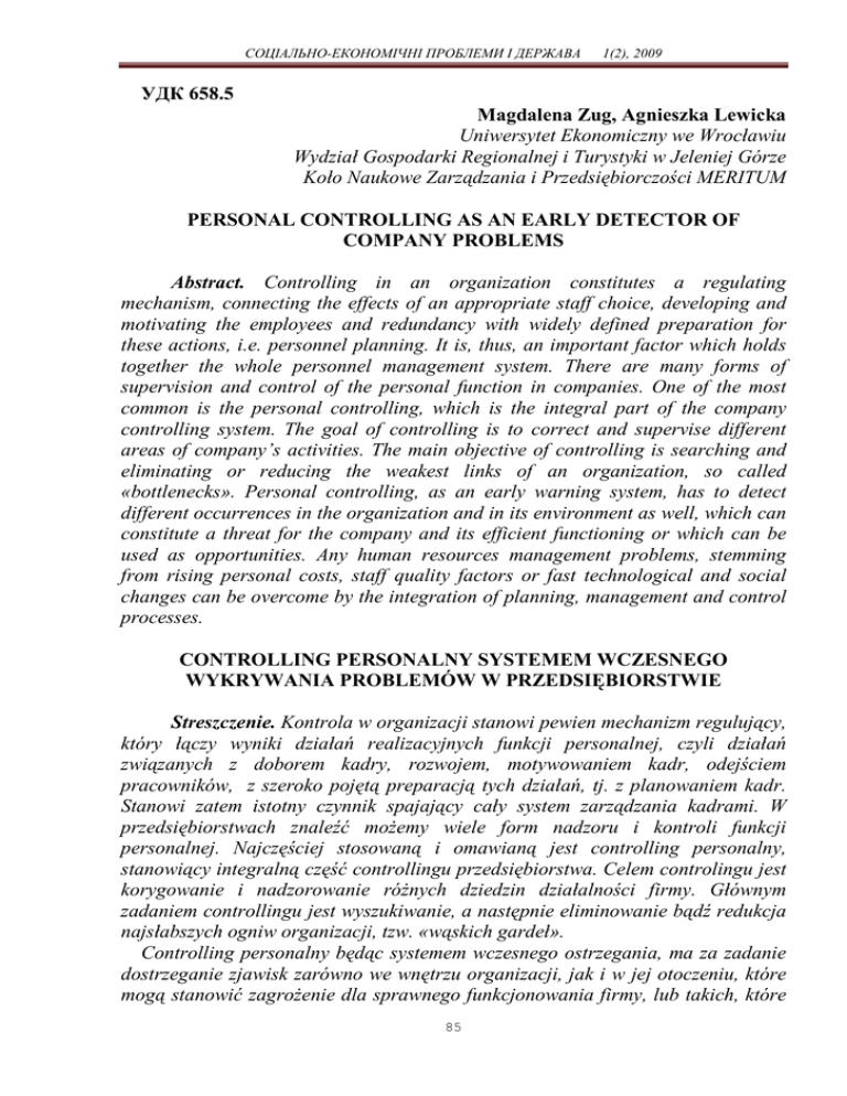 СОЦІАЛЬНО-ЕКОНОМІЧНІ ПРОБЛЕМИ І ДЕРЖАВА 1(2), 2009 УДК 658.5 Magdalena Zug, Agnieszka Lewicka Uniwersytet Ekonomiczny we Wrocławiu Wydział Gospodarki Regionalnej i Turystyki w Jeleniej Górze Koło Naukowe Zarządzania i Przedsiębiorczości MERITUM PERSONAL CONTROLLING AS AN EARLY DETECTOR OF COMPANY PROBLEMS Abstract. Controlling in an organization constitutes a regulating mechanism, connecting the effects of an appropriate staff choice, developing and motivating the employees and redundancy with widely defined preparation for these actions, i.e. personnel planning. It is, thus, an important factor which holds together the whole personnel management system. There are many forms of supervision and control of the personal function in companies. One of the most common is the personal controlling, which is the integral part of the company controlling system. The goal of controlling is to correct and supervise different areas of company’s activities. The main objective of controlling is searching and eliminating or reducing the weakest links of an organization, so called «bottlenecks». Personal controlling, as an early warning system, has to detect different occurrences in the organization and in its environment as well, which can constitute a threat for the company and its efficient functioning or which can be used as opportunities. Any human resources management problems, stemming from rising personal costs, staff quality factors or fast technological and social changes can be overcome by the integration of planning, management and control processes. CONTROLLING PERSONALNY SYSTEMEM WCZESNEGO WYKRYWANIA PROBLEMÓW W PRZEDSIĘBIORSTWIE Streszczenie. Kontrola w organizacji stanowi pewien mechanizm regulujący, który łączy wyniki działań realizacyjnych funkcji personalnej, czyli działań związanych z doborem kadry, rozwojem, motywowaniem kadr, odejściem pracowników, z szeroko pojętą preparacją tych działań, tj. z planowaniem kadr. Stanowi zatem istotny czynnik spajający cały system zarządzania kadrami. W przedsiębiorstwach znaleźć moŜemy wiele form nadzoru i kontroli funkcji personalnej. Najczęściej stosowaną i omawianą jest controlling personalny, stanowiący integralną część controllingu przedsiębiorstwa. Celem controlingu jest korygowanie i nadzorowanie róŜnych dziedzin działalności firmy. Głównym zadaniem controllingu jest wyszukiwanie, a następnie eliminowanie bądź redukcja najsłabszych ogniw organizacji, tzw. «wąskich gardeł». Controlling personalny będąc systemem wczesnego ostrzegania, ma za zadanie dostrzeganie zjawisk zarówno we wnętrzu organizacji, jak i w jej otoczeniu, które mogą stanowić zagroŜenie dla sprawnego funkcjonowania firmy, lub takich, które 85 СОЦІАЛЬНО-ЕКОНОМІЧНІ ПРОБЛЕМИ І ДЕРЖАВА 1(2), 2009 niosą za sobą szanse do wykorzystania. Poprzez integrację procesów planowania, sterowania i kontroli moŜe pomóc przezwycięŜyć problemy w zakresie zarządzania zasobami ludzkimi wynikające między innymi z rosnących kosztów osobowych, szybkich zmian technologicznych, społecznych i gospodarczych, czy ilościowych i jakościowych uwarunkowań doboru i wykorzystania kadr. Słowa klucze: controlling, controlling personalny, zarządzanie zasobami ludzkimi Wprowadzenie. W literaturze moŜna odnaleźć wiele róŜnych wskazówek dotyczących sprawnego zarządzania personelem. Bez względu jednak na definicje i autorów, zawsze podkreślana jest konieczność kontroli, jako niezbędnego elementu sprawującego nadzór nad osiąganymi wynikami oraz załoŜonymi celami i strategią. Kontrola w organizacji stanowi pewien mechanizm regulujący, który łączy wyniki działań realizacyjnych funkcji personalnej, czyli działań związanych z doborem kadry, rozwojem, motywowaniem kadr, odejściem pracowników, z szeroko pojętą preparacją tych działań, tj. z planowaniem kadr. Stanowi zatem istotny czynnik spajający cały system zarządzania kadrami1. Kontrolę moŜemy spotkać na kaŜdym poziomie struktury organizacyjnej przedsiębiorstwa. Bez względu na hierarchię, nadrzędność, czy podrzędność stanowisk, kontrola jest wszechobecna. Celem naczelnym procesu kontroli jest podejmowanie działań przez kierownictwo organizacji, dąŜących do regulowania i korygowania wszelkich czynności dla zapewnienia ich przyszłej sprawności i skuteczności2. Znaczenie kontroli funkcji personalnej. Inaczej mówiąc, kontrola ma za zadanie dostarczyć, podmiotom odpowiedzialnym za organizację i kierowanie funkcją personalną, odpowiednich narzędzi słuŜących ocenie i sprawdzeniu, w jakim stopniu stan funkcji personalnej zgadza się ze stanem zamierzonym oraz wskazaniu ewentualnych obszarów, w których zdiagnozowano odchylenia. W procesie kontroli funkcji personalnej wyróŜnić moŜna cztery etapy: 1) ustalenie norm kadrowych, wzorców, standardów, celów i metod pomiaru efektywności. Normy kadrowe są to kryteria, przez porównanie z którymi moŜna mierzyć aktualne wyniki, a które wywodzą się z celów ustalanych podczas planowania kadr. Normy takie muszą być czytelne, jasne, zrozumiałe i akceptowalne przez wszystkich, których dotyczą. Standardy kontroli moŜna ustalać poprzez odwołanie się do własnego doświadczenia, oparcie się na danych statystycznych lub historycznych oraz poprzez analizę informacji zaczerpniętych z przedsiębiorstwa lub jego otoczenia3. 2) ustalenie rzeczywistego stanu działania (pomiar efektywności), tj. ocena aktualnych wyników funkcji personalnej – to faza mierzenia wyników doboru 1 Stanisław Kowalczyk, Kontrola funkcji personalnej, w: T Listwan (red.), Zarządzanie kadrami, Warszawa 2004, s. 226. 2 Piotr Szczepanowski, Kontrola i Controlling, w: A.K. Koźmiński, W. Piotrowski, Zarządzanie. Teoria i praktyka, Warszawa 1996, s. 235. 3 Piotr Szczepanowski,…, s. 245. 86 СОЦІАЛЬНО-ЕКОНО
