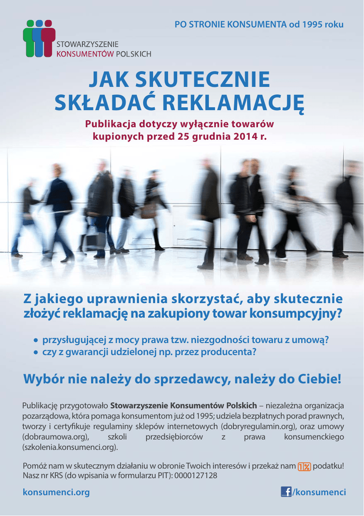 PO STRONIE KONSUMENTA od 1995 roku JAK SKUTECZNIE SKŁADAĆ REKLAMACJĘ Publikacja dotyczy wyłącznie towarów kupionych przed 25 grudnia 2014 r. Z jakiego uprawnienia skorzystać, aby skutecznie złożyć reklamację na zakupiony towar konsumpcyjny? przysługującej z mocy prawa tzw. niezgodności towaru z umową? czy z gwarancji udzielonej np. przez producenta? Wybór nie należy do sprzedawcy, należy do Ciebie! Publikację przygotowało Stowarzyszenie Konsumentów Polskich – niezależna organizacja pozarządowa, która pomaga konsumentom już od 1995; udziela bezpłatnych porad prawnych, tworzy i certyfikuje regulaminy sklepów internetowych (dobryregulamin.org), oraz umowy (dobraumowa.org), szkoli przedsiębiorców z prawa konsumenckiego (szkolenia.konsumenci.org). Pomóż nam w skutecznym działaniu w obronie Twoich interesów i przekaż nam Nasz nr KRS (do wpisania w formularzu PIT): 0000127128 konsumenci.org podatku! /konsumenci NIEZGODNOŚĆ Z UMOWĄ GWA R A N C J A Za zgodność towaru konsumpcyjnego z umową odpowiada wobec kupującego sprzedawca. Konsument może, ale nie musi korzystać z gwarancji, jeśli uzna, że lepiej jest skorzystać z uprawnień z tytułu niezgodności towaru z umową – wtedy może złożyć reklamację do sprzedawcy, a nie do gwaranta. Sprzedawca odpowiada także za informacje, których udziela konsumentowi. Sprzedawcę należy zawiadomić o niezgodności towaru z umową w terminie 2 miesięcy od jej zauważenia. Gwarancja nie wyłącza, nie ogranicza, ani nie zawiesza uprawnień kupującego wynikających z niezgodności towaru z umową. Kiedy ma zastosowanie? Zawsze po zawarciu umowy sprzedaży konsumenckiej, obowiązuje z mocy prawa. Jeśli zostanie udzielona przez gwaranta (producenta, importera, sprzedawcę). Nie ma obowiązku udzielania gwarancji, gwarancja to dobrowolne, dodatkowe oświadczenie woli gwaranta. Do kogo należy złożyć reklamację? Do sprzedawcy, czyli do przedsiębiorcy, od którego zakupiono towar konsumpcyjny. Nie ma znaczenia natomiast osoba sprzedawcy. Do przyjęcia reklamacji nie jest potrzebny właściciel ani kierownik sklepu - każda osoba pracująca w sklepie jest w tym przypadku „sprzedawcą”. W miejsce wskazane w gwarancji. Może to być punkt serwisowy albo sprzedawca, albo producent – to zależy od gwaranta i musi być określone w warunkach gwarancji. W jakim terminie od daty zakupu można składać reklamację? Można to zrobić w ciągu dwóch lat (24 miesięcy) od daty wydania towaru. Termin powinien być określony w gwarancji, nie ma jednego obowiązującego wszystkich terminu trwania gwarancji. Jeśli termin ten jest krótszy niż dwa lata - warto się zastanowić, czy warunki gwarancji są dla konsumenta korzystne. NIEZGODNOŚĆ Z UMOWĄ GWA R A N C J A W jakim terminie od ujawnienia się niezgodności z umową można składać reklamację? Konsument musi powiadomić sprzedawcę o stwierdzeniu niezgodności towaru z umową w ciągu dwóch miesięcy od stwierdzenia niezgodności - jeśli nie zrobi tego w ciągu dwóch miesięcy traci uprawnienia do reklamowania. Nie ma żadnych ogólnych zasad - termin może być ewentualnie określony w gwarancji. Z jakich przyczyn konsument ma prawo złożyć reklamację? Przyczyna ogólna to niezgodność towaru z umową, co może wynikać z następujących powodów: towar nie nadaje się do celu, do jakiego tego rodzaju towar jest zwykle używany, właściwości towaru nie odpowiadają właściwościom cechującym towar tego rodzaju, towar nie odpowiada oczekiwaniom dotyczącym tego rodzaju towaru, które wynikają z zapewnień sprzedawcy lub producenta (np. w reklamie), Przyczyny te są podane w gwarancji, zwykle jest to popsucie się sprzętu; zwykle też gwarant określa, jakich usterek nie obejmuje gwarancja. Należy sprawdzić, czy gwarant faktycznie za coś odpowiada, czy być może wymieniając uszkodzenia i usterki, które nie są objęte gwarancją, chce przekonać konsumenta, że nie powinien w ogóle składać reklamacji. towar został nieprawidłowo zamontowany lub uruchomiony przez sprzedawcę albo przez kupującego, jeśli ten ostatni postępował zgodnie z instrukcją otrzymaną przy sprzedaży. W jakim terminie konsument ma być poinformowany o tym, czy jego reklamacja została uznana? Niezwłocznie! Jeśli sprzedawca nie ustosunkuje się do żądania konsumenta nieodpłatnej naprawy albo wymiany towaru na nowy wyrażonego podczas składania reklamacji w ciągu 14 dni - uważa się, że reklamacja została uznana. Ustosunkowanie się sprzedawcy do reklamacji oznacza dostarczenie (wysłanie) na adres podany przez konsumenta pisemnej odpowiedzi – konsument nie musi chodzić do sklepu, żeby się dowiedzieć, jak została rozpatrzona jego reklamacja. Termin powinien być określony w gwarancji. Jeśli termin ten jest dłuższy niż 14 dni - warto się zastanowić, czy warunki gwarancji są dla konsumenta korzystne. NIEZGODNOŚĆ Z UMOWĄ GWA R A N C J A Czego może żądać konsument? Konsument może żądać doprowadzenia towaru do stanu zgodnego z umową poprzez: nieodpłatną naprawę lub wymianę na nowy, chyba że naprawa albo wymiana są niemożliwe lub wymagają nadmiernych kosztów, np. narażają konsumenta na duże niedogodności, bierze się także pod uwagę okoliczność, czy sprzedawca zdoła uczynić zadość żądaniu w odpowiednim czasie. W takiej sytuacji konsument ma prawo żądać: Możliwości określone są w gwarancji, zwykle jest to bezpłatna naprawa w wyznaczonym punkcie serwisowym. Jeśli gwarant nie określa po ilu naprawach konsument będzie mógł wymienić towar na nowy - warto się zastanowić, czy warunki gwarancji są dla konsumenta korzystne. obniżenia ceny lub zwrotu pieniędzy (odstąpienia od umowy). PAMIĘTAJ: Konsument nie może odstąpić od umowy, jeśli niezgodność towaru z umową jest NIEISTOTNA. W jakiej formie należy składać reklamację? Najbezpieczniej jest złożyć reklamację na piśmie, wyr