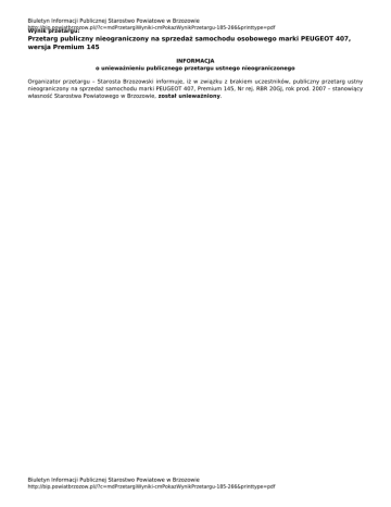Biuletyn Informacji Publicznej Starostwo Powiatowe w Brzozowie http://bip.powiatbrzozow.pl//?c=mdPrzetargiWyniki-cmPokazWynikPrzetargu-185-266&printtype=pdf Wynik przetargu: Przetarg publiczny nieograniczony na sprzedaż samochodu osobowego marki PEUGEOT 407, wersja Premium 145 INFORMACJA o unieważnieniu publicznego przetargu ustnego nieograniczonego Organizator przetargu – Starosta Brzozowski informuje, iż w związku z brakiem uczestników, publiczny przetarg ustny nieograniczony na sprzedaż samochodu marki PEUGEOT 407, Premium 145, Nr rej. RBR 20GJ, rok prod. 2007 – stanowiący własność Starostwa Powiatowego w Brzozowie, został unieważniony. Biuletyn Informacji Publicznej Starostwo Powiatowe w Brzozowie http://bip.powiatbrzozow.pl//?c=mdPrzetargiWyniki-cmPokazWynikPrzetargu-185-266&printtype=pdf