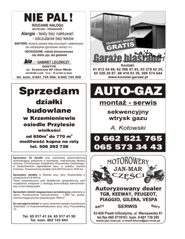 NIE PAL ! RZUCANIE NA£OGU SKUTECZNE ! SPRAWDZONE ! Alergie - testy bez nak³uwañ - odczulanie bez leków BAKTERIE: leczenie zaka¿eñ dróg moczowych i oddechowych bez antybiotyków (gronkowiec z³ocisty i in.) ODCHUDZANIE: metoda biorezonansowa - bez efektu jojo, bez g³odówek GABINET LECZNICZY GOSTYÑ ul. Graniczna 6F (Gos-Med) poniedzia³ki w godz. 10.oo - 20.oo tylko na zapisy tel. kom. 0-601 744 956, 0-602 744 956 Kontakt: 61 812 54 69, 62 586 07 83, 63 278 62 25, 65 526 20 87, 68 419 03 39, 509 574 644 www.konstal-garaze.pl Sprzedam dzia³ki budowlane w Krzemieniewie osiedle Przylesie wielkoœci 2 2 od 650m do 770 m mo¿liwoœæ kupna na raty tel. 508 292 728 Sprzedam 22 dzia³ki pod zabudowê jednorodzinn¹ wolnostoj¹c¹, po³o¿one w spokojnej, malowniczej okolicy obszaru Chronionego Krajobrazu Krzywiñsko-Osieckiego, w bezpoœrednim s¹siedztwie lasu, w pobli¿u Jeziora Cichowo. Powierzchnia dzia³ek od 0,0910 ha do 0,1645 ha. Sprzedam dzia³kê w Œremie przy ulicy Gostyñskiej o powierzchni 0,8164 ha. Teren przeznaczony pod dzia³alnoœæ gospodarcz¹, pod urz¹dzenia zwi¹zane z obs³ug¹ komunikacji samochodowej, w tym stacjê paliw. Sprzedam obiekt magazynowo-produkcyjny po³o¿ony w Jerce. Powierzchnia nieruchomoœci - 1,585 ha, powierzchnia magazynowo-produkcyjna 1800 m2. Do wynajêcia lokale w nowo otwartym pasa¿u handlowym „Eldorado” w Koœcianie/Kie³czewo przy ulicy Poznañskiej 13. Tel. 65 517 41 24, 65 517 41 50 Tel. kom. 662 143 843 JAN-MAR Autoryzowany dealer TGB, KEEWAY, PEUGEOT, PIAGGIO, GILERA, VESPA RATY SERWIS RAT Y 63-820 Piaski k/Gostynia, ul. Warszawska 61 tel./fax 065 5719161, kom. 0-601 739 295 www.jan-mar.pl, e-mail:[email protected]