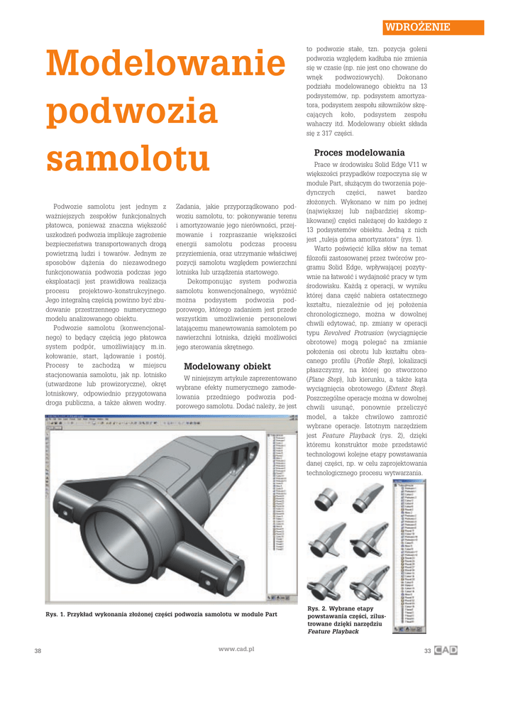 WDRO¯ENIE Modelowanie podwozia samolotu Podwozie samolotu jest jednym z wa¿niejszych zespo³ów funkcjonalnych p³atowca, poniewa¿ znaczna wiêkszoæ uszkodzeñ podwozia implikuje zagro¿enie bezpieczeñstwa transportowanych drog¹ powietrzn¹ ludzi i towarów. Jednym ze sposobów d¹¿enia do niezawodnego funkcjonowania podwozia podczas jego eksploatacji jest prawid³owa realizacja procesu projektowo-konstrukcyjnego. Jego integraln¹ czêci¹ powinno byæ zbudowanie przestrzennego numerycznego modelu analizowanego obiektu. Podwozie samolotu (konwencjonalnego) to bêd¹cy czêci¹ jego p³atowca system podpór, umo¿liwiaj¹cy m.in. ko³owanie, start, l¹dowanie i postój. Procesy te zachodz¹ w miejscu stacjonowania samolotu, jak np. lotnisko (utwardzone lub prowizoryczne), okrêt lotniskowy, odpowiednio przygotowana droga publiczna, a tak¿e akwen wodny. Zadania, jakie przyporz¹dkowano podwoziu samolotu, to: pokonywanie terenu i amortyzowanie jego nierównoci, przejmowanie i rozpraszanie wiêkszoci energii samolotu podczas procesu przyziemienia, oraz utrzymanie w³aciwej pozycji samolotu wzglêdem powierzchni lotniska lub urz¹dzenia startowego. Dekomponuj¹c system podwozia samolotu konwencjonalnego, wyró¿niæ mo¿na podsystem podwozia podporowego, którego zadaniem jest przede wszystkim umo¿liwienie personelowi lataj¹cemu manewrowania samolotem po nawierzchni lotniska, dziêki mo¿liwoci jego sterowania skrêtnego. Modelowany obiekt W niniejszym artykule zaprezentowano wybrane efekty numerycznego zamodelowania przedniego podwozia podporowego samolotu. Dodaæ nale¿y, ¿e jest Rys. 1. Przyk³ad wykonania z³o¿onej czêci podwozia samolotu w module Part 38 www.cad.pl to podwozie sta³e, tzn. pozycja goleni podwozia wzglêdem kad³uba nie zmienia siê w czasie (np. nie jest ono chowane do wnêk podwoziowych). Dokonano podzia³u modelowanego obiektu na 13 podsystemów, np. podsystem amortyzatora, podsystem zespo³u si³owników skrêcaj¹cych ko³o, podsystem zespo³u wahaczy itd. Modelowany obiekt sk³ada siê z 317 czêci. Proces modelowania Prace w rodowisku Solid Edge V11 w wiêkszoci przypadków rozpoczyna siê w module Part, s³u¿¹cym do tworzenia pojedynczych czêci, nawet bardzo z³o¿onych. Wykonano w nim po jednej (najwiêkszej lub najbardziej skomplikowanej) czêci nale¿¹cej do ka¿dego z 13 podsystemów obiektu. Jedn¹ z nich jest tuleja górna amortyzatora (rys. 1). Warto powiêciæ kilka s³ów na temat filozofii zastosowanej przez twórców programu Solid Edge, wp³ywaj¹cej pozytywnie na ³atwoæ i wydajnoæ pracy w tym rodowisku. Ka¿d¹ z operacji, w wyniku której dana czêæ nabiera ostatecznego kszta³tu, niezale¿nie od jej po³o¿enia chronologicznego, mo¿na w dowolnej chwili edytowaæ, np. zmiany w operacji typu Revolved Protrusion (wyci¹gniêcie obrotowe) mog¹ polegaæ na zmianie po³o¿enia osi obrotu lub kszta³tu obracanego profilu (Profile Step), lokalizacji p³aszczyzny, na której go stworzono (Plane Step), lub kierunku, a tak¿e k¹ta wyci¹gniêcia obrotowego (Extent Step). Poszczególne operacje mo¿na w dowolnej chwili usun¹æ, ponownie przeliczyæ model, a tak¿e chwilowo zamroziæ wybrane operacje. Istotnym narzêdziem jest Feature Playback (rys. 2), dziêki któremu konstruktor mo¿e przedstawiæ technologowi kolejne etapy powstawania danej czêci, np. w celu zaprojektowania technologicznego procesu wytwarzania. Rys. 2. Wybrane etapy powstawania czêci, zilustrowane dziêki narzêdziu Feature Playback 33 WDRO¯ENIE Rys. 3. Umowne wizualizacje z³o¿onych technologiczne czêci mo¿liwe s¹ dziêki zastosowaniu polecenia Part Painter. Rys. 4. Feature Library narzêdzie umo¿liwiaj¹ce szybkie zapo¿yczanie wybranych operacji technologicznych pomiêdzy podobnymi czêciami. Na sasiedniej stronie - okno dialogowe sterujace zmianami. Polecenie Part Painter (rys. 3) s³u¿yæ mo¿e przyporz¹dkowaniu okrelonych kolorów do wybranych p³aszczyzn, umo¿liwia np. umowne oznaczenie powierzchni wymagaj¹cych obróbki jedynie zgrubnej lub szczególnie dok³adnej. W celu zademonstrowania z³o¿onoci czêci, np. tulei obrotowej goleni podwozia, wybrane jej fragmenty mo¿na przedstawiæ jako przezroczyste (rys. 3). Solid Edge umo¿liwia stworzenie w³asnej lub skorzystanie z istniej¹cej biblioteki 64 operacji technologicznych (Feature Library), co skraca czas konstruowania oraz ujednolica proces wytwarzania wielu czêci technologicznie do siebie podobnych. Przyk³adem jest zapo¿yczenie operacji wykonania otworów odci¹¿aj¹cych z jednej pó³felgi ko³a podwozia do drugiej (rys. 4). Warto dodaæ, ¿e wybieraj¹c z Feature Library dan¹ operacjê, mo¿na zaobserwowaæ (dziêki podgl¹dowi) jej przysz³e skutki. Skoro mowa o www.cad.pl podobieñstwie modeli, wygenerowanie tzw. rodziny czêci równie¿ nie stanowi dla u¿ytkownika Solid Edge problemu, s³u¿y do tego narzêdzie Part Family. Wystarczy jedynie zdefiniowaæ ró¿nice, zarówno geometryczne, jak i materia³o-we, pomiêdzy spokrewnionymi czêciami, podaæ ich nazwy i katalog docelowy. Przyk³adem takiej rodziny mo¿e byæ zbiór nietypowych tulejek lizgowych (rys. 5). 39 WDRO¯ENIE (powy¿ej) Rys. 5. Narzêdzie Part Family umo¿liwia szybkie wygenerowanie wielu czêci zbli¿onych do siebie np. pod wzglêdem wartoci parametrów geometrycznych. Niezbêdnym narzêdziem w pracy in¿yniera jest równie¿ Physical Properties, s³u¿¹ce do wyznaczenia wartoci masy, objêtoci, ca³kowitego pola powierzchni, momentów bezw³adnoci, zlokalizowania rodka ciê¿koci i dostarczenia wielu innych informacji na temat w³aciwoci fizycznych tworzonej czêci (rys. 6). Informacj¹ wejciow¹ jest rodzaj materia³u, z którego docelowo wykona siê konstruowany przedmiot lub wartoæ jego gêstoci podana w uprzednio zdefiniowanych jednostkach. Informacje, które u¿ytkownik ¿yczy sobie uzyskaæ, mo¿na wyeksportowaæ w postaci pliku *.txt lub arkusza kalkulacyjnego *.xls. Rys. 6. Przyk³ady wyeksportowania i