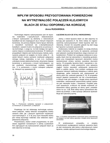 3/2010 TECHNOLOGIA I AUTOMATYZACJA MONTAŻU WPŁYW SPOSOBU PRZYGOTOWANIA POWIERZCHNI NA WYTRZYMAŁOŚĆ POŁĄCZEŃ KLEJOWYCH BLACH ZE STALI ODPORNEJ NA KOROZJĘ Anna RUDAWSKA Technologia klejenia wykorzystywana jest do łączenia materiałów o specyficznych właściwościach, z których wykonywane są elementy o różnorodnych kształtach lub też znajdujących się w różnych miejscach konstrukcji. Za pomocą klejenia można łączyć elementy o niewielkich rozmiarach lub o skomplikowanych kształtach, czasami trudne do połączenia za pomocą innej technologii, z uwagi np. na brak dostępu lub ograniczenie miejsca w analizowanej konstrukcji. W niektórych przypadkach klejenie jest konkurencyjną metodą wykonywania połączeń ze względu na liczne zalety [1 − 4], wśród których można wymienić możliwość połączenia różnego rodzaju materiałów, w tym m.in. możliwość uniknięcia korozji elektrochemicznej, otrzymanie lżejszej konstrukcji w porównaniu z innymi technologiami, czy też uzyskanie równomiernego rozkładu naprężeń (rys. 1) w porównaniu z innymi rodzajami połączeń, np. nitowymi czy spawanymi [4]. ŁĄCZENIE BLACH ZE STALI NIERDZEWNEJ Jedną z metod łączenia blach ze stali odpornej na korozję jest spawanie [7, 8], które należy do najpowszechniej wykorzystywanych metod łączenia stali nierdzewnej, chociaż nie wszystkie gatunki tej stali mogą być łączone w procesie spawania [8]. Analizowany materiał ze względu na swoją strukturę i skład chemiczny jest trudny do spawania, ponieważ pod wpływem wysokiej temperatury ulega znacznym odkształceniom. Problem ten występuje zwłaszcza w przypadku blach (lub też elementów) o niewielkiej grubości, gdzie przy krawędziach łączonych elementów można zaobserwować zmiany wymiaru wywołane skurczem spoiny. W przypadku łączenia blach, najczęściej o niewielkiej grubości i dużej powierzchni, przy spawaniu ciągłym można zauważyć pofalowanie powierzchni blach w pobliżu spoiny. Inny problem występuje przy spawaniu łukowym elektrodą nietopliwą w osłonie gazu obojętnego, gdzie konieczne jest zastosowanie od strony grani tzw. poduszki gazowej [7, 9]. W przypadku dużych płaskich powierzchni lub też w konstrukcjach, w których brak jest dostępu z drugiej strony łączonych materiałów, zastosowanie wspomnianej metody spawania jest niezwykle trudne i kosztowne. Przykład połączeń spawanych, w których nie istniała możliwość zastosowania osłony gazowej od strony grani, przedstawiono na rys. 2 [9]. Brak takiej osłony spowodował utlenienie się przetopu, a taka sytuacja całkowicie dyskwalifikuje tak wykonaną spoinę. Rys. 1. Porównanie rozkładów naprężeń w połączeniach: a) nitowanych, b) spawanych, c) klejowych Projektując lub też dobierając technologię wykonywania połączeń, należy dokonać szczegółowej analizy zarówno zalet, jak i pewnych ograniczeń rozpatrywanych technologii [1, 2, 5, 6], przy czym niezwykle istotny jest rodzaj łączonego materiału oraz właściwie zaprojektowanie połączenia. Prezentowany artykuł został przygotowany na podstawie zagadnień rozważanych w jednej z puławskich firm zajmujących się wykonywaniem połączeń blach ze stali odpornej na korozję. 36 Rys. 2. Przykład nieprawidłowo wykonanej spoiny spawalniczej ze względu na brak osłony gazowej z drugiej strony łączonych elementów W analizowanym przypadku, w związku z trudnościami występującymi podczas spawania blach ze stali nierdzewnej, jako jedną z alternatywnych metod łączenia, została zaproponowana technologia klejenia. TECHNOLOGIA I AUTOMATYZACJA MONTAŻU PRZYGOTOWANIE POWIERZCHNI Podczas klejenia materiałów konstrukcyjnych istotnym czynnikiem technologicznym wpływającym na uzyskiwaną wytrzymałość połączeń klejowych jest m.in. sposób przygotowania powierzchni. Przygotowanie powierzchni (jako pierwszy etap technologii klejenia) powinno zapewnić uzyskanie jak najsilniejszych wiązań adhezyjnych [1, 6], ponieważ sprzyja to uzyskaniu wysokiej wytrzymałości. Istnieje wiele sposobów przygotowania powierzchni [1, 5, 6], wśród których można wymienić odtłuszczanie, obróbkę mechaniczną, obróbkę chemiczną, a także specyficzne rodzaje obróbki, do których zalicza się metodę plazmową [11, 12], metodę wyładowań koronowych [12], czy też obróbkę laserem [13]. Jednakże nie dla wszystkich łączonych materiałów i w każdych warunkach można te sposoby wykorzystać ze względu na istnienie określonych ograniczeń [1, 5]. Sposób przygotowania powierzchni, metody oraz parametry technologiczne operacji przygotowawczych uzależnione są od wielu czynników, do których należą m.in. rodzaj łączonego materiału, rodzaj produkcji, podczas której wykonywane są połączenia klejowe, czy też warunki warsztatowe, w tym dostępność do odpowiednich przyrządów oraz narzędzi. Jeden ze schematów przedstawiających rodzaje operacji przygotowawczych, możliwych do wykorzystania w procesie przygotowania warstwy wierzchniej wielu materiałów konstrukcyjnych, zamieszczono na rys. 3. Odtłuszczanie Oczyszczanie w kąpieli kwaśnej lub alkalicznej Płukanie w wodzie Suszenie Obróbki specjalne Płukanie w wodzie Obróbka mechaniczna Obróbka chemiczna Trawienie plazmą Obróbka laserowa Koronowanie Suszenie Nakładanie gruntu Rys. 3. Przykład operacji wchodzących w skład procesu przygotowania powierzchni materiałów przeznaczonych do klejenia 3/2010 W przypadku niektórych rodzajów materiałów konstrukcyjnych przedstawiane są w literaturze informacje dotyczące możliwości zastosowania określonych metod przygotowania powierzchni [5, 6, 14], niekiedy zamieszczane są szczegółowe wytyczne związane np. ze składem chemicznym kąpieli trawiących i czasem trwania takiej kąpieli [1, 6], temperaturą wody w operacji płukania [5], czy też czasem i temperaturą suszenia [6]. W typowych warunkach warsztatowych najczęściej s