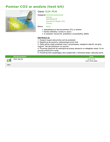 Powered by TCPDF (www.tcpdf.org) Pomiar CO2 w wodzie (test kit) Cena 13,01 PLN Kategorie Kontrola parametrów uprawy GROWSHOP Dwutlenek Wegla CO2 Pomiar Marka Aquili specjalistyczny test do pomiaru CO2 w wodzie bardzo dokładny i prosty w użyciu w zestawie: odczynnik, probówka z przyssawką, tabela INSTRUKCJA: 1. Dodaj 5 kropel odczynnika co2 do probówki 2. Napełnij ją do poziomu wskazanego przez linię 3. Załóż górną część probówki wraz z przyssawką, następnie odwróć „do góry nogami”, tak jak pokazano na rysunku 4. Przyczep pojemnik do wewnętrznej ściany akwarium w odległości około 10 cm poniżej powierzchni wody 5. Porównaj kolor pojawiający się w pojemniku z kolorowa skalą i odczytaj wynik. Wersja produktu CO2 Test Kit 18ml Cena 16,00 PLN 13,01 PLN netto