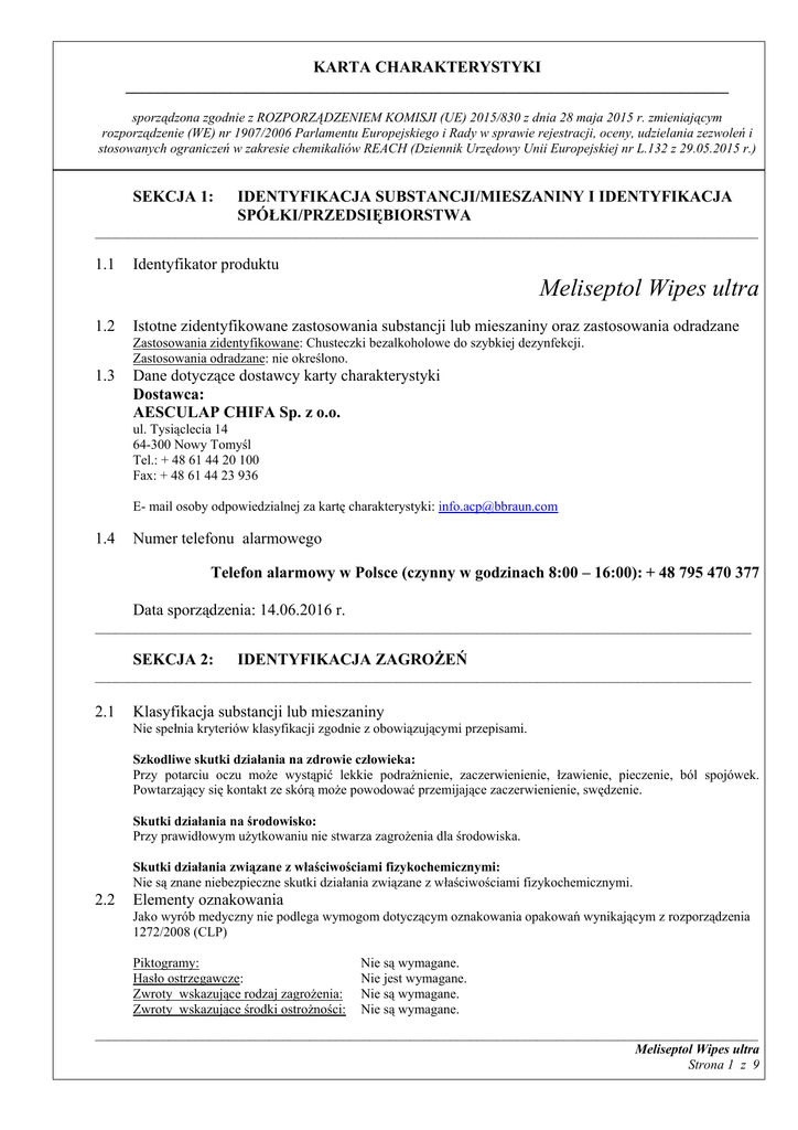 KARTA CHARAKTERYSTYKI ___________________________________________________________________________ sporządzona zgodnie z ROZPORZĄDZENIEM KOMISJI (UE) 2015/830 z dnia 28 maja 2015 r. zmieniającym rozporządzenie (WE) nr 1907/2006 Parlamentu Europejskiego i Rady w sprawie rejestracji, oceny, udzielania zezwoleń i stosowanych ograniczeń w zakresie chemikaliów REACH (Dziennik Urzędowy Unii Europejskiej nr L.132 z 29.05.2015 r.) SEKCJA 1: IDENTYFIKACJA SUBSTANCJI/MIESZANINY I IDENTYFIKACJA SPÓŁKI/PRZEDSIĘBIORSTWA ___________________________________________________________________________________________________ 1.1 Identyfikator produktu Meliseptol Wipes ultra 1.2 Istotne zidentyfikowane zastosowania substancji lub mieszaniny oraz zastosowania odradzane Zastosowania zidentyfikowane: Chusteczki bezalkoholowe do szybkiej dezynfekcji. Zastosowania odradzane: nie określono. 1.3 Dane dotyczące dostawcy karty charakterystyki Dostawca: AESCULAP CHIFA Sp. z o.o. ul. Tysiąclecia 14 64-300 Nowy Tomyśl Tel.: + 48 61 44 20 100 Fax: + 48 61 44 23 936 E- mail osoby odpowiedzialnej za kartę charakterystyki: [email protected] 1.4 Numer telefonu alarmowego Telefon alarmowy w Polsce (czynny w godzinach 8:00 – 16:00): + 48 795 470 377 Data sporządzenia: 14.06.2016 r. __________________________________________________________________________________________________ SEKCJA 2: IDENTYFIKACJA ZAGROŻEŃ __________________________________________________________________________________________________ 2.1 Klasyfikacja substancji lub mieszaniny Nie spełnia kryteriów klasyfikacji zgodnie z obowiązującymi przepisami. Szkodliwe skutki działania na zdrowie człowieka: Przy potarciu oczu może wystąpić lekkie podrażnienie, zaczerwienienie, łzawienie, pieczenie, ból spojówek. Powtarzający się kontakt ze skórą może powodować przemijające zaczerwienienie, swędzenie. Skutki działania na środowisko: Przy prawidłowym użytkowaniu nie stwarza zagrożenia dla środowiska. Skutki działania związane z właściwościami fizykochemicznymi: Nie są znane niebezpieczne skutki działania związane z właściwościami fizykochemicznymi. 2.2 Elementy oznakowania Jako wyrób medyczny nie podlega wymogom dotyczącym oznakowania opakowań wynikającym z rozporządzenia 1272/2008 (CLP) Piktogramy: Hasło ostrzegawcze: Zwroty wskazujące rodzaj zagrożenia: Zwroty wskazujące środki ostrożności: Nie są wymagane. Nie jest wymagane. Nie są wymagane. Nie są wymagane. ___________________________________________________________________________________________________ Meliseptol Wipes ultra Strona 1 z 9 KARTA CHARAKTERYSTYKI ___________________________________________________________________________ sporządzona zgodnie z ROZPORZĄDZENIEM KOMISJI (UE) 2015/830 z dnia 28 maja 2015 r. zmieniającym rozporządzenie (WE) nr 1907/2006 Parlamentu Europejskiego i Rady w sprawie rejestracji, oceny, udzielania zezwoleń i stosowanych ograniczeń w zakresie chemikaliów REACH (Dziennik Urzędowy Unii Europejskiej nr L.132 z 29.05.2015 r.) 2.3 Inne zagrożenia Mieszanina nie spełnia kryteriów PBT i vPvB. _________________________________________________________________________________________________ SEKCJA 3: SKŁAD / INFORMACJA O SKŁADNIKACH ___________________________________________________________________________________________________ 3.2 Mieszanina Identyfikator produktu: Meliseptol Wipes ultra Składniki mieszaniny: Nazwa substancji Chlorki czwartorzędowych związków amoniowych - chlorki benzylo-(C8-18) alkilodimetyloamonium nr indeksowy nr CAS nr WE uł. masowy w% Klasy zagrożenia i kody kategorii 612-140-00-5 63449-41-2 264-151-6 <1 Skin Corr. 1B Acute Tox. 4 Acute Tox. 4 Aquatic Acute 1 Kody zwrotów wskazujących rodzaj zagrożenia H314 H312 H302 H400 Pełne brzmienia zwrotów H oraz akronimy symboli, klas zagrożenia i kodów kategorii podano w sekcji 16. Karty charakterystyki. __________________________________________________________________________________________________ SEKCJA 4: ŚRODKI PIERWSZEJ POMOCY __________________________________________________________________________________ 4.1 Opis środków pierwszej pomocy Wdychanie: Kontakt ze skórą: Kontakt z oczami: Przewód pokarmowy: 4.2 Wyprowadzić lub wynieść poszkodowanego z miejsca narażenia, ułożyć w wygodnej pozycji półleżącej lub siedzącej, zapewnić spokój, chronić przed utratą ciepła. W razie potrzeby wezwać lekarza. Zdjąć zanieczyszczoną odzież i obficie zmywać skórę letnią, bieżącą wodą. W razie potrzeby wezwać lekarza. Natychmiast płukać dużą ilością letniej wody, najlepiej bieżącej, przez co najmniej 15 min. Usunąć szkła kontaktowe. Unikać silnego strumienia wody ze względu na ryzyko mechanicznego uszkodzenia rogówki. Jeżeli podrażnienie nie ustępuje, należy skonsultować się z lekarzem-okulistą. Mało prawdopodobna droga narażenia, ponieważ produkt występuje w postaci chusteczki. Najważniejsze ostre i opóźnione objawy oraz skutki narażenia Przy potarciu oczu może wystąpić lekkie podrażnienie, zaczerwienienie, łzawienie, pieczenie, ból spojówek. Powtarzający się kontakt ze skórą może powodować przemijające zaczerwienienie, swędzenie. 4.3 Wskazania dotyczące wszelkiej natychmiastowej pomocy lekarskiej i szczególnego postępowania z poszkodowanym Brak specjalnych zaleceń. Stosować postępowanie objawowe. __________________________________________________________________________________ SEKCJA 5: POSTĘPOWANIE W PRZYPADKU POŻARU __________________________________________________________________________________________________ 5.1 Środki gaśnicze Odpowiednie środki gaśnicze: ___________________________________________________________________________________________________ Meliseptol Wipes ultra Strona 2 z 9 KARTA CHARAKTERYSTYKI ___________________________________________________________________________ sporządzona zgodnie z ROZPORZĄDZENIEM KOM