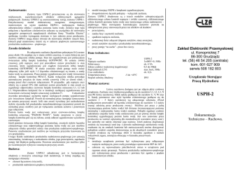 Zastosowanie: Zestawy typu USPH-2 przeznaczone są do sterowania trójfazowych, asynchronicznych silników elektrycznych agregatów pompowych. Zestawy UPSH-2 są unowocześnioną wersją zestawu USPH-1. Dotychczasowy moduł elektroniczny zastąpiono zintegrowanym, montowanym na szynie modułem EKPH-1, realizującym funkcję zabezpieczenia silnika i czujnika poziomu lustra wody. Zestawy tego typu połączone z łącznikiem ciśnieniowym zalecane są szczególnie do sterowania agregatów pompowych napędzanych silnikiem firmy “Franklin Electric” spełniając wysokie wymagania stawiane w tym zakresie przez producenta. Zestawy USPH-2 mogą służyć również do sterowania silników innych firm, których prąd znamionowy mieści się w zakresie prądowym zastosowanego przekaźnika nadmiarowo – prądowego. Zasada działania: Po załączeniu zasilania (łącznikiem pokrętnym O-I) zestaw przez około 10s znajduje się w stanie zwłoki czasowej, w czasie której nie jest możliwe załączenie silnika pompy. Stan ten sygnalizowany jest pulsacyjnym świeceniem żółtej lampki kontrolnej GOTOWOŚĆ. Po ustaniu zwłoki czasowej, jeśli napięcie sieci jest prawidłowe zestaw przechodzi w stan czuwania, który sygnalizowany jest ciągłym świeceniem żółtej lampki kontrolnej GOTOWOŚĆ. W stanie czuwania silnik pompy może zostać załączony tylko jeśli styki 1-2 (łącznika ciśnieniowego) są zwarte, a sondy lustra wody są zanurzone. Praca pompy sygnalizowana jest wtedy świeceniem zielonej lampki kontrolnej PRACA. Każde wyłączenie silnika powoduje automatyczne przejście do stanu zwłoki czasowej (10s) co chroni silnik i pompę przed zbyt częstymi załączeniami. W przypadku gdy napięcie sieci obniży się o ponad 10% (lub zaniknie) zestaw przechodzi w stan awarii co sygnalizuje odpowiednia czerwona lampka kontrolna oznaczona L1, L2 lub L3. Nieprawidłowa kolejność faz w instalacji zasilającej sygnalizowana jest świeceniem czerwonej lampki oznaczonej symbolem . Uszkodzenie stycznika powodujące asymetrię napięć zasilających pompę sygnalizowane jest świeceniem lampki . Powrót do normalnej pracy następuje samoczynnie po ustaniu przyczyny awarii. Jeśli stan awarii wywołany jest uszkodzeniem styków stycznika lub przekaźnika termobimetalowego (asymetria) powrót do normalnej pracy możliwy jest po wyłączeniu zasilania zestawu i ponownym jego załączeniu. Poziom lustra wody jest wskazywany przez czerwono-zieloną lampkę kontrolną oznaczoną “POZIOM WODY”. Sondy zanurzone w cieczy – lampka kontrolna pali się na zielono, sondy odkryte sygnalizowane są kolorem czerwonym. Jeżeli pomimo świecenia żółtej lampki kontrolnej, zwartych styków łącznika ciśnieniowego oraz odpowiedniego poziomu lustra wody nie jest możliwe załączenie silnika sprawdzić należy stan przekaźnia nadmiarowo-prądowego. Ponowne uruchomienie jest możliwe po wciśnięciu przycisku kasowania na ww przekaźniku. Uwaga: Każde zadziałanie przekaźnika nadmiarowo-prądowego jest sytuacją nienormalną, świadczącą o uszkodzeniu silnika, jego przeciążeniu, zapchaniu pompy lub błędnym podłączeniu. Ponowne uruchomienie jest możliwe tylko po wcześniejszym wykryciu i usunięciu przyczyny awarii. Budowa: Zestaw USPH-2 zabudowany jest w hermetycznej obudowie z tworzywa sztucznego (lub metalowej), w której znajdują się następujące elementy: – element łączeniowy (stycznik), – przekaźnik nadmiarowo-prądowy (termobimetalowy), – – moduł sterujący EKPH z lampkami sygnalizacyjnymi, dwupołożeniowy łącznik pokrętny – wyłącznik zasilania. Zestawy USPH-2 zbudowane są z trzech modułów zabezpieczających: elektronicznego członu kontroli napięcia i zwłoki czasowej, elektronicznego członu kontroli poziomu lustra wody oraz termicznego członu nadmiarowo – prądowego. Takie rozwiązanie konstrukcyjne zestawów pozwala na zabezpieczenie pracy sterowanych przez nie silników od skutków: – przeciążenia, – zaniku fazy i asymetrii zasilania, – spadkiem napięcia zasilania, – nadmiernej ilości załączeń (drgania zestyków, stany awaryjne), – awarii zestyków stycznika i przekaźnika termobimetalowego, – pracy pompy “na sucho” - praca bez cieczy. Dane techniczne: Typ Napięcie zasilania Pobór mocy: Zakres czułości wejściowej (regulowany) Prąd elektrod (12V) Czas zadziałania Temperatura pracy -5 do +45ºC Stopień ochrony obudowy USPH-2 3x400V+0, 50Hz ok. 4 VA 0,5 do 50kΩ max 3mA, 50Hz ok. 0,2s IP55 Montaż zestawu: Listwa zaciskowa dostępna jest po zdjęciu płyty czołowej urządzenia. Zasilanie sieci trójfazowej podłącza się do zacisków L1, L2, L3, N oraz PE listwy zaciskowej. Silnik należy podłączyć do zacisków U, V, W oraz N. Sondy pomiarowe oraz styki łącznika ciśnieniowego podłącza się do zacisków 1 – 5 listwy zaciskowej wg załączonego schematu. (Przed podłączeniem przewodów od łącznika ciśnieniowego do zacisków 1-2 należy usunąć założoną przez producenta zworę.) Możliwa jest praca z jedną (wyznaczającą poziom lustra wody) lub dwiema (wyznaczającymi poziomy minimalny i maksymalny lustra wody) sondami. Pokrętło regulacji czułości zadziałania czujnika lustra wody umieszczone jest po prawej stronie lampki kontrolnej sygnalizującej poziom lustra wody. Jest ono ustawione przez producenta na wartość optymalną dla standardowych warunków pracy sond i bez potrzeby nie należy zmieniać jego nastawy. Jeżeli podczas eksploatacji zmienia się rezystancja sond (np. z powodu nadmiernego zażelazienia wody, osadzania się na sondach kamienia lub zanieczyszczeń) można skorygować pokrętłem czułość czujnika dostosowując ją do akualnych warunków pracy. Czułość zwiększa się wykonując obrót w kierunku zgodnym z ruchem wskazówek zegara, zmniejsza obracając w kierunku przeciwnym. Uwaga: – instalacja urządzenia powinna być wykonywana przy odłączonym napięciu zasilającym, przez