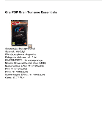 Gra PSP Gran Turismo Essentials Gwarancja: Brak gwarancji Gatunek: Wyścigi Wersja językowa: Angielska Kategoria wiekowa od:: 3 lat KINECT/MOVE: nie współpracuje Nośnik: Universal Media Disc (UMD) Numer części EAN: 711719152095 P/N: 711719152095 P/N:: 711719152095 Numer części EAN:: 711719152095 Cena: 37.77 PLN Powered by TCPDF (www.tcpdf.org)