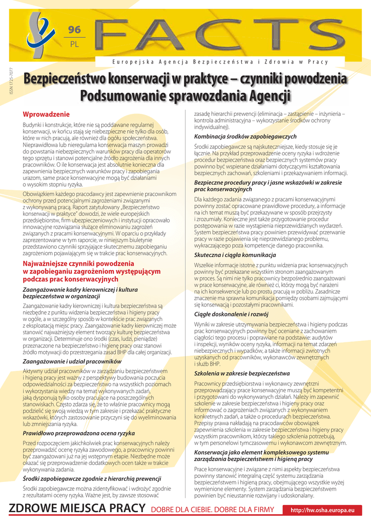 96 PL ISSN 1725-7077 Europejska Agencja Bezpieczeństwa i Zdrowia w Pracy Bezpieczeństwo konserwacji w praktyce – czynniki powodzenia Podsumowanie sprawozdania Agencji Wprowadzenie Budynki i konstrukcje, które nie są poddawane regularnej konserwacji, w końcu stają się niebezpieczne nie tylko dla osób, które w nich pracują, ale również dla ogółu społeczeństwa. Nieprawidłowa lub nieregularna konserwacja maszyn prowadzi do powstania niebezpiecznych warunków pracy dla operatorów tego sprzętu i stanowi potencjalne źródło zagrożenia dla innych pracowników. O ile konserwacja jest absolutnie konieczna dla zapewnienia bezpiecznych warunków pracy i zapobiegania urazom, same prace konserwacyjne mogą być działaniami o wysokim stopniu ryzyka. Obowiązkiem każdego pracodawcy jest zapewnienie pracownikom ochrony przed potencjalnymi zagrożeniami związanymi z wykonywaną pracą. Raport zatytułowany „Bezpieczeństwo konserwacji w praktyce” dowodzi, że wiele europejskich przedsiębiorstw, firm ubezpieczeniowych i instytucji opracowało innowacyjne rozwiązania służące eliminowaniu zagrożeń związanych z pracami konserwacyjnymi. W oparciu o przykłady zaprezentowane w tym raporcie, w niniejszym biuletynie przedstawiono czynniki sprzyjające skutecznemu zapobieganiu zagrożeniom pojawiającym się w trakcie prac konserwacyjnych. Najważniejsze czynniki powodzenia w zapobieganiu zagrożeniom występującym podczas prac konserwacyjnych Zaangażowanie kadry kierowniczej i kultura bezpieczeństwa w organizacji Zaangażowanie kadry kierowniczej i kultura bezpieczeństwa są niezbędne z punktu widzenia bezpieczeństwa i higieny pracy w ogóle, a w szczególny sposób w kontekście prac związanych z eksploatacją miejsc pracy. Zaangażowanie kadry kierowniczej może stanowić najważniejszy element tworzący kulturę bezpieczeństwa w organizacji. Determinuje ono środki (czas, ludzi, pieniądze) przeznaczone na bezpieczeństwo i higienę pracy oraz stanowi źródło motywacji do przestrzegania zasad BHP dla całej organizacji. Zaangażowanie i udział pracowników Aktywny udział pracowników w zarządzaniu bezpieczeństwem i higieną pracy jest ważny z perspektywy budowania poczucia odpowiedzialności za bezpieczeństwo na wszystkich poziomach i wykorzystania wiedzy na temat wykonywanych zadań, jaką dysponują tylko osoby pracujące na poszczególnych stanowiskach. Często zdarza się, że to właśnie pracownicy mogą podzielić się swoją wiedzą w tym zakresie i przekazać praktyczne wskazówki, których zastosowanie przyczyni się do wyeliminowania lub zmniejszania ryzyka. Prawidłowo przeprowadzona ocena ryzyka Przed rozpoczęciem jakichkolwiek prac konserwacyjnych należy przeprowadzić ocenę ryzyka zawodowego, a pracownicy powinni być zaangażowani już na jej wstępnym etapie. Niezbędne może okazać się przeprowadzenie dodatkowych ocen także w trakcie wykonywania zadania. Środki zapobiegawcze zgodnie z hierarchią prewencji Środki zapobiegawcze można zidentyfikować i wdrożyć zgodnie z rezultatami oceny ryzyka. Ważne jest, by zawsze stosować zasadę hierarchii prewencji (eliminacja – zastąpienie – inżynieria – kontrola administracyjna – wykorzystanie środków ochrony indywidualnej). Kombinacja środków zapobiegawczych Środki zapobiegawcze są najskuteczniejsze, kiedy stosuje się je łącznie. Na przykład przeprowadzenie oceny ryzyka i wdrożenie procedur bezpieczeństwa oraz bezpiecznych systemów pracy powinno być wspierane działaniami dotyczącymi kształtowania bezpiecznych zachowań, szkoleniami i przekazywaniem informacji. Bezpieczne procedury pracy i jasne wskazówki w zakresie prac konserwacyjnych Dla każdego zadania związanego z pracami konserwacyjnymi powinny zostać opracowane prawidłowe procedury, a informacje na ich temat muszą być przekazywane w sposób przejrzysty i zrozumiały. Konieczne jest także przygotowanie procedur postępowania w razie wystąpienia nieprzewidzianych wydarzeń. System bezpieczeństwa pracy powinien przewidywać przerwanie pracy w razie pojawienia się nieprzewidzianego problemu, wykraczającego poza kompetencje danego pracownika. Skuteczna i ciągła komunikacja Wszelkie informacje istotne z punktu widzenia prac konserwacyjnych powinny być przekazane wszystkim stronom zaangażowanym w proces. Są nimi nie tylko pracownicy bezpośrednio zaangażowani w prace konserwacyjne, ale również ci, którzy mogą być narażeni na ich konsekwencje lub po prostu pracują w pobliżu. Zasadnicze znaczenie ma sprawna komunikacja pomiędzy osobami zajmującymi się konserwacją i pozostałymi pracownikami. Ciągłe doskonalenie i rozwój Wyniki w zakresie utrzymywania bezpieczeństwa i higieny podczas prac konserwacyjnych powinny być oceniane z zachowaniem ciągłości tego procesu i poprawiane na podstawie: audytów i inspekcji, wyników oceny ryzyka, informacji na temat zdarzeń niebezpiecznych i wypadków, a także informacji zwrotnych uzyskanych od pracowników, wykonawców zewnętrznych i służb BHP. Szkolenia w zakresie bezpieczeństwa Pracownicy przedsiębiorstwa i wykonawcy zewnętrzni przeprowadzający prace konserwacyjne muszą być kompetentni i przygotowani do wykonywanych działań. Należy im zapewnić szkolenie w zakresie bezpieczeństwa i higieny pracy oraz informować o zagrożeniach związanych z wykonywaniem konkretnych zadań, a także o procedurach bezpieczeństwa. Przepisy prawa nakładają na pracodawców obowiązek zapewnienia szkolenia w zakresie bezpieczeństwa i higieny pracy wszystkim pracownikom, którzy takiego szkolenia potrzebują, w tym personelowi tymczasowemu i wykonawcom zewnętrznym. Konserwacja jako element kompleksowego systemu zarządzania bezpieczeństwem i higieną pracy Prace konserwacyjne i związane z nimi aspekty bezpieczeństwa powinny stanowić integralną część systemu zarządzania bezpieczeństwem i higieną pracy, obejmującego wszystkie wyż