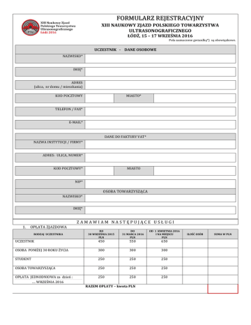 FORMULARZ REJESTRACYJNY XIII NAUKOWY ZJAZD POLSKIEGO TOWARZYSTWA ULTRASONOGRAFICZNEGO ŁÓDŹ, 15 – 17 WRZEŚNIA 2016 Pola zaznaczone gwiazdką*) są obowiązkowe. UCZESTNIK - DANE OSOBOWE NAZWISKO* IMIĘ* ADRES (ulica, nr domu / mieszkania) KOD POCZTOWY MIASTO* TELEFON / FAX* E-MAIL* DANE DO FAKTURY VAT* NAZWA INSTYTUCJI / FIRMY* ADRES: ULICA, NUMER* KOD POCZTOWY* MIASTO NIP* OSOBA TOWARZYSZĄCA NAZWISKO* IMIĘ* ZAMAWIAM NASTĘPUJĄCE USŁUGI 1. OPŁATA ZJAZDOWA DO 30 WRZEŚNIA 2015 PLN DO 31 MARCA 2016 PLN OD 1 KWIETNIA 2016 I NA MIEJSCU PLN UCZESTNIK 450 550 650 OSOBA PONIŻEJ 30 ROKU ŻYCIA 300 300 300 STUDENT 250 250 250 OSOBA TOWARZYSZĄCA 250 250 250 OPŁATA JEDNODNIOWA za dzień : …. WRZEŚNIA 2016 250 250 250 RODZAJ UCZESTNIKA RAZEM OPŁATY – kwota PLN ILOŚĆ OSÓB SUMA W PLN Szczegółowe opisy hoteli i wycieczek dostępne na stronie www.ptu2016.pl 2. REZERWACJA HOTELOWA DATA PRZYJAZDU (dzień) …. WRZEŚNIA 2016 DATA WYJAZDU (dzień) …. WRZEŚNIA 2016 razem ilość noclegów Prosimy o wpisanie wybranego hotelu CENA NOCLEGU POK.1-OSOBOWY - PLN HOTEL CENA NOCLEGU POK.2-OSOBOWY - PLN ILOŚĆ NOCLEGÓW SUMA W PLN W przypadku braku miejsc w wybranym hotelu proszą o zakwaterowanie w hotelu…………………………………………………. RAZEM NOCLEGI – kwota w PLN Wszystkie ceny zawierają : śniadanie i podatek VAT. Fakturę za hotel wystawia Sekretariat. W przypadku pokoju 2-osobowego prosimy o podanie nazwiska drugiej osoby:……………………………………………. 3. INNE USŁUGI IMPREZA CENA OD OSOBY - PLN ILOŚĆ OSÓB SUMA W PLN ZWIEDZANIE 10:00-13:00, czwartek, 15 września 2016 10:00-13:00, piątek, 6 września 2016 WYCIECZKA 9:00-13:00, piątek, 6 września 2016 WYCIECZKA 9:00-13:00, sobota, 17 września 2016 BAL ULTRASONOGRAFISTÓW 20:00, sobota, 17 września 2016 RAZEM USŁUGI - kwota w PLN PŁATNOŚĆ RAZEM DO ZAPŁATY ZA ZAMÓWIONE USŁUGI suma 1 + 2 + 3 PLN W celu potwierdzenia rejestracji i rezerwacji wymagana jest pełna wpłata za zamówienia w PLN Prosimy o zaznaczenie preferowanej formy płatności 1. Przelew bankowy na rachunek Sekretariatu XIII Zjazdu PTU: MBANK SA Nr 57 1140 1010 0000 3094 0600 1003 właściciel rachunku: Holiday Travel Sp. z o.o. ul. Nowowiejska 10, 00-653 Warszawa tytuł przelewu: „opłata XIII Zjazd PTU za uczestnika (nazwisko)” prosimy o przesłanie faxem lub e-mailem kopii potwierdzenia przelewu; wszystkie koszty bankowe pokrywa uczestnik 2. Karta kredytowa (płatność korespondencyjna) Formularz autoryzacji płatności znajduje się na stronie internetowej www.ptu2016.pl (do pobrania) . Wypełniony i podpisany formularz należy wysłać faxem lub emailem na wskazany poniżej adres uwagi, życzenia uczestnika : miejscowość, data podpis P r o s i m y o w y p e ł n i e n i e f o r m u l a r z a i p r z e s ł a n i e n a a d r e s e - m a i l : [email protected] lub [email protected] l u b f a x e m n a n u m e r (22) 825 91 52 lub na adres sekretariatu: Sekretariat XIII Naukowego Zjazdu PTU - Holiday Travel sp. z o.o. ul. Nowowiejska 10, 00-653 Warszawa