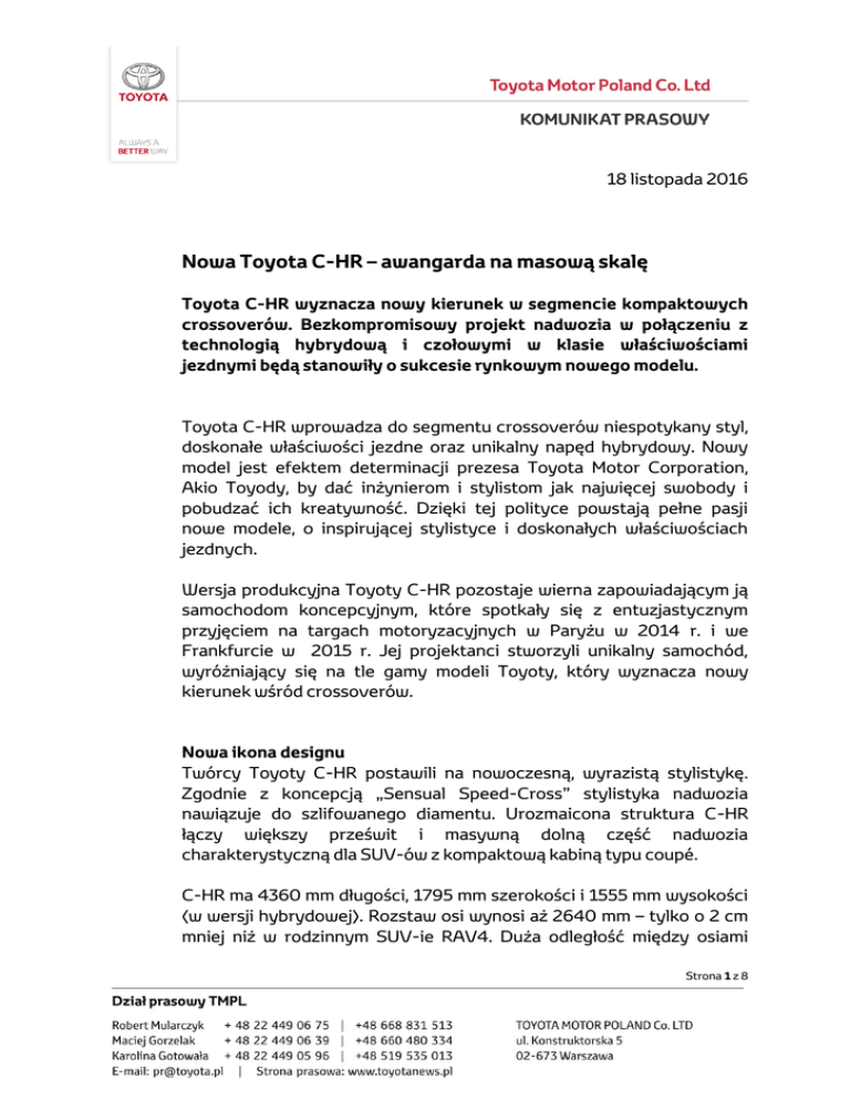 18 listopada 2016 Nowa Toyota C-HR – awangarda na masową skalę Toyota C-HR wyznacza nowy kierunek w segmencie kompaktowych crossoverów. Bezkompromisowy projekt nadwozia w połączeniu z technologią hybrydową i czołowymi w klasie właściwościami jezdnymi będą stanowiły o sukcesie rynkowym nowego modelu. Toyota C-HR wprowadza do segmentu crossoverów niespotykany styl, doskonałe właściwości jezdne oraz unikalny napęd hybrydowy. Nowy model jest efektem determinacji prezesa Toyota Motor Corporation, Akio Toyody, by dać inżynierom i stylistom jak najwięcej swobody i pobudzać ich kreatywność. Dzięki tej polityce powstają pełne pasji nowe modele, o inspirującej stylistyce i doskonałych właściwościach jezdnych. Wersja produkcyjna Toyoty C-HR pozostaje wierna zapowiadającym ją samochodom koncepcyjnym, które spotkały się z entuzjastycznym przyjęciem na targach motoryzacyjnych w Paryżu w 2014 r. i we Frankfurcie w 2015 r. Jej projektanci stworzyli unikalny samochód, wyróżniający się na tle gamy modeli Toyoty, który wyznacza nowy kierunek wśród crossoverów. Nowa ikona designu Twórcy Toyoty C-HR postawili na nowoczesną, wyrazistą stylistykę. Zgodnie z koncepcją „Sensual Speed-Cross” stylistyka nadwozia nawiązuje do szlifowanego diamentu. Urozmaicona struktura C-HR łączy większy prześwit i masywną dolną część nadwozia charakterystyczną dla SUV-ów z kompaktową kabiną typu coupé. C-HR ma 4360 mm długości, 1795 mm szerokości i 1555 mm wysokości (w wersji hybrydowej). Rozstaw osi wynosi aż 2640 mm – tylko o 2 cm mniej niż w rodzinnym SUV-ie RAV4. Duża odległość między osiami Strona 1 z 8 pozwoliła wygospodarować zaskakująco przestronne wnętrze oraz stworzyć atrakcyjną bryłę auta. Przód samochodu jest rozwinięciem koncepcji stylistycznych Under Priority i Keen Look, widocznych w kształcie górnego grilla, którego smukłą linię przedłużają wyraziste reflektory i przetłoczenia za przednimi nadkolami. Przesunięcie czarnych listew progowych oraz przetłoczenia na boku auta wizualnie łączące przednie i tylne nadkola, podkreślają dynamiczną, uniesioną sylwetkę auta. Sportowy charakter w stylu coupé został wzmocniony dzięki opadającej linii dachu, przechodzącej z tyłu w duży strukturalny spojler, oraz ukryciu klamki tylnych drzwi w słupku C. Na tle smukłego profilu auta wyróżniają się tylne reflektory w technologii LED. Wyrafinowany projekt wnętrza Wnętrze C-HR jest realizacją nowej koncepcji stylistycznej Sensual Tech, łączącej funkcjonalność nowoczesnych technologii z najwyższą jakością materiałów i inspirującym stylem. Projekt przestronnej kabiny koncentruje się na komforcie kierowcy. Wielowarstwowa struktura deski rozdzielczej, oparta na kontraście między miękkimi materiałami i ostrymi liniami, znajduje kontynuację w wykończeniu drzwi. Zorientowanie na kierowcę zainspirowało projektantów do skierowania konsoli centralnej z przełącznikami i wystającym ponad górną linię deski rozdzielczej 8-calowym ekranem dotykowym w stronę prowadzącego samochód. Kierowca ma do dyspozycji nowy system multimedialny o wzbogaconym, zmodyfikowanym interfejsie z platformą Multi-Media’16 oraz rozbudowane usługi łączności i wymiany danych. Asymetryczna konsola centralna została tak zaprojektowana, aby wszystkie przełączniki znajdowały się w zasięgu ręki kierowcy, jednocześnie zapewniając wygodny dostęp także pasażerowi. Deska rozdzielcza została obniżona, przyczyniając się do poprawy widoczności. Unikalny dwupoziomowy projekt przednich foteli łączy sportowe oparcie ze wzmocnionym, masywnym siedziskiem. C-HR będzie konkurował na rynku m.in. z crossoverami marek premium, dlatego Toyota postawiła na uzyskanie możliwie najwyższej jakości Strona 2 z 8 wykończenia wnętrza. Europejski zespół Sensual Quality Toyoty pracował przy projekcie C-HRa od początkowego etapu. Inżynierzy i styliści zwracali szczególną uwagę na jakość materiałów, ich fakturę, kształt, kolor i oświetlenie – dotyczyło to nawet takich detali, jak szerokość ściegu na fotelach. Aby zachować stylistyczną spójność wnętrza i karoserii, motyw diamentu, do którego nawiązuje kształt nadwozia, został wykorzystany w kształcie wielu przełączników, wewnętrznej strony drzwi, podsufitki, osłon głośników JBL, w tym głośników wysokotonowych, a nawet wskazówek zegarów analogowych. Starannie dobrane wykończenie poszczególnych elementów tworzy harmonijny, spójny, jednolity wygląd wnętrza auta. Klienci będą mogli wybierać spośród trzech kompozycji kolorystycznych wnętrza – ciemnoszarej, niebiesko-czarnej i brązowoczarnej. Elementy dekoracyjne wykonano z eleganckiego tworzywa w kolorze Piano Black z satynowo-srebrnymi zdobieniami. Wrażenie harmonii podkreśla jednolite niebieskie podświetlenie. Wyposażenie klasy premium Toyota dąży do udostępnienia zaawansowanych systemów bezpieczeństwa czynnego jak najszerszemu gronu kierowców, dlatego stopniowo wprowadza pakiety Toyota Safety Sense do wszystkich swoich modeli. W nowym crossoverze dostępna będzie w standardzie najnowocześniejsza wersja tego systemu, której działanie opiera się na współpracy kamery z radarem o zwiększonym zasięgu i precyzji. Toyota Safety Sense nowej generacji obejmuje układ wczesnego reagowania w razie ryzyka zderzenia z systemem wykrywania pieszych (PCS + PD), aktywny tempomat (ACC), układ ostrzegania o niezamierzonej zmianie pasa ruchu (LDA) z funkcją powrotu na właściwy tor jazdy, automatyczne światła drogowe (AHB) i układ rozpoznawania znaków drogowych (RSA)1. Najbardziej wymagający klienci mogą zamówić model z podgrzewanymi siedzeniami, inteligentnym kluczykiem, przyciemnianymi szybami, specjalnie dobraną tapicerką, a także z udoskonalonym systemem 1 RSA jest dostępny od wersji Premium / Premium Hybrid. Strona 3 z 8 automatycznego park
