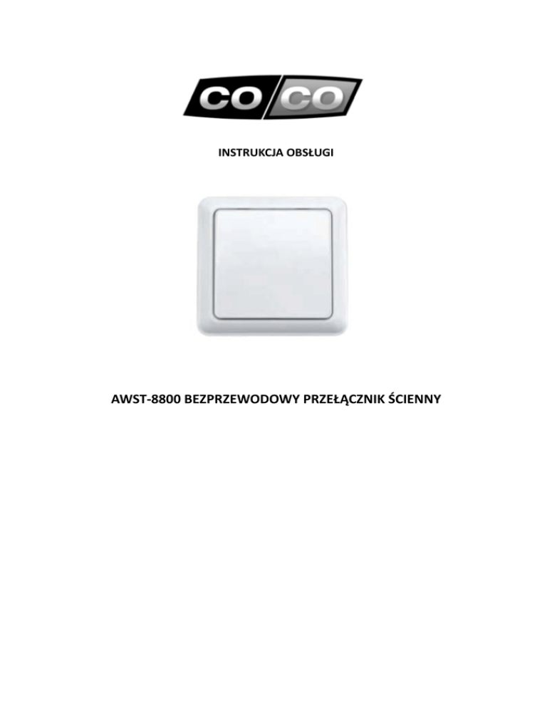 INSTRUKCJA OBSŁUGI AWST-8800 BEZPRZEWODOWY PRZEŁĄCZNIK ŚCIENNY Nie można wyświetlić obrazu. Na komputerze może brakować pamięci do otwarcia obrazu lub obraz może być uszkodzony. Uruchom ponownie komputer, a następnie otwórz plik ponownie. Jeśli czerwony znak x nadal będzie wyświetlany, konieczne może być usunięcie obrazu, a następnie ponowne wstawienie go. Gratulujemy zakupu produktu firmy COCO Aby jak najlepiej korzystać z zakupionego produktu, zarejestruj się na naszej stronie internetowej: www.coco-technology.com/register . Możesz tam także znaleźć więcej informacji, aktualizacje oraz wsparcie online. Przeczytaj broszurę „Ważne informacje” zanim zainstalujesz ten produkt Nie przestrzeganie instrukcji bezpieczeństwa może być niebezpieczne, a wadliwa instalacja spowoduje unieważnienie gwarancji mającej zastosowanie do tego produktu. 2 Nie można wyświetlić obrazu. Na komputerze może brakować pamięci do otwarcia obrazu lub obraz może być uszkodzony. Uruchom ponownie komputer, a następnie otwórz plik ponownie. Jeśli czerwony znak x nadal będzie wyświetlany, konieczne może być usunięcie obrazu, a następnie ponowne wstawienie go. Otwieranie przełącznika ściennego Użyj cienkiego śrubokręta, aby zdjąć przycisk z ramki przełącznika. Procedura nauki kodu przez odbiornik COCO Aby sterować jednym lub kilkoma odbiornikami jednocześnie należy przypisać kod nadajnika do jednego lub więcej odbiorników. Przeczytaj w instrukcji obsługi tego odbiornika procedurę nauki kodu. Wyślij sygnał ON przez naciśnięcie przycisku [ON] w czasie, gdy tryb nauki jest aktywny. 3 Nie można wyświetlić obrazu. Na komputerze może brakować pamięci do otwarcia obrazu lub obraz może być uszkodzony. Uruchom ponownie komputer, a następnie otwórz plik ponownie. Jeśli czerwony znak x nadal będzie wyświetlany, konieczne może być usunięcie obrazu, a następnie ponowne wstawienie go. Ustawianie czasu opóźnienia wyłączenia W pozycji [0] oświetlenie jest załączone do momentu, aż ręcznie wysłany zostanie sygnał OFF. Zmieniając ustawienie przełącznika 3s/10s/30s/1m/2m/5m/10m nadajnik będzie automatycznie wysyłać sygnał wyłączenia OFF po wybranym czasie (3 sekundy/.../10 minut). Jeśli naciśniesz ON w międzyczasie naścienny przełącznik uruchomi ponownie odliczanie czasu. Przymocowanie nadajnika za pomocą śrub (1) Przykręcić podstawę bezprzewodowego przełącznika ściennego na płaskiej powierzchni np. ścianie (2) Przytwierdź z powrotem ramkę i załóż przycisk na ramce. 4 Nie można wyświetlić obrazu. Na komputerze może brakować pamięci do otwarcia obrazu lub obraz może być uszkodzony. Uruchom ponownie komputer, a następnie otwórz plik ponownie. Jeśli czerwony znak x nadal będzie wyświetlany, konieczne może być usunięcie obrazu, a następnie ponowne wstawienie go. Przymocowanie nadajnika za pomocą taśmy dwustronnej (1) Przylepić taśmę dwustronną z tyłu bezprzewodowego przełącznika (2) Przykleić ścienny bezprzewodowy przełącznik do płaskiej powierzchni np. ściany. Sterowanie jednym lub kilkoma odbiornikami COCO Możesz przydzielić AWST-8800 do jednego lub kilku odbiorników, aby sterować nimi jednocześnie. Przeczytaj w instrukcji obsługi tego odbiornika procedurę nauki kodu. 5 Nie można wyświetlić obrazu. Na komputerze może brakować pamięci do otwarcia obrazu lub obraz może być uszkodzony. Uruchom ponownie komputer, a następnie otwórz plik ponownie. Jeśli czerwony znak x nadal będzie wyświetlany, konieczne może być usunięcie obrazu, a następnie ponowne wstawienie go. Sterowanie odbiornikiem on/off COCO (1) Naciśnij na przełączniku ON, aby włączyć odbiornik. (2) Naciśnij na przełączniku OFF,aby wyłączyć odbiornik. Sterowanie regulatorem oświetlenia COCO (1) Naciśnij ON jeden raz aby włączyć odbiornik. (2) Naciśnij ON jeszcze raz, aby aktywować tryb ściemniania. Światło będzie powoli przyciemniane z większą lub mniejszą intensywnością. (3) Naciśnij ON po raz trzeci, aby wybrać żądany poziom intensywności światła. (4) Naciśnij OFF, aby wyłączyć odbiornik. 6 Nie można wyświetlić obrazu. Na komputerze może brakować pamięci do otwarcia obrazu lub obraz może być uszkodzony. Uruchom ponownie komputer, a następnie otwórz plik ponownie. Jeśli czerwony znak x nadal będzie wyświetlany, konieczne może być usunięcie obrazu, a następnie ponowne wstawienie go. Sterowanie elektrycznymi ekranami (1) (2) (3) (4) Wyślij z nadajnika sygnał ON, aby podnieść ekran. Wyślij ponownie sygnał ON, aby zatrzymać ekran. Wyślij sygnał OFF, aby opuścić w dół ekran. Wyślij ponownie sygnał OFF, aby zatrzymać ekran. Jeśli to konieczne, przeczytaj w instrukcji obsługi odbiornika fragment dotyczący zmiany kierunku ruchu ekranu. Wymiana baterii przełącznika (1) Otwórz pokrywę ściennego wyłącznika przy pomocy śrubokręta. (2) Umieść nową baterię litową typu 3V CR2032 z poprawną polaryzacją. (3) Załóż z powrotem pokrywę wyłącznika. 7