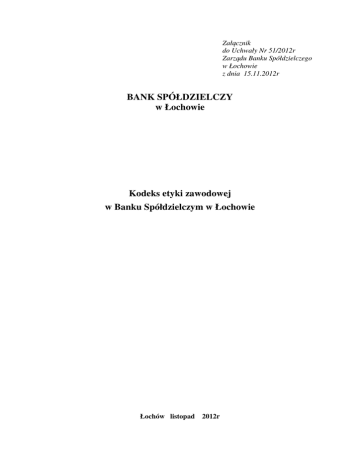 Zał cznik do Uchwały Nr 51/2012r Zarz du Banku Spółdzielczego w Łochowie z dnia 15.11.2012r BANK SPÓŁDZIELCZY w Łochowie Kodeks etyki zawodowej w Banku Spółdzielczym w Łochowie Łochów listopad 2012r SPIS TRE CI Preambuła ................................................................................................................................. 3 Rozdział 1. Postanowienia ogólne ............................................................................................. 4 Rozdział 2. Zgodno z prawem i zasadami ............................................................................ 4 Rozdział 3. Kultura pracy......................................................................................................... 5 Rozdział 4. Relacje z klientami ................................................................................................ 6 Rozdział 5. Konflikt interesów................................................................................................. 6 Rozdział 6. Ochrona zasobów .................................................................................................. 8 Rozdział 7. Ochrona informacji ............................................................................................... 8 Rozdział 8. Sygnalizowanie nieprawidłowo ci ........................................................................ 9 Rozdział 9. Postanowienia ko cowe ......................................................................................... 9 Zał czniki: Zał cznik nr 1 Zał cznik nr 2 O wiadczenie Rejestr Korzy ci 2 Preambuła Bank Spółdzielczy w Łochowie jako instytucja zaufania publicznego poprzez swoj działalno buduje zaufanie Klientów oraz kształtuje pozytywny wizerunek sektora bankowo ci spółdzielczej. Uczciwo , rzetelno , staranno , odpowiedzialno oraz profesjonalizm stanowi normy post powania wszystkich Pracowników Banku, bez wzgl du na stanowisko i pełnion funkcj . Wysokie standardy etyki zawodowej wynikaj z misji Banku: „Bank kompleksowych Spółdzielczy usług charakteryzuj cy finansowych klientom si uniwersalizmem indywidualnym, w małym wiadczeniu i rednim przedsi biorstwom, instytucjom samorz dowym, pozostałym podmiotom gospodarczym i jednostkom organizacyjnym posiadaj cym zdolno prawn . Bank wspieraj cy rozwój gospodarczy rodowisk lokalnych we współpracy z jednostkami samorz du terytorialnego, przyjazny, godny zaufania, z dorobkiem i tradycj w sektorze polskiej spółdzielczo ci bankowej. Bank zapewniaj cy bezpiecze stwo, sprawno i profesjonaln jako Klienta, inspiruj cy do grupy banków spółdzielczych najszybciej rozwijaj cych si ." 3 obsługi Rozdział 1. Postanowienia ogólne § 1. 1. Kodeks etyki zawodowej w Banku Spółdzielczym w Łochowie, zwany dalej Kodeksem, okre la obowi zuj ce w Banku standardy etyki zawodowej. 2. Zapisy Kodeksu uwzgl dniaj tre norm zawartych w Kanonie Dobrych Praktyk Rynku Finansowego oraz Zasadach Dobrej Praktyki Bankowej. 3. Pracownik, rozumiany jako osoba zatrudniona na podstawie umowy o prac w Banku Spółdzielczym w Łochowie, zwanym dalej Bankiem, swoim etycznym post powaniem przyczynia si do zapewnienia najwy szego poziomu wiadczonych przez Bank usług. 4. Stosowanie zasad etyki przez wszystkich pracowników przyczynia si zmniejszenia kosztów oraz do zwi kszenia zysków, poniewa : do 1) zmniejsza przypadki kłamstwa, korupcji, defraudacji i innych złych praktyk, 2) zmniejsza liczb sytuacji, w których wyst puje konflikt interesów, 3) zwi ksza zaufanie klientów, kontrahentów i partnerów, 4) zwi ksza lojalno pracowników, 5) istotnie wpływa na wizerunek Banku. 5. Zasady etyki opisane w Kodeksie reguluj w szczególno ci te obszary biznesowe, które: 1) nie s uregulowane przepisami prawa, 2) budz moralne w tpliwo ci, 3) wymagaj podczas realizacji rozwa enia przez pracownika jego zada i obowi zków, 4) lub na które reakcja prawidłowa i nieprawidłowa nie s jasne. 6. Przestrzeganie zasad etyki jest jednym z istotnych kryteriów systemu oceniania oraz awansowania pracowników Banku. 7. Ka dy pracownik, niezale nie od zajmowanego stanowiska i zakresu odpowiedzialno ci, zobowi zany jest do przestrzegania zasad okre lonych w Kodeksie. O wiadczenie, którego wzór stanowi zał cznik nr 1, opatrzone podpisem pracownika, zał cza si do akt osobowych. 8. Nieprzestrzeganie zasad okre lonych w do wypowiedzenia umowy o prac przez Bank. Rozdział 2. Zgodno Kodeksie mo e doprowadzi z prawem i zasadami § 2. 1. W Banku bezwarunkowo przestrzegane s zewn trzne i wewn trzne wymogi oraz przepisy reguluj ce działalno bankow i rynek usług finansowych. Zarz d Banku dokłada wszelkich stara maj cych na celu stałe podnoszenie wiedzy i wiadomo ci w tym obszarze. 4 2. Pracownik Banku odpowiedzialny jest za realizacj zada zgodnie z obowi zuj cymi procedurami i przepisami prawa. § 3. 1. W Banku szczególn wag we wszelkich działaniach. przykłada si do zachowania zasady integralno ci 2. Integralno oznacza spójno podejmowanych działa z obowi zuj cymi regulacjami oraz standardami etyki zawodowej przy zało eniu jednakowej wa no ci i komplementarno ci zasad. 3. Pracownik jest współodpowiedzialny za tworzenie integralno ci w Banku, w szczególno ci poprzez: najwy szego poziomu 1) przestrzeganie procedur; 2) zachowanie wysokich standardów etycznych; 3) post powanie zgodnie z najlepsz wiedz ; 4) współprac opart na zaufaniu; 5) dbało o dobre imi Banku. Rozdział 3. Kultura pracy § 4. 1. W Banku przestrzegana jest zasada niedyskryminacji oraz poszanowania godno ci osobistej. 2. Bank zapewnia równe szanse zatrudnienia, awansu, rozwoju i doskonalenia zawodowego. 3. W Banku stosuje si zasad rekomendacji i polecenia w procesie naboru kandydatów do pracy, nie toleruje si natomiast zjawiska nepotyzmu oraz nieuzasadnionej protekcji. § 5. 1. Szczególny obowi zek kształtowania kultury pracy w Banku ci y na kadrze kierowniczej, która poprzez wła ciwe zachowanie obowi zana jest stanowi