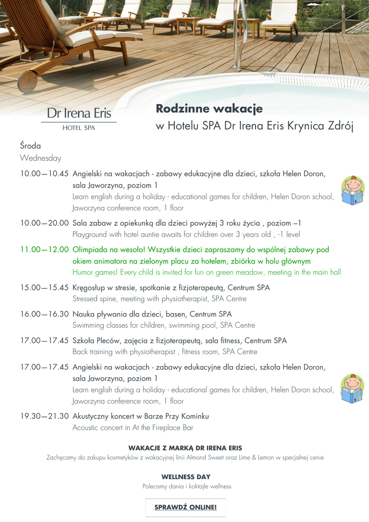 Rodzinne wakacje w Hotelu SPA Dr Irena Eris Krynica Zdrój Środa Wednesday 10.00—10.45 Angielski na wakacjach - zabawy edukacyjne dla dzieci, szkoła Helen Doron, sala Jaworzyna, poziom 1 Learn english during a holiday - educational games for children, Helen Doron school, Jaworzyna conference room, 1 floor 10.00—20.00 Sala zabaw z opiekunką dla dzieci powyżej 3 roku życia , poziom –1 Playground with hotel auntie awaits for children over 3 years old , -1 level 11.00—12.00 Olimpiada na wesoło! Wszystkie dzieci zapraszamy do wspólnej zabawy pod okiem animatora na zielonym placu za hotelem, zbiórka w holu głównym Humor games! Every child is invited for fun on green meadow, meeting in the main hall 15.00—15.45 Kręgosłup w stresie, spotkanie z fizjoterapeutą, Centrum SPA Stressed spine, meeting with physiotherapist, SPA Centre 16.00—16.30 Nauka pływania dla dzieci, basen, Centrum SPA Swimming classes for children, swimming pool, SPA Centre 17.00—17.45 Szkoła Pleców, zajęcia z fizjoterapeutą, sala fitness, Centrum SPA Back training with physiotherapist , fitness room, SPA Centre 17.00—17.45 Angielski na wakacjach - zabawy edukacyjne dla dzieci, szkoła Helen Doron, sala Jaworzyna, poziom 1 Learn english during a holiday - educational games for children, Helen Doron school, Jaworzyna conference room, 1 floor 19.30—21.30 Akustyczny koncert w Barze Przy Kominku Acoustic concert in At the Fireplace Bar WAKACJE Z MARKĄ DR IRENA ERIS Zachęcamy do zakupu kosmetyków z wakacyjnej linii Almond Sweet oraz Lime & Lemon w specjalnej cenie WELLNESS DAY Polecamy dania i koktajle wellness SPRAWDŹ ONLINE!