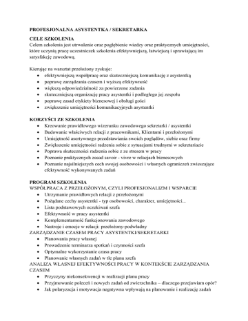 PROFESJONALNA ASYSTENTKA / SEKRETARKA CELE SZKOLENIA Celem szkolenia jest utrwalenie oraz pogłębienie wiedzy oraz praktycznych umiejętności, które uczynią pracę uczestniczek szkolenia efektywniejszą, łatwiejszą i sprawiającą im satysfakcję zawodową. Kierując na warsztat przełożony zyskuje: efektywniejszą współpracę oraz skuteczniejszą komunikację z asystentką poprawę zarządzania czasem i wyższą efektywność większą odpowiedzialność za powierzone zadania skuteczniejszą organizację pracy asystentki i podległego jej zespołu poprawę zasad etykiety biznesowej i obsługi gości zwiększenie umiejętności komunikacyjnych asystentki KORZYŚCI ZE SZKOLENIA Kreowanie prawidłowego wizerunku zawodowego sekretarki / asystentki Budowanie właściwych relacji z pracownikami, Klientami i przełożonymi Umiejętność asertywnego przedstawiania swoich poglądów, siebie oraz firmy Zwiększenie umiejętności radzenia sobie z sytuacjami trudnymi w sekretariacie Poprawa skuteczności radzenia sobie z ze stresem w pracy Poznanie praktycznych zasad savoir - vivre w relacjach biznesowych Poznanie najsilniejszych cech swojej osobowości i własnych ograniczeń zwieszające efektywność wykonywanych zadań PROGRAM SZKOLENIA WSPÓŁPRACA Z PRZEŁOŻONYM, CZYLI PROFESJONALIZM I WSPARCIE Utrzymanie prawidłowych relacji z przełożonymi Pożądane cechy asystentki - typ osobowości, charakter, umiejętności... Lista podstawowych oczekiwań szefa Efektywność w pracy asystentki Komplementarność funkcjonowania zawodowego Nastroje i emocje w relacji: przełożony-podwładny ZARZĄDZANIE CZASEM PRACY ASYSTENTKI/SEKRETARKI Planowania pracy własnej Prowadzenie terminarza spotkań i czynności szefa Optymalne wykorzystanie czasu pracy Planowanie własnych zadań w tle planu szefa ANALIZA WŁASNEJ EFEKTYWNOŚCI PRACY W KONTEKŚCIE ZARZĄDZANIA CZASEM Przyczyny niekonsekwencji w realizacji planu pracy Przyjmowanie poleceń i nowych zadań od zwierzchnika – dlaczego przejawiam opór? Jak polaryzacja i motywacja negatywna wpływają na planowanie i realizację zadań Dlaczego wiele odkładam na później? O syndromie samo utrudniania Określenie indywidualnych „złodziei” czasu, sposoby wyeliminowania przeszkód w efektywnym wykorzystaniu czasu ZASADY PLANOWANIA Układanie planu dziennego, tygodniowego i innych Korzyści wynikające z planowania Kontrola realizacji planu Określanie ramy czasowej dla realizacji zadania Planowanie rezerwy czasowej Ograniczanie wykonywania zadań do priorytetów ZASADY USTALANIA PRIORYTETÓW Korzyści wynikające ze znajomości własnych priorytetów Analiza wartości nakładu czasu ABC Ustalanie własnych priorytetów Czas czerwony i czas zielony Czas zarezerwowany i czas dostępny Konsekwencja w realizacji priorytetów Co zrobić z zadaniami, których nie udało się zrealizować ETYKIETA BIZNESOWA I SAVOIR VIVRE Zasady pierwszeństwa w kontaktach Przedstawianie, anonsowanie, umawianie – jak nie popełnić faux pas Wymiana wizytówek, powitania, tytułowanie Zasady jazdy samochodem i transportu Ceremoniał – ceremonie oficjalne, przebieg i organizacja uroczystości Organizacja spotkań oficjalnych, wyjazdów i wizyt Procedencja – zasady ustalania pierwszeństwa Spotkania towarzysko – służbowe Delegacje - dobór uczestników delegacji SPOTKANIA I PRZYJĘCIA - ORGANIZACJA I UCZESTNICZENIE Formy przyjęć i ich miejsca Zaproszenia Dobór gości Stół i nakrycia - instrukcja obsługi Menu oraz dobór alkoholi i napoi Oprawa i obsługa Rola i obowiązki gospodarza i gościa Aperitif / posiłek / digestif - zachowanie Błędy w etykiecie i języku stołu CODZIENNY SAVOIR VIVRE Telefon E-mail Telefoniczny savoir vivre Etykieta Jak reagować na gafy POWITANIA, POŻEGNANIA, PREZENTACJE – KULTURA DNIA CODZIENNEGO Znaczenie pierwszego wrażenia w kontaktach z innymi Wizyty oficjalne i nieoficjalne w instytucji Zasady właściwego powitania i pożegnania gościa Sposoby witania, podanie ręki – zasady pierwszeństwa Jak należy powitać, podjąć i pożegnać gościa honorowego? Kłopotliwy „gość” w instytucie Sposoby prezentacji Zasady i wyjątki Przechodzenie na „Ty” Zasady używania biletów wizytowych Tytuły kurtuazyjne, naukowe, służbowe, honorowe BUDOWA WIZERUNKU I DOSKONALENIE IMAGE PROFESJONALNEJ ASYSTENTKI/SEKRETARKI Strefy odległości w kontaktach interpersonalnych Komunikacja niewerbalna a typy uścisków dłoni i ich znaczenie Jak uniknąć gafy Cmok nonsens i gesty kulturowe TRENING ASERTYWNOŚCI I KOMUNIKACJA W PRACY ASYSTENTKI Istota i zasady asertywności i prawa asertywności w sytuacji zawodowej w zawodzie asystentki Konstruktywne wyrażanie swojego zdania bez wywoływania konfliktu Asertywność jako sztuka respektowania granic i budowania pozytywnej samooceny Radzenie sobie w trudnych sytuacjach z klientami wewnętrznymi i zewnętrznymi Porozumienie z trudnymi klientami (rozpoznawanie charakteru rozmówcy, adekwatny przekaz i odbiór informacji, dostosowanie strategii bezpośredniej do rozmówcy OBJAWY STRESU, CZYLI PO CZYM POZNAĆ, ŻE JESTEŚMY POD WPŁYWEM STRESU? Reakcje fizyczne Reakcje psychologiczne Zmiany w zachowaniu TYPOWE REAKCJE NA STRES, CZYLI JAK FUNKCJONUJEMY W TRUDNYCH SYTUACJACH? Emocjonalne vs zadaniowe nastawienie do stresu Strategia poznawcza Strategia emocjonalna Fantazje, myślenie życzeniowe Współdziałanie z innymi SPOSOBY ZAPOBIEGANIA I RADZENIA SOBIE Z EMOCJAMI I STRESEM Sposoby wypierania emocji (racjonalizacja, projekcja, stłumienie, przemieszczenie) Tłumienie a transformowanie emocji Identyfikowanie własnego wzorca Sytuacja wewnętrzna a sytuacja zewnętrzna Zarządzanie emocjami w sytuacjach trudnych, czyli jak radzić sobie ze złością i innymi emocjami Rola wyrażania emocji i odreagowywania napięcia Szybkie sposoby pozbywania się negatywnych emocji Wyrażanie emocji pozytywnych Psychosomatyczne konsekwencje obciążenia stresem Autodiagnoza indywidualnych obszar