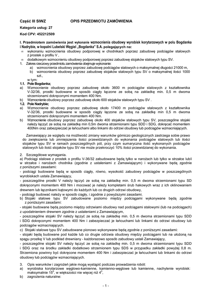 Część III SIWZ OPIS PRZEDMIOTU ZAMÓWIENIA Kategoria usług: 27 Kod CPV: 452212509 I. Przedmiotem zamówienia jest wykonanie wzmocnienia obudowy wyrobisk korytarzowych w polu Bogdanka i Nadrybie, w kopalni Lubelski Węgiel „Bogdanka” S.A. polegających na: • wykonaniu wzmocnienia obudowy podporowej w chodnikach poprzez zabudowę podciągów stalowych z prostek o profilu V , • dodatkowym wzmocnieniu obudowy podporowej poprzez zabudowę stojaków stalowych typu SV. 1. Zakres rzeczowy przedmiotu zamówienia obejmuje wykonanie: a) wzmocnienia obudowy poprzez zabudowę podciągów stalowych o maksymalnej długości 21000 m, b) wzmocnienia obudowy poprzez zabudowę stojaków stalowych typu SV o maksymalnej ilości 1000 szt., w tym: 1.1. Pole Bogdanka; a) Wzmocnienie obudowy poprzez zabudowę około 3600 m podciągów stalowych z kształtownika V-32/36, prostki budowane w sposób ciągły łączone ze sobą na zakładkę min. 0,5 m dwoma strzemionami dokręconymi momentem 400 Nm. b) Wzmocnienie obudowy poprzez zabudowę około 600 stojaków stalowych typu SV . 1.2. Pole Nadrybie; a) Wzmocnienie obudowy poprzez zabudowę około 17400 m podciągów stalowych z kształtownika V-32/36, prostki budowane w sposób ciągły łączone ze sobą na zakładkę min 0,5 m dwoma strzemionami dokręconymi momentem 400 Nm. b) Wzmocnienie obudowy poprzez zabudowę około 400 stojaków stalowych typu SV, poszczególne stojaki należy łączyć ze sobą na zakładkę min 0,5m dwoma strzemionami typu SDD i SDG, dokręcać momentem 400Nm oraz zabezpieczać je łańcuchami albo linkami do odrzwi obudowy lub podciągów wzmacniających. Zamawiający ze względu na możliwość zmiany warunków górniczo geologicznych zastrzega sobie prawo do zwiększenia lub zmniejszenia ilości przewidzianych do wykonania podciągów stalowych lub ilości stojaków typu SV w ramach poszczególnych pól, przy czym sumaryczna ilość wykonanych podciągów stalowych lub ilość stojaków typu SV nie może przekroczyć 10% ilości przewidzianej do wykonania. 2. Szczegółowe wymagania. a) Podciągi stalowe z prostek o profilu V-36/32 zabudowane będą tylko w narożach lub tylko w strzałce lub/i w strzałce i narożach chodnika (zgodnie z ustaleniami z Zamawiającym) i wykonywane będą zgodnie z poniższymi zasadami: - podciągi budowane będą w sposób ciągły, równo, wysokość zabudowy podciągów w poszczególnych wyrobiskach ustala Zamawiający, - poszczególne prostki V należy łączyć ze sobą na zakładkę min. 0,5 m dwoma strzemionami typu SD dokręconymi momentem 400 Nm i mocować je należy kompletami śrub hakowych wraz z ich oklinowaniem drewnem lub łącznikami kątowymi do każdych lub co drugich odrzwi obudowy, - podciągi budować należy w sposób ciągły, i zgodnie z powyższymi zasadami. b) Stojaki stalowe typu SV zabudowane poziomo między podciągami wykonywane będą zgodnie z poniższymi zasadami: - stojaki budowane będą poziomo między odrzwiami obudowy nad podciągami stalowymi (lub na podciągach) z upodatnieniem drewnem zgodnie z ustaleniami z Zamawiającym, - poszczególne stojaki SV należy łączyć ze sobą na zakładkę min. 0,5 m dwoma strzemionami typu SDD i SDG dokręconymi momentem 400 Nm i zabezpieczać je łańcuchami lub linkami do odrzwi obudowy lub podciągów wzmacniających. c) Stojaki stalowe typu SV zabudowane pionowo wykonywane będą zgodnie z poniższymi zasadami: - stojaki będą budowane pod każde lub co drugie odrzwia obudowy między podciągami lub na ułożoną na spągu prostkę V lub podkład drewniany - każdorazowo sposób zabudowy ustali Zamawiający, - poszczególne stojaki SV należy łączyć ze sobą na zakładkę min. 0,5 m dwoma strzemionami typu SDD i SDG oraz na środku zakładki dodatkowo strzemionem typu SDS w przypadku zakładki powyżej 0,8 m. Strzemiona powinny być dokręcone momentem 400 Nm i zabezpieczać je łańcuchami lub linkami do odrzwi obudowy lub podciągów wzmacniających. 3. a) b) Opis warunków i zagrożeń jakie mogą wystąpić podczas prowadzenia robót: wyrobiska korytarzowe węglowo-kamienne, kamienno-węglowe lub kamienne, nachylenie wyrobisk: 0 0 maksymalnie 15 , w większości nie więcej niż 4 , zagrożenia naturalne: -1- − − − − − − c) − − − metanowe → I kategoria, wyrobiska ze stopniem „a” i „b” niebezpieczeństwa wybuchu metanu, wybuchem pyłu węglowego → klasa A i B, wodne → I stopień, pożarowe → IV grupa samozapalności, pyłami szkodliwymi dla zdrowia → przewidywana kategoria A, B i C, pozostałe zagrożenia naturalne → możliwość wystąpienia skróconego czasu pracy na niektórych stanowiskach, urządzenia zabudowane w wyrobiskach: trasy kolejek podwieszonych (w tym trasy, po których prowadzone są jazdy ludzi), przenośniki taśmowe, rurociągi ciśnieniowe, odwadniające i ppoż. (Φ50, Φ 80, Φ100, Φ150). II. Informacje dodatkowe. 1. Wykonawca będzie realizował przedmiot zamówienia zgodnie z: a) Prawem geologiczno−górniczym oraz przepisami wykonawczymi wydanymi na jego podstawie. b) Planem ruchu Zakładu Górniczego i zasadami techniki górniczej. c) Projektami technicznymi, dokumentacjami techniczno - ruchowymi, zarządzeniami i poleceniami, instrukcjami i technologiami obowiązującymi u Zamawiającego niezbędnymi do realizacji umowy. d) Kodeksem Pracy. e) Regulaminem Pracy oraz Dokumentem Bezpieczeństwa obowiązującym u Zamawiającego. f) Przepisami BHP. g) Kartą Zgodności Prowadzenia Robót. h) Polskimi Normami. 2. Rejony robót zostaną przekazane Wykonawcy w terminie wyznaczonym przez Zamawiającego. Przekazanie Wykonawcy rejonu robót wymagać będzie potwierdzenia w formie pisemnego protokołu przekazania, podlegającego podpisaniu przez upoważnionych przedstawicieli stron. 3. Roboty realizowane przez Wykonawcę rozliczane będą protokolarnie w okresach miesięcznych. Czynności odbioru robót będą przeprowadzane przez Zamawiającego z udzia
