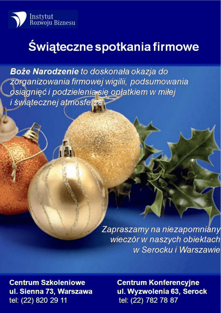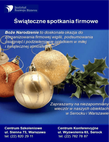 Wariant I Spotkanie Wigilijne Cena 90,00 90,00 zł netto Bufet zimny Teryny Royal z krabami i warzywami Śledzie w kwaśnej śmietanie z winnymi jabłkami Ryba faszerowana w osnowie jajecznej z ziołami Roladki z ryb wędzonych w cieście koperkowym i pikantnym sosie pomidorowym Sałatka galicyjska z jajek, groszku i wędzonego łososia Sałatka ze szpinaku z suszonymi pomidorami i serem parmezan Babeczki kruche słone z pastą tuńczykową Pieczywo, masło Bufet ciepły Zupa z grzybów leśnych z łazankami Filet z łososia pieczony w świeŜym tymianku z sosem serowym gorgonzola Karp wigilijny smaŜony Postna kapusta w oliwie i suszonych grzybach Pierogi z kapustą i grzybami Desery: Desery Ciasta świąteczne Kutia z bakaliami Owoce Napoje Kompot z suszu 200 ml Woda mineralna 200 ml Soki owocowe 200 ml Kawa naturalna, herbata Wariant II Spotkanie Wigilijne Cena 80,00 80,00 zł netto Zimny bufet Karp po Ŝydowsku Tatar ze śledzia imbirowy Śledź w oliwie z cebulą Pomidory nadziewane pikantną sałatką z tuńczyka Sałatka jarzynowa tradycyjna Sałatka z makaronu sojowego z paluszkami krabowymi Masło, pieczywo mieszane Sos tatarski i chrzanowy Dania ciepłe podane na bufecie Barszcz wigilijny z grzybami leśnymi Łosoś pieczony w sosie holenderskim z kaparami Pierogi z kapustą i grzybami Desery Ciasta domowe: keks, piernik staropolski , sernik Koktajl owocowy z suszonymi owocami Napoje Kompot z suszu Woda mineralna Soki owocowe Kawa ze śmietanką Herbata z cytryną Wariant III Spotkanie Wigilijne Cena 75,00 75,00 zł netto Bufet zimny Kokardy z łososia w kryształowej galarecie Śledzie bałtyckie w wiejskiej śmietanie i oliwie ziołowej Jaja faszerowane z kawiorem czarnym i czerwonym Jarzynowa układanka Sałatka tuńczykowa z makaronem Pieczywo mieszane Sos tatarski i chrzanowy, masło Bufet ciepły Barszcz czerwony z francuskimi paluchami Karp w śmietanie z tłuczonym pieprzem i ziemniakami Postna kapusta z grzybami Desery: Desery Wybór ciast : makowiec, szarlotka z cynamonem, piernik przekładany Krojone owoce Napoje Kompot z suszu 200 ml Woda mineralna 200 ml Soki owocowe 200 ml Kawa naturalna, herbata Wariant IV Spotkanie Wigilijne Cena 75,00 75,00 zł netto Kompozycja wigilijnych przekąsek przekąsek Delikatne tymbaliki z łososia z cytryną i koperkiem Jaja faszerowane z czerwonym i czarnym kawiorem Filety śledziowe w pachnącej jabłkami i korniszonami jogurtowej śmietanie Zestaw surówek i sałatek Warstwowa sałatka z tuńczyka, kukurydzy, pora z Ŝółtym serem i jajem Warzywa blanszowane z sosem jogurtowym Szpinak z suszonymi pomidorami Danie ciepłe Okoń w sosie pieczarkowym Kapusta z grzybami Dodatki ŚwieŜe bułeczki, chleb jasny i ciemny Desery Wybór ciast : makowiec, szarlotka z cynamonem, puszysty sernik Krojone owoce Napoje Woda mineralna 200 ml Soki owocowe 200 ml Kawa naturalna, herbata Wariant V Spotkanie Wigilijne Cena 80,00 80,00 zł netto Zimny bufet Karp królewski w naturalnej galarecie Ruloniki z wędzonego łososia z kremem chrzanowym Śledź w oliwie ziołowej z nutą octu balsamicznego Wybór serów z winogronami , orzechem włoskim i suszonymi śliwkami Sałatka jarzynowa tradycyjna Sałatka z grubo pokrojonymi filetami śledzia, kiszonymi ogórkami, ziemniakami, groszkiem, jabłkiem i pieczarkami marynowanymi ŚwieŜe bułeczki, chleb jasny i ciemny Dania ciepłe podane na bufecie Łosoś pieczony w pieprzu Cayenne na grillowanych warzywach Pierogi z kapustą i grzybami obsmaŜane Desery Ciasta domowe: keks, piernik staropolski , sernik Kutia z miodem, migdałami , orzechami Napoje Kompot z suszu Woda mineralna Soki owocowe Kawa ze śmietanką Herbata z cytryną