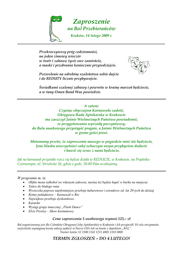 Zaproszenie na Bal Przebierańców Kraków, 14 lutego 2009 r. ________________________________________________ Przekroczywszy próg codzienności, na jeden zimowy wieczór w teatr i zabawę życie swe zamieńcie, a maski i przebrania koniecznie przywdziejcie. Pozwolenie na odrobinę szaleństwa sobie dajcie i do REDUTY licznie przybywajcie. Świadkami szalonej zabawy i powrotu w krainę marzeń będziecie, a w tany Omen Band Was powiedzie. A zatem: Czyniąc obyczajom Karnawału zadość, Okręgowa Rada Aptekarska w Krakowie ma zaszczyt Jaśnie Wielmożnych Państwa powiadomić, że przygotowania wprzódy poczyniwszy, do Balu maskowego przystąpić pragnie, a Jaśnie Wielmożnych Państwa w grono gości prosi. Mniemamy przeto, że zaproszenia naszego w pogardzie mieć nie będziecie, Jeno blasku uroczystości całej ochoczym swym przybyciem dodacie i bawić się wraz z nami będziecie. Jak na karnawał przystało rzecz się będzie działa w REDUCIE, w Krakowie, na Prądniku Czerwonym, ul. Strzelców 26, gdzie o godz. 20.00 Was oczekujemy. W programie m. in. • • • • • • • • Obfite menu (alkohol we własnym zakresie, można też będzie kupić w barku na miejscu) Tańce do białego rana Wycieczka poprzez najsłynniejsze przeboje kabaretowe i estradowe od lat 20-tych do dzisiaj Rytmy południowe – Karnawał w Rio Największe przeboje dyskotekowe Karaoke Występ grupy tanecznej „Flash Dance” Elvis Presley – Show kostiumowy Cena zaproszenia 1-osobowego wynosi 125,– zł Bal organizowany jest dla Członków Okręgowej Izby Aptekarskiej w Krakowie i Ich przyjaciół. W celu otrzymania wejściówki wymaganą kwotę należy wpłacić w biurze OIA lub na konto z dopiskiem „BAL”. Numer konta: 52 1500 1142 1211 4005 1333 0000 TERMIN ZGŁOSZEŃ – DO 4 LUTEGO!