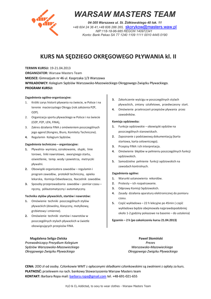 WARSAW MASTERS TEAM 04-305 Warszawa ul. St. Żółkiewskiego 40 lok. 11 +48 604 24 36 41,+48 606 286 265, [email protected] NIP:118-18-96-985 REGON 140972341 Konto: Bank Pekao SA 77 1240 1109 1111 0010 4445 0190 KURS NA SĘDZIEGO OKRĘGOWEGO PŁYWANIA kl. II TERMIN KURSU: 19-21.04.2013 ORGANIZATOR: Warsaw Masters Team MIEJSCE: Gimnazjum nr 46 ul. Kasprzaka 1/3 Warszawa WYKŁADOWCY: Kolegium Sędziów Warszawsko-Mazowieckiego Okręgowego Związku Pływackiego. PROGRAM KURSU: Zagadnienia ogólno-organizacyjne: 1. Krótki zarys historii pływania na świecie, w Polsce i na terenie macierzystego Okręgu (rok założenia PZP, OZP). 2. 3. 3. pływackich, zmiany sztafetowe, przedwczesny start. 4. (OZP, PZP, LEN, FINA), Komisja sędziowska: Zakres działania FINA z omówieniem poszczególnych 1. Regulamin Kolegium Sędziów. Zagadnienia techniczno – organizacyjne: 1. Pływalnia- wymiary, oznakowanie, słupki, linie torowe, linki nawrotowe, awaryjnego startu, oświetlenie, temp. wody i powietrza, metryczki pływalni. 2. 3. Zapoznanie z podstawową dokumentacją (karta startowa, karta celowniczego). 3. Przepisy FINA i ich interpretacja. 4. Omówienie błędów w pełnieniu poszczególnych funkcji sędziowskich. 5. Samodzielne pełnienie funkcji sędziowskich na zawodach kontrolnych. program zawodów, protokół techniczny, opieka Zagadnienia ogólne: lekarska, Komisja Odwoławcza, Naczelnik zawodów. 1. Warunki ustanowienia rekordów. Sposoby przeprowadzania zawodów – pomiar czasu – 2. Protesty – ich rozpatrywanie. ręczny, półautomatyczny i automatyczny. 3. Odprawy Komisji Sędziowskich. 4. Zasady działania aparatury elektronicznej do pomiaru Omówienie techniki poszczególnych stylów pływackich (dowolny, klasyczny, motylkowy, grzbietowy i zmienne). 2. Funkcje sędziowskie – obowiązki sędziów na poszczególnych stanowiskach. 2. Obowiązki organizatora zawodów – regulamin i Technika stylów pływackich, startów i nawrotów: 1. Omówienie przekroczeń przepisów pływania przez zawodników. Organizacja sportu pływackiego w Polsce i na świecie jego agend (Kongres, Biuro, Komitety Techniczne). 4. Zakończenie wyścigu w poszczególnych stylach Omówienie techniki startów i nawrotów w poszczególnych stylach pływackich w świetle czasu. 5. Część wykładowa – 22 h lekcyjne po 45min ( część wykładowa będzie obejmowała najprawdopodobniej około 1-2 godziny pokazowe na basenie – do ustalenia) Egzamin – 2 h (po zakończeniu kursu 21.04.2013) obowiązujących przepisów FINA. Magdalena Seliga-Zielska Przewodniczący Prezydium Kolegium Sędziów Warszawsko-Mazowieckiego Okręgowego Związku Pływackiego Paweł Słomiński Prezes Warszawsko-Mazowieckiego Okręgowego Związku Pływackiego CENA: 2OO zł od osoby. Członkowie WMT z opłaconymi składkami członkowskimi są zwolnieni z opłaty za kurs. PŁATNOSĆ: przelewem na rach. bankowy Stowarzyszenia Warsaw Masters team KONTAKT: Barbara Ropa mail: [email protected] tel. +48-691-021-655 H2O & Cl2 Addicted, to sexy to wear clothes - Warsaw Masters Team