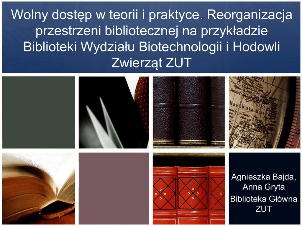 Wolny dostęp w teorii i praktyce. Reorganizacja przestrzeni bibliotecznej na przykładzie Biblioteki Wydziału Biotechnologii i Hodowli Zwierząt ZUT Agnieszka Bajda, Anna Gryta Biblioteka Główna ZUT PIERWSZE BIBLIOTEKI Z WOLNYM DOSTĘPEM W USA • 1879 Biblioteka Publiczna w Patwucket; • 1890 Biblioteka Publiczna w Cleveland; • 1895 Biblioteka Publiczna w Filadelfii. PIERWSZE BIBLIOTEKI Z WOLNYM DOSTĘPEM W EUROPIE • • • • • • • • 1894 Anglia 1900 Dania 1902 Norwegia 1908 Szwecja 1909 Niemcy 1918 Hiszpania 1919 Finlandia 1929 Czechosłowacja KSZTAŁTOWANIE SIĘ NAZWY • 1877 – open access (ang.) – wolny dostęp; • 1879 – access to shelves (ang.) – dostęp do półek; • 1880 – open shelves (ang.) – wolne półki; • 1907 – Freihandbucherei (niem.) – biblioteka wolnej ręki; • Później freier Zugang (niem.) – wolny dostęp – odpowiednik ang. open access. ZASADY ORGANIZACJI WOLNEGO DOSTĘPU • Zachowanie układu rzeczowego zbiorów; • Udostępnianie najbardziej aktualnych zbiorów; • Stałe i systematyczne utrzymywanie porządku na półkach; • Natychmiastowe włączanie zwróconych dokumentów do zbiorów; • Potrzebna większa ilość miejsca niż w tradycyjnym magazynie. ZASDADY ORGANIZACJI WOLNEGO DOSTĘPU • Konieczność lepszego zabezpieczenia zbiorów; • Wyłączanie z wolnego dostępu książek przestarzałych, lub bardzo cennych; • Wyraźne formy informacji wizualnej – zbiory dokumentów na półkach powinny być opatrzone czytelnymi z daleka znakami, najlepiej różnobarwnymi, wyróżniającymi poszczególne układy zbiorów. BIBLIOTEKA CHEMICZNA POLITECHNIKI SZCZECIŃSKIEJ • Biblioteka wydziałowa gromadząca księgozbiór z dziedziny chemii i nauk pokrewnych; • Księgozbiór liczy ponad 22 tys. wol. wydawnictw zwartych i 23 tys. wol. wydawnictw ciągłych; • Na Wydziale Technologii i Inżynierii Chemicznej studiuje blisko 900 studentów; • Roczna liczba odwiedzin ok. 10 tys. BIBLIOTEKA CHEMICZNA POLITECHNIKI SZCZECIŃSKIEJ PRZYKŁADOWE OZNACZENIA DZIAŁÓW NT – Technologia Nieorganiczna OT – Technologia Organiczna WS – Włókna Sztuczne OS – Technologia Środków Spożywczych SYGNATURA 2 BIBLIOTEKA WYDZIAŁU BIOTECHNOLOGII I HODOWLI ZWIERZĄT • Biblioteka wydziałowa gromadząca księgozbiór z dziedzin: biologii, biotechnologii, hodowli zwierząt oraz ich fizjologii, anatomii i żywienia; • Księgozbiór biblioteki liczy 5000 woluminów wydawnictw zwartych; • Liczba tytułów prenumerowanych czasopism drukowanych – 19; • Na Wydziale BiHZ studiuje blisko 900 studentów. BIBLIOTEKA WBIHZ PO ZMIANACH Sala książek Sala czasopism WYDZIELONE DZIAŁY KSIĄŻEK I. Biotechnologia z technologią żywności II. Biologia i mikrobiologia III. Hodowla zwierząt, choroby i profilaktyka oraz paszoznawstwo IV. Agroturystyka i ochrona środowiska V. Różne (w tym chemia i matematyka) VI. Słowniki i encyklopedie BADANIA ANKIETOWE • Ankieta o charakterze pilotażowym; • Cele badania: - Poznanie wstępnych opinii użytkowników o nowym kształcie czytelni; - Zweryfikowanie ankiety – czy spełnia swe zadania. BADANIA ANKIETOWE • - Pytania skoncentrowane wokół kwestii: korzystanie z katalogu ALEPH; odbiór wolnego dostępu; oczekiwania wobec bibliotekarza. BADANIA ANKIETOWE - PODSUMOWANIE • Użytkownikom biblioteki podoba się obecny jej kształt i dobrze czują się w systemie wolnego dostępu; • Nie mają problemu ze znalezieniem książek o określonej tematyce, a układ zbiorów oceniają jako logiczny; • Korzystanie z katalogu elektronicznego oceniają jako proste; • Użytkownicy wolą sytuację, w której mogą zlecić bibliotekarzowi wyszukiwanie konkretnych materiałów. BADANIA ANKIETOWE - PODSUMOWANIE 1-ocena pozytywna 0-ocena neutralna -1-ocena negatywna 34 2 2 18 9 11 26 4 8 32 1 5 8 2 28 35 1 1 36 1 1 27 6 5 29 8 1 245 34 62 BADANIA ANKIETOWE PODSUMOWANIE 18% 10% 72% 1-ocena pozytywna 0-ocena neutralna -1-ocena negatywna Dziękujemy za uwagę