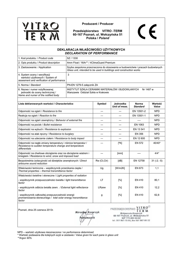 Producent / Producer Przedsiębiorstwo VITRO -TERM 60-167 Poznań, ul. Wołczyńska 51 Polska / Poland DEKLARACJA WŁAŚCIWOŚCI UŻYTKOWYCH DECLARATION OF PERFORMANCE 1. Kod produktu: / Product code SZ / 1330 2. Opis produktu / Product description 4mm Float / 16Ar** / 4ClimaGuard Premium 3. Zastosowanie: / Application Szyba zespolona przeznaczona do stosowania w budownictwie i pracach budowlanych Glass unit, intended to be used in buildings and construction works 4. System oceny i weryfikacji wartości użytkowych / System of assesment and verification of performance 3 5. Norma / Standard PN-EN 1279-5 załącznik ZA 6. Nazwa i numer notyfikowanej jednostki ds oceny technicznej / Name and numer of the notified body INSTYTUT SZKŁA CERAMIKI MATERIAŁÓW I BUDOWLANYCH Warszawie Oddział Szkła w Krakowie Lista deklarowanych wartości / Characteristics Odporność na ogień / Resistance to fire Nr 1487 w Symbol Jednostka Unit of meas. Norma Standard Wartość Value --- --- EN 13501-2 NPD Reakcja na ogień / Reaction to fire --- --- EN 13501-1 NPD Odporność na ogień zewnętrzny / Behavior of external fire --- --- ---- NPD Odporność na pocisk / Bullet resistance --- --- EN 1063 NPD Odporność na wybuch / Resistance to explosion --- --- EN 13 541 NPD Odporność na atak ręczny / Resistance to burglary --- --- EN 356 NPD Odporność na uderzenie ciałem / Resistance to body impact --- --- EN 12 600 NPD Odporność na nagłe zmiany temperatury i różnice temperatur / Resistance to sudden temperature change and temperature differentials --- [ºK] EN 572 40/40* Odporność na chwilowe obciążenie oraz na obciążenie wiatrem i śniegiem / Resistance to wind, snow and imposed load --- [mm] ---- 4/4* Rw (Ct,Ctr) [dB] EN 12758 31 (-2; -5) Ug [W/m2K] EN 673 1,1 LT [%] EN 410 80,1 - współczynnik odbicia światła zewn. / External light reflectance factor LRzew [%] EN 410 12,2 - współczynnik całkowitej przepuszczalność energii promieniowania słonecznego / total solar energy transmittance factor g [%] EN 410 62,8 Bezpośrednia izolacyjność od dźwięków zewnętrznych / Direct airbourne sound reduction Właściwości termiczne – współczynnik przenikania ciepła / Thermal properties – thermal transmittance factor Właściwości świetlne i słoneczne / Light properties of radiation - współczynnik przepuszczalności światła / light transmittance factor Poznań, dnia 25 czerwca 2013r. NPD – wartość użytkowa nieoznaczona / no performance determined; * Wartość podawana dla kolejnych szyb w zestawie / Value given for each pane in glass unit **Argon 90%