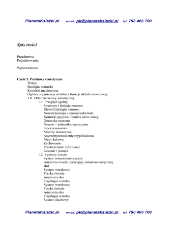 PlanetaKsiążki.pl email: [email protected] tel: 798 466 700 tel: 798 466 700 Spis treści Przedmowa Podziękowania Wprowadzenie Część I. Podstawy teoretyczne Wstęp Biologia komórki Komórki macierzyste Ogólna organizacja struktur i funkcji układu nerwowego 1.0. Układ nerwowy somatyczny 1.1. Przegląd ogólny Struktury i funkcje neuronu Elekrofizjologia neuronu Neurotranmisja i neuroprzekaźniki Komórki glejowe i bariera krew-mózg Genetyka neuronu Neuron – jednostka operacyjna Sieci neuronowe Moduły neuronowe Asymetryczność międzypółkulowa Mapy korowe Zachowanie Przetwarzanie informacji Uczenie i pamięć 1.2. Systemy czucia System somatosensoryczny Anatomia czucia i percepcji somatosensorycznej Ból System wzrokowy Fizyka światła Anatomia oka Fizjologia wzroku System wzrokowy Fizyka światła Anatomia oka Fizjologia wzroku System słuchowy PlanetaKsiążki.pl email: [email protected] PlanetaKsiążki.pl email: [email protected] tel: 798 466 700 Fizyka dźwięku Anatomia ucha Fizjologia słuchu 1.3. Neurofizjologiczne mechanizmy kontroli ruchu Jednostka ruchowa mięśnia szkieletowego Rekrutacja i częstotliwość wyładowań jednostek ruchowych Receptory związane z rozciąganiem i skurczem mięśnia szkieletowego Neuromechanizmy odruchów rdzeniowych Funkcje kory ruchowej związane z kontrolą ruchu Struktury i funkcje móżdżku i jąder podstawowych związane z ruchem Poziomy integracyjne układu nerwowego związane z kontrolą ruchu Zaburzenia neuromechanizmów kontroli ruchu Struktury i funkcje układu równowagi Organizacja ośrodkowych dróg nerwowych ruchowych Chód i ośrodkowy generator wzorca lokomocji 1.4. Plastyczność i regeneracja układu nerwowego Plastyczność jednostki ruchowej Plastyczność neuronu Plastyczność mózgu 2.0. Układ nerwowy autonomiczny 2.1. Struktury anatomiczne 2.2. Neurofizjologiczne mechanizmy funkcji wegetatywnych 2.3. Mięśnie gładkie 2.4. Neurosekrecje Część II. Praktyka Wprowadzenie 3.1.Urządzenia i testy instrumentalne Uniwersalny aparat fizykoterapeutyczny Elektrody do elektrodiagnostyki klasycznej Systemy komputerowe do badań nuerofizjologicznych Elektrody do rejestracji potencjałów czynnościowych Elektrody do symulacji przezskórnej nerwów obwodowych Elektrody uziemiające Elektrody specjalne Aparaty do stymulacji magnetycznej Urządzenia do badań chodu Urządzenia do badań równowagi ciała 3.2. Testy instrumentalne Elektrodiagnostyka klasyczna Elektromiografia Polieletromiografia Elektroneurografia Przewodnictwo nerwowego Transmisja nerwowo-mięśniowa PlanetaKsiążki.pl email: [email protected] tel: 798 466 700 PlanetaKsiążki.pl email: [email protected] tel: 798 466 700 Odruch Hoffmanna Fala F Toniczny odruch wibracyjny Odruch mrugania Necyceptywny odruch zgięciowy Współczulna odpowiedź skórna Elektroencefalografia Magnetoencefalografia Potencjały wywołane Badania chodu Modulacja odruchu Hoffmanna Badania równowagi ciała Test dwóch wag Posturografia statyczna vs stabilografia Posturografia dynamiczna Antycypacja przystosowania posturalnego 4.0. Protokoły testów instrumentalnych 4.1. Czynności przygotowawcze 4.2. Przykłady protokołów Badanie reobazy i chronaksji Obliczanie współczynnika akomodacji Wykreślenie krzywej i/t Badanie elektromiograficzne (EMG) Badanie poliektromiograficzne (PEMG) Badanie transmisji nerwowo-mięśniowej Badanie szybkości przewodnictwa ruchowego Badanie szybkości przewodnictwa czuciowego Badanie somatosensorzcynych potencjałów wywołanych (SEP) Badanie SEP stymulacją nerwu pośrodkowego Badanie SEP stymulacją nerwu strzałkowego Badanie dermatomalnych somatosesnorycznych potencjałów wywołanych Badanie wzrokowych potencjałów wywołanych Badanie słuchowych potencjałów wywołanych Badanie ruchowych potencjałów wywołanych Badanie nocyceptywnego odruchu zgięciowego Badanie współczulnej odpowiedzi skórnej Badanie równowagi ciała testem dwóch wag Posturografia statyczna (stabilografia) Posturografia dynamiczna Antycypacja przystosowania posturalnego 5.0. Zasady bezpieczeństwa i higieny w pracy Zagrożenia techniczne Zagrożenia biologiczne Część III. Klinika 6.0 Wprowadzenie PlanetaKsiążki.pl email: [email protected] tel: 798 466 700 PlanetaKsiążki.pl email: [email protected] tel: 798 466 700 6.1. Udar mózgu Okres ostry udaru mózgu Okresy poudarowej rekonwalescencji Metody neurofizjatryczne odtwarzania resztkowych funkcji ruchowych 6.2. Uszkodzenie rdzenia kręgowego Dyskompletne uszkodzenie rdzenia kręgowego Dysfunkcje autonomiczne po uszkodzeniu rdzenia kręgowego 6.3. Kierunki postępowania terapeutycznego Farmakterapia Przeszczepy Kinezyterapia 6.4. Elektroterapia Elektrostymulacja nerwu przezskórna (TENS) Elektrostymulacja funkcjonalana (FES) Elektrostymulacja nerwowo-mięśniowa (NMS) Elektrostymulacja w zaburzeniach funkcji zwieraczy Elektrostymulacja nadoponowa rdzenia kręgowego Przezczaszkowa stymulacja magnetyczna mózgu Zakończenie Wykaz skrótów Piśmiennictwo Słownik najważniejszych terminów Skorowidz PlanetaKsiążki.pl email: [email protected] tel: 798 466 700