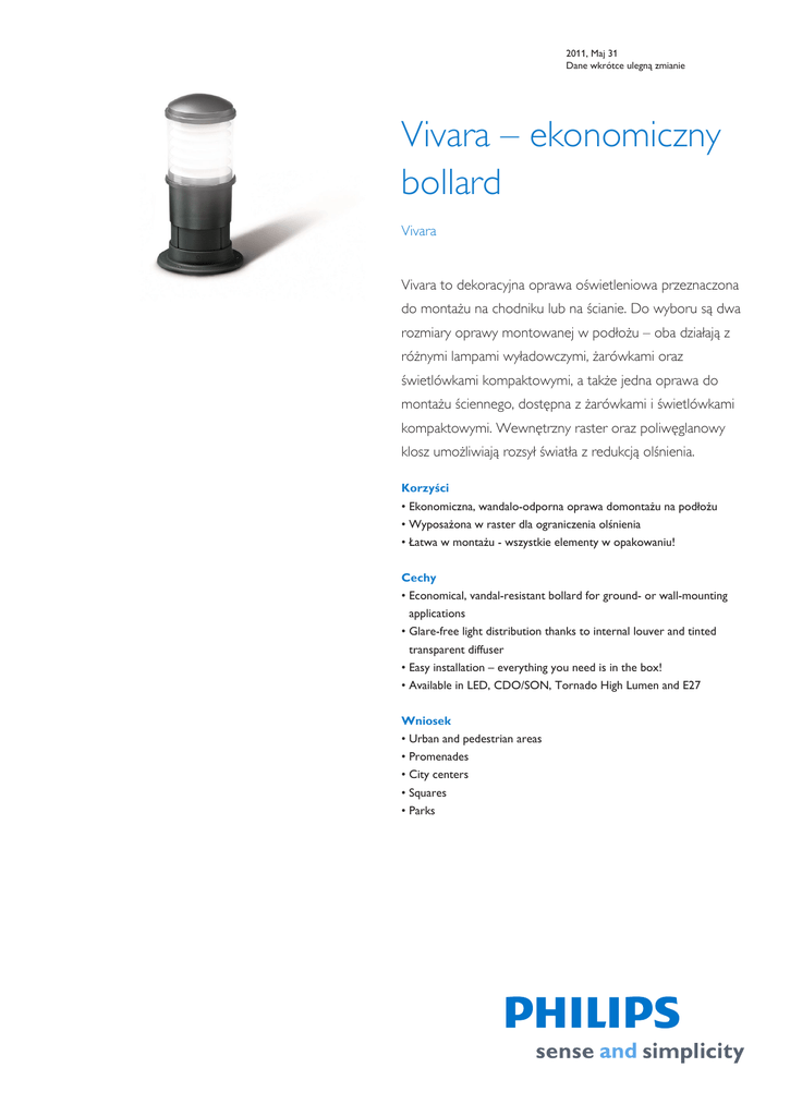 2011, Maj 31 Dane wkrótce ulegną zmianie Vivara – ekonomiczny bollard Vivara Vivara to dekoracyjna oprawa oświetleniowa przeznaczona do montażu na chodniku lub na ścianie. Do wyboru są dwa rozmiary oprawy montowanej w podłożu – oba działają z różnymi lampami wyładowczymi, żarówkami oraz świetlówkami kompaktowymi, a także jedna oprawa do montażu ściennego, dostępna z żarówkami i świetlówkami kompaktowymi. Wewnętrzny raster oraz poliwęglanowy klosz umożliwiają rozsył światła z redukcją olśnienia. Korzyści • Ekonomiczna, wandalo-odporna oprawa domontażu na podłożu • Wyposażona w raster dla ograniczenia olśnienia • Łatwa w montażu - wszystkie elementy w opakowaniu! Cechy • Economical, vandal-resistant bollard for ground- or wall-mounting applications • Glare-free light distribution thanks to internal louver and tinted transparent diffuser • Easy installation – everything you need is in the box! • Available in LED, CDO/SON, Tornado High Lumen and E27 Wniosek • Urban and pedestrian areas • Promenades • City centers • Squares • Parks Vivara 2 Specyfikacje • Typ HGC136 (wersja niska) HGC137 (wersja wysoka) HWC138 (wersja ścienna) • Źródło światła HGC136/137 HID: - 1 x SON-I / 70 W Żarówka lub świetlówka (zintegrowana): - 1 x E27 / maks. 75 W - 1 x MASTER PL-Electronic Polar E27 / maks. 23 W HWC138 Żarówka lub świetlówka (zintegrowana): - 1 x E27 / maks. 75 W - 1 x MASTER PL-Electronic Polar E27 / maks. 23 W • Zawiera lampę Nie • Materiały i wykończenie Klosz: poliwęglan, odporny na promieniowanie UV Dyfuzor: poliwęglan Raster wewnętrzny: aluminium, malowane na biało Płyta montażowa: wzmacniany polipropylen Kolumna: tłoczona z PCW Śruby mocujące: stal powlekana cynkiem Wykończenie z czarnego poliuretanu • Instalacja HGC136/137: na kołnierzu montażowym z czterema śrubami kotwiącymi do zatopienia w fundamencie betonowym HGC138: na zaczepie do montażu na ścianie z czterema wkrętami Wszystkie niezbędne części montażowe są w komplecie • Główne zastosowania Tereny miejskie, promenady, centra miast, place, parki Produkty powiązane Bollard Vivara HGC136, wersja niska Bollard Vivara HGC137, wersja wysoka Rysunki techniczne HGC136 2011, Maj 31 Dane wkrótce ulegną zmianie Vivara 3 Rysunki techniczne HGC137 Porównaj tabeli Kod zamówienia Rodzina produktów Kod rodziny źródła światła Moc lampy Barwa Kolor Osprzęt Nasadka Oznaczenie światła lampy CE Znak bezpieczeństwa 892891 00 HGC136 - - - GN No E27 CE F 892907 00 HGC136 TORN 60 827 GN No E27 CE F 892914 00 HGC136 SON/CDO 70 - GN CONV E27 CE F 892921 00 HGC136 - - - BK No E27 CE F 892938 00 HGC136 TORN 60 827 BK No E27 CE F 892945 00 HGC136 SON/CDO 70 - BK CONV E27 CE F 892952 00 HGC137 - - - GN No E27 CE F 892969 00 HGC137 TORN 60 827 GN No E27 CE F 892976 00 HGC137 SON/CDO 70 - GN CONV E27 CE F 892983 00 HGC137 - - - BK No E27 CE F 892990 00 HGC137 TORN 60 827 BK No E27 CE F 893003 00 HGC137 SON/CDO 70 - BK CONV E27 CE F © 2011 Koninklijke Philips Electronics N.V. Wszelkie prawa zastrzeżone Dane mogą ulec zmianie bez uprzedniego powiadomienia. Znak towarowy jest własnością Koninklijke Philips Electronics N.V. lub odpowiednich podmiotów . www.philips.com/lighting 2011, Maj 31 Dane wkrótce ulegną zmianie