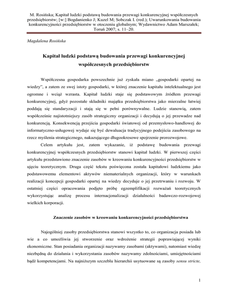 M. Rosińska; Kapitał ludzki podstawą budowania przewagi konkurencyjnej współczesnych przedsiębiorstw; [w:] Bogdanienko J; Kuzel M; Sobczak I. (red.); Uwarunkowania budowania konkurencyjności przedsiębiorstw w otoczeniu globalnym; Wydawnictwo Adam Marszałek; Toruń 2007; s. 11–20. Magdalena Rosińska Kapitał ludzki podstawą budowania przewagi konkurencyjnej współczesnych przedsiębiorstw Współczesna gospodarka powszechnie już zyskała miano „gospodarki opartej na wiedzy”, a zatem ze swej istoty gospodarki, w której znaczenie kapitału intelektualnego jest ogromne i wciąż wzrasta. Kapitał ludzki staje się podstawowym źródłem przewagi konkurencyjnej, gdyż pozostałe składniki majątku przedsiębiorstwa jako mierzalne łatwiej poddają się standaryzacji i stają się w pełni porównywalne. Ludzie stanowią, zatem współcześnie najistotniejszy zasób strategiczny organizacji i decydują o jej przewadze nad konkurencją. Konsekwencją przejścia gospodarki światowej od przemysłowo-handlowej do informatyczno-usługowej wydaje się być dewaluacja tradycyjnego podejścia zasobowego na rzecz myślenia strategicznego, nakazującego długookresowe spojrzenie prorozwojowe. Celem artykułu jest, zatem wykazanie, iż podstawę budowania przewagi konkurencyjnej współczesnych przedsiębiorstw stanowi kapitał ludzki. W pierwszej części artykułu przedstawiono znaczenie zasobów w kreowaniu konkurencyjności przedsiębiorstw w ujęciu teoretycznym. Druga część tekstu poświęcona została kapitałowi ludzkiemu jako podstawowemu elementowi aktywów niematerialnych organizacji, który w warunkach realizacji koncepcji gospodarki opartej na wiedzy decyduje o jej przetrwaniu i rozwoju. W ostatniej części opracowania podjęto próbę egzemplifikacji rozważań teoretycznych wykorzystując analizę procesu internacjonalizacji działalności badawczo-rozwojowej wielkich korporacji. Znaczenie zasobów w kreowaniu konkurencyjności przedsiębiorstwa Najogólniej zasoby przedsiębiorstwa stanowi wszystko to, co organizacja posiada lub wie a co umożliwia jej stworzenie oraz wdrożenie strategii poprawiającej wyniki ekonomiczne. Stan posiadania organizacji nazywamy zasobami (aktywami), natomiast wiedzę niezbędną do działania i wykorzystania zasobów nazywamy zdolnościami, umiejętnościami bądź kompetencjami. Na najniższym szczeblu hierarchii usytuowane są zasoby sensu stricte, 1 M. Rosińska; Kapitał ludzki podstawą budowania przewagi konkurencyjnej współczesnych przedsiębiorstw; [w:] Bogdanienko J; Kuzel M; Sobczak I. (red.); Uwarunkowania budowania konkurencyjności przedsiębiorstw w otoczeniu globalnym; Wydawnictwo Adam Marszałek; Toruń 2007; s. 11–20. czyli czynniki stanowiące wkład do produkcji przekształcany w kolejnych ogniwach kreowania łańcucha wartości. W celu ich zdobycia a następnie utrzymania przedsiębiorstwo ponosi pewne nakłady o charakterze stałym. Przypisuje się im relatywnie najmniejszą wartość. Nobilituje je dopiero przekształcenie w tzw. zasoby strategiczne, które umożliwiają przedsiębiorstwu osiągnięcie szczególnej pozycji, dającej przewagę konkurencyjną. Zasoby strategiczne kreowane są, bowiem dopiero dzięki szeroko rozumianym zdolnościom organizacji (produkcyjnym, sprzedażowym, marketingowym) do wykorzystania zasobów sensu stricte w celu odniesienia sukcesu rynkowego1. Dla zrozumienia istoty tworzenia przewagi konkurencyjnej konieczne wydaje się, zatem rozróżnienie i doprecyzowanie pojęć kompetencji i umiejętności (potocznie używanych wymiennie). Umiejętności to zrutynizowane działania umożliwiające stały wzrost efektywności działań podejmowanych na danym rynku. (D. Collins), opierające się wykorzystaniu kolektywnych i wielofunkcyjnych zdolności organizacyjnych do takiej alokacji zasobów, która pozwala na uzyskiwanie sukcesu rynkowego (G. Stalk, P. Evans, L. Schuman)2. Kompetencje mają natomiast szerszy, bo korporacyjny kontekst. Charakteryzują to, co organizacja „robi dobrze” nie w jednej lub niektórych, lecz we wszystkich sferach swojej działalności. Kompetencje są rezultatem posiadania wielu różnych umiejętności w zakresie różnych działań i procesów3. Wydają się, zatem być wyższą formą umiejętności organizacji, starającej się pokazać swoją wyjątkowości lub unikalność. Istotę przewagi konkurencyjnej stanowią jednak tylko, tzw. kluczowe kompetencje a zatem kombinacja unikalnych umiejętności pozwalających przedsiębiorstwu uzyskać długookresowe efekty synergiczne a w konsekwencji możliwości dywersyfikacji działalności w kierunku obszarów pozornie niezwiązanych z jego podstawową działalnością lub nawet uznawanych za mało atrakcyjne. Twórcy koncepcji kluczowych kompetencji (C.K. Prahalad i G. Hamel4) wskazują, iż związane są one ze sferami technologii, produkcji i zarządzania. Stanowią wypadkową różnorodnych umiejętności posiadanych przez poszczególne elementy 1 J. Rokita, Zarządzanie strategiczne: tworzenie i utrzymywanie przewagi konkurencyjnej, PWE, Warszawa 2005 s. 139 2 M. Rybak, Budowanie potencjału konkurencyjności, [w:] M. Rybak (red.); Kapitał ludzki jako źródło konkurencyjności przedsiębiorstw, Poltext, Warszawa 2003, s. 14-15 33 J.Rokita, Zarządzanie strategiczne:..; op. cit. s. 141-144 4 Koncepcję kluczowych kompetencji przedstawili w 1990 r. w swoim artykule: G. Hamel, C.K. Prahalad, The Core Competences of the Corporation, Harvard Business Review, maj-czerwiec1990. (Por.: Z. Pierścionek, Strategie konkurencji i rozwoju przedsiębiorstwa, PWN, Warszawa 2006, s. 224-231) 2 M. Rosińska; Kapitał ludzki podstawą budowania przewagi konkurencyjnej współczesnych przedsiębiorstw; [w:] Bogdanienko J; Kuzel M; Sobczak I. (red.); Uwarunkowania budowania konkurencyjności przedsiębiorstw w otoczeniu globalnym; Wydawnictwo Adam Marszałek; Toruń 2007; s. 11–20. składowe organizacji a ujawni
