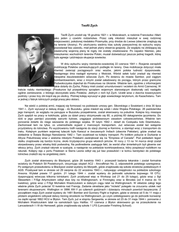 Teofil Zych Teofil Zych urodził się 18 grudnia 1921 r. w Mościskach, w rodzinie Franciszka i Marii jako jeden z czwórki rodzeństwa. Przez całą młodość mieszkał w swej rodzinnej miejscowości, położonej niedaleko Przemyśla, przy drodze do Lwowa (obecnie znajdują się na terenie Ukrainy). Po ukończeniu siedmiu klas szkoły powszechnej do wybuchu wojny pozostawał bez zawodu, miał jednak plany otwarcia gospody. Ze względu na zbliżającą się zawieruchę wojenną plany te nigdy nie zostały zrealizowane. Po napaści Niemiec, jako mieszkaniec wschodnich terenów Polski, musiał doświadczyć jeszcze jednej tragedii, którą była agresja i późniejsza okupacja sowiecka. W dniu wybuchu wojny niemiecko-sowieckiej 22 czerwca 1941 r. Rosjanie zarządzili mobilizację Polaków zamieszkujących podległe im tereny. Owa mobilizacja dotyczyć miała również zwierząt pociągowych oraz wozów, jakimi polska ludność dysponowała. Następnego dnia nastąpił wymarsz z Mościsk. Wśród setek ludzi znalazł się również niespełna dwudziestoletni wówczas Zych. Po dotarciu do miasta Sambor, pod ciągłym bombardowaniem, wraz z innymi został załadowany do pociągu, którym przez graniczne Podwołoczyska dojechał do Proskurowa na Ukrainie. Właśnie tam, zgodnie z informacjami jakie dotarły do Zycha, Polacy mieli zostać umundurowani i wcieleni do Armii Czerwonej. W trakcie nalotu niemieckiego (Proskurow był przepełniony sprzętem wojennym stanowiącym doskonały cel) nastąpiło ogólne zamieszanie, z którego skorzystało wielu Polaków. Jednym z nich był Zych. Uciekł wraz z dwoma towarzyszami podróży i przez trzy dni kręcił się po okolicy. Później koleją wyruszył w głąb sowieckiego terytorium, do Kazachstanu. Tam w jednej z fabryk lotniczych podjął pracę jako stolarz. Na wieść o polskiej armii, mającej się formować na podstawie umowy gen. Sikorskiego z Sowietami z dnia 30 lipca 1941 r., Zych wyruszył w dalszą drogę - do Buzułuku, gdzie mieścił się sztab i obóz Wojska Polskiego. 26 października jego transport, ze względu na panujące w Buzułuku przepełnienie, został skierowany na południe. Kolejne trzy miesiące Zych spędził na pracy w kołchozie, gdzie za dzień pracy otrzymywało się 80, a później 60 dekagramów jęczmienia. Do dziś w jego pamięci pozostały warunki bytowe, urągające podstawowym zasadom człowieczeństwa. Właśnie tam ponownie dotarło do niego wezwanie do polskiego wojska. W lutym 1942 r. dotarł do Czokpaku koło Dżambułuku. Zachorował tam na tyfus, co uniemożliwiło wyjazd z marcowym transportem. Już wówczas został też wstępnie przydzielony do lotnictwa. Po wyzdrowieniu trafił następnie do stacji zbornej w Kermine, a stamtąd wraz z transportem do Iraku. Kolejnym punktem wojennej tułaczki było Karaczi w ówczesnych Indiach (obecnie Pakistan), gdzie znalazł się dokładnie w Święta Bożego Narodzenia 1942 r. Tam oczekiwał na kolejny transport. Po krótkim pobycie w Durbanie w Afryce Południowej wraz z wieloma młodymi Polakami zaokrętował się na ''Empress of Canada''. Pod pokładem tegoż statku znajdowała się bardzo liczna, około trzytysięczna grupa włoskich jeńców. W nocy z 13 na 14 marca okręt został storpedowany przez włoską łódź podwodną. Na podkreślenie zasługuje fakt, że wsród ofiar śmiertelnych byli głownie owi włoscy jeńcy. Zych znalazł ratunek w szalupie, a następnie na pokładzie kontrtorpedowca, który pospieszył rozbitkom na ratunek. Kolejny rejs z portu Freetown w Sierra Leone odbył się już bez przeszkód i w końcu kandydaci do polskiego lotnictwa znaleźli się na angielskiej ziemi. Zych został skierowany do Blackpool, gdzie 26 kwietnia 1943 r. przeszedł badania lekarskie i został formalnie wcielony do Polskich Sił Powietrznych, otrzymując stopień AC2 - Aircraftman No. 2, odpowiednik polskiego szeregowca. Po wstępnym przeszkoleniu w Blackpool został wysłany do Morpeth, gdzie znajdowała się szkoła strzelców pokładowych 4 AGS. Przebywał tam w okresie od 29 sierpnia do 22 września 1943 r., nabywając umiejętności na pokładzie szkolnego Ansona. Wylatał prawie 17 godzin. 21 lutego 1944 r. został wysłany do jednostki szkolenia bojowego 18 OTU, dysponującej wówczas kilkoma lotniskami. Zych przebywał więc w Worksop (od 21 do 25 lutego), gdzie wraz z Sgt Stewartem i F/Sgt Artymiukiem odbył dwa loty na Wellingtonach, w Finningley oraz w Bircotes (od 4 marca do 14 kwietnia), gdzie wraz z F/Sgt Michałem Wasilczukiem w dalszym ciągu latał na Wellingtonach. W składzie załogi tego właśnie pilota Zych poleciał 10 kwietnia nad Francję. Zadanie określane jako "nickels" polegało na zrzucaniu ulotek nad terenami okupowanymi. Wellington nr 3996 XW-Y po czterech godzinach i dziesięciu minutach powrócił bezpiecznie. Z początkiem maja Zych został wysłany do 1481 Bomber and Gunnery Flight w Ingham, gdzie w okresie od 5 do 11 maja z pilotami angielskimi odbywał dalszy trening strzelecki na Wellingtonach, po czym oddelegowano go do jednostki konwersji na ciężki sprzęt 1662 HCU w Blyton. Tam Zych, już w stopniu Sergeanta, w okresie od 23 do 31 maja 1944 r. ponownie z Michałem Wasilczukiem latał na samolotach typu Halifax. 17 czerwca z Blyton skierowano go na przeszkolenie na Lancasterach I i III do Hemswell, gdzie znajdowała się szkoła 1 LFS (Lancaster Finishing School). 23 czerwca 1944 r. Zych wraz z załogą w składzie: pilot F/Sgt Michał Wasilczuk, mechanik pokładowy Sgt Bolesław Łuczak, bombardier Sgt Stanisław Polkowski, radiotelegrafista Sgt Zdzisław Wagner oraz strzelec pokładowy Sgt Michał Żołnierewicz, został przydzielony do stacjonującego w Faldingworth 300 Dywizjonu Bombowego "Ziemi Mazowieckiej". Szczególnie miłe powitanie spotkało samego Zycha, jako że dowódca W/Cdr Pożyczka ucieszył się z przybyłego do jednostki imiennika. Pierwszy swój lot w dywizjonie, jeszcze treningowy, odbył