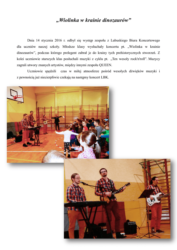 „Wiolinka w krainie dinozaurów” Dnia 14 stycznia 2016 r. odbył się występ zespołu z Lubuskiego Biura Koncertowego dla uczniów naszej szkoły. Młodsze klasy wysłuchały koncertu pt. „Wiolinka w krainie dinozaurów”, podczas którego prelegent zabrał je do krainy tych prehistorycznych stworzeń. Z kolei uczniowie starszych klas posłuchali muzyki z cyklu pt. „Ten wesoły rock'n'roll”. Muzycy zagrali utwory znanych artystów, między innymi zespołu QUEEN. Uczniowie spędzili czas w miłej atmosferze pośród wesołych dźwięków muzyki i z pewnością już niecierpliwie czekają na następny koncert LBK.
