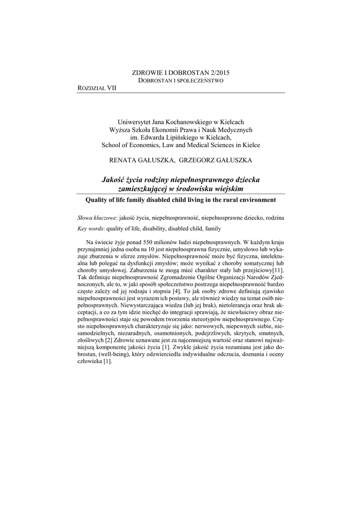 ZDROWIE I DOBROSTAN 2/2015 DOBROSTAN I SPOŁECZEŃSTWO ROZDZIAŁ VII Uniwersytet Jana Kochanowskiego w Kielcach Wyższa Szkoła Ekonomii Prawa i Nauk Medycznych im. Edwarda Lipińskiego w Kielcach, School of Economics, Law and Medical Sciences in Kielce RENATA GAŁUSZKA, GRZEGORZ GAŁUSZKA Jakość życia rodziny niepełnosprawnego dziecka zamieszkującej w środowisku wiejskim Quality of life family disabled child living in the rural environment Słowa kluczowe: jakość życia, niepełnosprawność, niepełnosprawne dziecko, rodzina Key words: quality of life, disability, disabled child, family Na świecie żyje ponad 550 milionów ludzi niepełnosprawnych. W każdym kraju przynajmniej jedna osoba na 10 jest niepełnosprawna fizycznie, umysłowo lub wykazuje zburzenia w sferze zmysłów. Niepełnosprawność może być fizyczna, intelektualna lub polegać na dysfunkcji zmysłów; może wynikać z choroby somatycznej lub choroby umysłowej. Zaburzenia te mogą mieć charakter stały lub przejściowy[11]. Tak definiuje niepełnosprawność Zgromadzenie Ogólne Organizacji Narodów Zjednoczonych, ale to, w jaki sposób społeczeństwo postrzega niepełnosprawność bardzo często zależy od jej rodzaju i stopnia [4]. To jak osoby zdrowe definiują zjawisko niepełnosprawności jest wyrazem ich postawy, ale również wiedzy na temat osób niepełnosprawnych. Niewystarczająca wiedza (lub jej brak), nietolerancja oraz brak akceptacji, a co za tym idzie niechęć do integracji sprawiają, że niewłaściwy obraz niepełnosprawności staje się powodem tworzenia stereotypów niepełnosprawnego. Często niepełnosprawnych charakteryzuje się jako: nerwowych, niepewnych siebie, niesamodzielnych, niezaradnych, osamotnionych, podejrzliwych, skrytych, smutnych, złośliwych [2] Zdrowie uznawane jest za najcenniejszą wartość oraz stanowi najważniejszą komponentę jakości życia [1]. Zwykle jakość życia rozumiana jest jako dobrostan, (well-being), który odzwierciedla indywidualne odczucia, doznania i oceny człowieka [1]. ZDROWIE I DOBROSTAN 2/2015 Dobrostan i społeczeństwo Choroba oraz niepełnosprawność bardzo często powodują ograniczenie możliwości zaspokojenia fundamentalnych potrzeb osoby, która ich doświadcza, co prowokuje zazwyczaj szereg przykrych następstw, takich jak deprywacja, frustracja, w skrajnych przypadkach nawet agresja.[3]. Ograniczone w wyniku choroby możliwości realizacji dążeń i aspiracji wpływają destrukcyjnie na funkcjonowanie osoby niepełnosprawnej w rodzinie i w społeczeństwie. Ograniczenie sprawności psychoruchowej zawsze stawia przed człowiekiem konieczność określenia nowych celów życiowych. Przyszłość człowieka niepełnosprawnego, a jednocześnie jakość jego życia, są zależne od określania na nowo przez jednostkę systemu wartości [10]. Niepełnosprawność jest szczególnie dotkliwa, gdy dotyczy dziecko. Jest wówczas nie tylko problemem samej jednostki, ale również rodziców zawsze oczekujących na narodziny zdrowego dziecka, rodzeństwa, dziadków i reszty rodziny. Zasadnicze znaczenie dla funkcjonowania niepełnosprawnej osoby, a szczególnie dziecka, ma zależność tych osób od otoczenia. Niepełnosprawne dzieci przekonują się o swej bezradności nawet wobec najprostszych czynności, co zwiększa ogromnie zależność osób niepełnosprawnych od otoczenia, a z czasem przekształca się w wyuczoną bezradność. Dzieci o obniżonej sprawności charakteryzują się brakiem zaufania do samego siebie i brakiem wiary we własne możliwości, to też gdy stają przed nowym zadaniem, szukają oparcia w otoczeniu, które podnosi subiektywne prawdopodobieństwo sukcesu. Dziecko niepełnosprawne wprowadza szereg nieprzewidzianych wcześniej zmian w swojej rodzinie, w psychice każdego z jej członków, w relacjach między nimi, w funkcjonowaniu społecznym rodziny, jej sytuacji materialnej. Problemem jest nie tylko choroba dziecka, ale i nowa, złożona sytuacja rodziny. Rodzice, rodzeństwo, bliżsi i dalsi krewni są zmuszeni do zmiany sposobu życia, swoich postaw i zachowań. Schemat funkcjonowania całej rodziny musi ulec przekształceniu, by zapewnić zabezpieczenie potrzeb niesprawnego dziecka i utrzymać rodzinę w znaczeniu socjologicznym. Bardzo ważne, aby rodzice oraz specjaliści zajmujący się niepełnosprawnymi dziećmi, uświadomili sobie, iż rodzina kształtuje osobowość człowieka. Od tego czy rodzina stara się zaspokoić podstawowe potrzeby dziecka, czy stwarza warunki do prawidłowego rozwoju fizycznego i psychicznego, zależy życie każdej jednostki. Rodzina stanowi bazę. Rodzina poprzez wymiar opiekuńczy, moralny, wychowawczy, edukacyjny sprzyja zdrowiu i jego rozwojowi, ale może to zdrowie zaburzyć i niszczyć [8]. Pierwszą reakcją na wiadomość o zaistniałej niepełnosprawności dziecka jest ogromny szok i niedowierzanie. Procesowi akceptacji dziecka niepełnosprawnego przez rodziców towarzyszą duże opory wewnętrzne. Rodzice na ogół nie potrafią poradzić sobie z sytuacją, nie wiedzą, jak postępować z niepełnosprawnym dzieckiem, ich zachowania wobec niego są przepełnione poczuciem winy lub lękiem. Przeżywane przez rodziców negatywne emocje źle wpływają na relacje między małżonkami, między rodzicami a dzieckiem chorym, i resztą potomstwa. Pojawia się wrogość, kłótnie, nieporozumienia. Niesnaski między rodzicami mają swoje podłoże w zwiększonej ilości obowiązków, które najczęściej spadają na matkę, ograniczeniach upodobań, 110 Renata Gałuszka, Grzegorz Gałuszka Jakość życia rodziny niepełnosprawnego dziecka zamieszkującej w środowisku wiejskim zainteresowań, przyzwyczajeń rodziców. Pojawia się lęk przed posiadaniem następnych dzieci: zakłóceniu ulega funkcja zaspokojenia potrzeb seksualnych i funkcja prokreacyjna. Często dochodzi do rozluźnienia więzi małżeńskich lub ich rozpadu. Po etapie szoku bardzo często następuje 