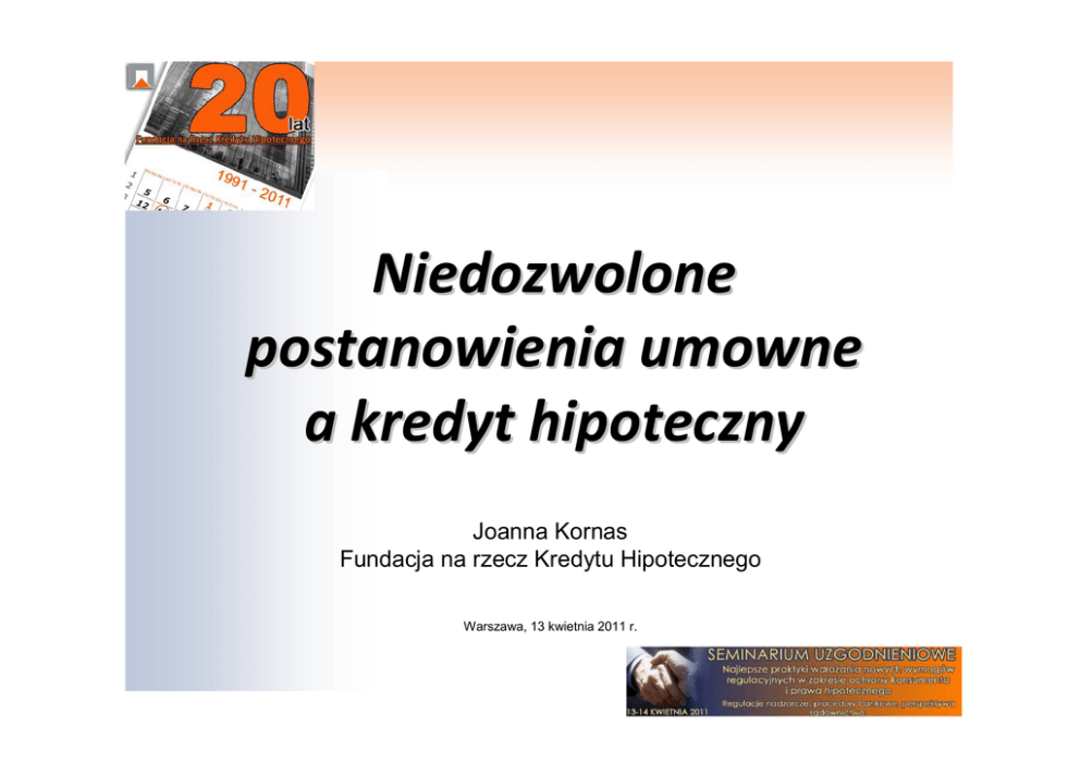 Niedozwolone postanowienia umowne a kredyt hipoteczny Joanna Kornas Fundacja na rzecz Kredytu Hipotecznego Warszawa, 13 kwietnia 2011 r. Joanna Kornas, „Niedozwolone postanowienia umowne a kredyt hipoteczny” Pojęcie „klauzuli abuzywnej” Niedozwolone postanowienie umowne (tzw. klauzula abuzywna) to, zgodnie z przepisami Kodeksu cywilnego, postanowienie: Znajdujące się w konkretnej umowie zawartej z konsumentem Nieuzgodnione z nim indywidualnie (= konsument nie miał na nie rzeczywistego wpływu) Kształtujące prawa i obowiązki konsumenta w sposób sprzeczny z dobrymi obyczajami RaŜąco naruszające jego interesy Klauzulami abuzywnymi nie są postanowienia określające główne świadczenia stron (cenę, wynagrodzenie), jeŜeli zostały sformułowane w sposób jednoznaczny Joanna Kornas, „Niedozwolone postanowienia umowne a kredyt hipoteczny” Kontrola incydentalna Znajdujące się w konkretnej, zawartej z konsumentem, umowie niedozwolone postanowienie, nie wiąŜe konsumenta z mocy prawa W razie sporu z przedsiębiorcą, co do związania danym postanowieniem umownym, konsument-strona umowy moŜe dochodzić przed sądem ustalenia, Ŝe określone postanowienie go nie wiąŜe tzw. „kontrola incydentalna” Joanna Kornas, „Niedozwolone postanowienia umowne a kredyt hipoteczny” Kontrola abstrakcyjna Niedozwolone postanowienia mogą znajdować się nie tylko w konkretnych umowach, ale także we wzorcach umów Wzorzec to takŜe regulamin, taryfa opłat i prowizji itp. Postanowienia znajdujące się w takich dokumentach mogą zostać zaskarŜone przez kaŜdego do Sądu Ochrony Konkurencji i Konsumentów (SOKiK) SOKiK uznaje postanowienia za niedozwolone, zakazuje ich wykorzystywania i przesyła odpis prawomocnego wyroku Prezesowi Urzędu Ochrony Konkurencji i Konsumentów (UOKiK) Prezes UOKiK prowadzi rejestr postanowień wzorców uznanych za niedozwolone Od chwili wpisania do rejestru wyrok ma skutek wobec osób trzecich Joanna Kornas, „Niedozwolone postanowienia umowne a kredyt hipoteczny” Bankowe klauzule abuzywne O wysokości oprocentowania Bank zawiadomi Kredytobiorcę oraz Poręczycieli pisemnie w terminie 14 dni od dnia uruchomienia kredytu lub pierwszej transzy. Właściwa wysokość oprocentowania, która będzie obowiązywać Kredytobiorcę w okresie wskazanym w ust. 1 moŜe się róŜnić od wartości podanej w ust. 1. wyrok SOKiK z 16.08.2010, XVII AmC 727/09; klauzula nr 2060 ARGUMENTY BANKU SOKiK Zawarte umowy uzgadniane indywidualnie z klientami Oprocentowanie STAŁE: sprzeczna z jego istotą MoŜliwość negocjacji wzorca – aneksy Całkowita dowolność w ustaleniu % (brak odniesienia do wskaźników obiektywnych, jak np. WIBOR) Kredyt wypłacany jest w znacznym odstępie czasowym od momentu zawarcia umowy Ryzyko st.% zmusza bank do ustalenia % na dzień wypłaty kredytu Joanna Kornas, „Niedozwolone postanowienia umowne a kredyt hipoteczny” klauzula Naruszenie lojalności kontraktowej Czas: ryzyko gospodarcze; umowa Bank w istocie moŜe zmienić zawartą umowę 1-stronnie Bankowe klauzule abuzywne Do podstawowych obowiązków Kredytobiorcy naleŜy: (...) powiadamianie Banku o wszelkich okolicznościach mogących mieć wpływ na sytuację finansową Kredytobiorcy, w szczególności o obniŜeniu dochodów mogących mieć wpływ na terminową spłatę Kredytu. wyrok SOKiK z 22.10.2009, XVII AmC 349/09; klauzula nr 1987 ARGUMENTY BANKU Prawo bankowe uprawnia bank do weryfikowania zdolności kredytowej kredytobiorcy Bank nie domaga się nieistotnych danych ich zmiana: nie wiąŜe się z Ŝadnymi sankcjami SOKiK Niejednoznaczne i nieprecyzyjne: kiedy klient ma informować bank? o jakich okolicznościach? de facto: bank wiąŜąco interpretuje umowę wypowiedzenie dotkliwe dla klienta konsekwencje finansowe Zbędne i uciąŜliwe formalności dla klienta Zbyt duŜa swoboda banku: moŜliwość stwierdzenia, Ŝe klient nie wykonuje obowiązku informacyjnego z powodu niewielkiej zmiany w jego majątku, która faktycznie nie wpływa na zdolność kredytową Joanna Kornas, „Niedozwolone postanowienia umowne a kredyt hipoteczny” Bankowe klauzule abuzywne W przypadku braku spłaty dwóch kolejnych rat kredytu, Bank ma prawo, nie częściej niŜ raz do roku, dokonać wyceny nieruchomości stanowiącej przedmiot hipoteki na koszt Kredytobiorcy . wyrok SOKiK z 6.082009, XVII AmC 512/09; klauzula nr 1741 ARGUMENTY BANKU Argumenty nieznane (ostatecznie uznał powództwo) SOKiK Brak związku między opóźnieniem w zapłacie 2 kolejnych rat a koniecznością wyceny nieruchomości będącej przedmiotem zabezpieczenia Bank zastrzega sobie moŜliwość pobierania świadczenia w nadmiernej wysokości Konsument ponosi dodatkowe koszty, by bank mógł odnieść nieuzasadnione korzyści Joanna Kornas, „Niedozwolone postanowienia umowne a kredyt hipoteczny” Bankowe klauzule abuzywne Bank zastrzega sobie prawo zmiany niniejszego regulaminu. wyrok SOKiK z 24.03.2003 r., XVII AmC 33/02; klauzula nr 93 ARGUMENTY BANKU Nie ma jednostronnej zmiany umowy: moŜna negocjować Konsumentowi doręcza się zmieniony regulamin prawo wypowiedzenia umowy Zmiany w regulaminie: zasada słusznego uznania – jedna ze stron umowy ma uprawnienie do oznaczenia świadczenia SOKiK W kontrolowanym regulaminie nie ma postanowień dot. negocjacji, jedynie dot. wypowiedzenia Prawo zmian w regulaminie bez wskazania waŜnych przyczyn = 1-stronna zmiana umowy Joanna Kornas, „Niedozwolone postanowienia umowne a kredyt hipoteczny” Bankowe klauzule abuzywne „W szczególności” [dot. wypowiedzenia umowy] wyrok SOKiK z 22.12.2004 r., XVII AmC 110/03; klauzula nr 341 ARGUMENTY BANKU Klauzula dotyczy wypowiedzenia, a nie 1-stronnej zmiany umowy Bank moŜe wypowiedzieć umowę kredytu tylko w przypadkach określonych w przepisie art. 75 Prawa bankowego SOKiK Bank samodzielnie decyduje, jakie okoliczności uzasadniają wypowiedzenie umowy Bank moŜe uzupełniać umowę o nieuzgodnione warunki śadne