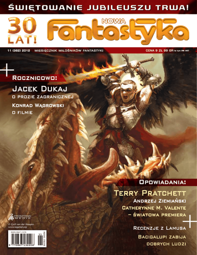 ŚWIĘTowanie JUBILEUSZu trwa! 11 (362) 2012 miesięcznik miłośników fantastyki Cena 9 zŁ 99 gr (w tym 8% VAT) Rocznicowo: Jacek Dukaj o prozie zagranicznej Konrad Wągrowski o filmie Opowiadania: Terry Pratchett Andrzej Ziemiański Catherynne M. Valente – światowa premiera P RÓS ZYŃSKI M E D I A PRÓSZYŃSKI M E D I A © Cyril van der Haegen www.tegehel.org 9 770867 132206 11 INDEKS 358398 ISSN 0867-132X Recenzje z Lamusa Bacigalupi zabija dobrych ludzi Fot. M. Kowalczuk 11/2012 Nasz jaskiniowiec 04 12 „Fantastyka” ma trzydzieści lat; ja mam trzydzieści osiem. Mój życiorys czytelniczy pokrywa się niemal dokładnie z życiorysem miesięcznika. Kino SF roku ’82 poruszało najważniejsze tematy fantastyki. Gatunkiem interesowali się wizjonerzy wznoszący go na wyżyny artystyczne. Czy kolejne 30 lat spełniło ówczesne oczekiwania? 65 70 Postanowiliśmy sięgnąć do lamusa właśnie, aby zobaczyć, jak recenzowano książki fantastyczne w czasopismach przedwojennych. „Zatopione miasta” to gorzka opowieść o życiu bez nadziei, o ludziach, którzy nie odważają się marzyć o czymkolwiek, co wykracza poza koniec cierpienia. To opowieść o tym, że dobrzy ludzie giną pierwsi. PUBLICYSTYKA 2 ZAPOWIEDZI 3 NIEPOKONANI Jakub Ćwiek 4 SPOWIEDŹ RÓWIEŚNIKA Jacek Dukaj 12 ODYSEJA KOSMICZNA 1982-2012 Konrad Wągrowski 62 RADY DLA PISZĄCYCH, ODC. 11 Michael J. Sullivan 65 RECENZJE Z LAMUSA Agnieszka Haska, Jerzy Stachowicz 70 DOBRZY LUDZIE UMIERAJĄ PIERWSI Marcin Zwierzchowski 72 C.U.D. Rafał Kosik 73 GŁĘBOKIE PRZEKONANIA, PŁYTKIE KORZENIE Peter Watts 78 GORYCZ I ŻÓŁĆ Łukasz Orbitowski PROZA POLSKA 17 PUŁAPKA TESLI Andrzej Ziemiański 35 MASZ TO JAK W BANKU Bartosz Działoszyński PROZA ZAGRANICZNA 41 DOTYK NIEBIOS Jason Sanford 50 PIEKIELNY INTERES Terry Pratchett 56 AEROMAUS Catherynne M. Valente RECENZJE 67 KSIĄŻKI 74 FILM 75 DVD 76 KOMIKS 77 TV Zabawmy się w „Kto to powiedział?” Na początek cytaty. Pierwszy: To właśnie jaskiniowiec w nas mówi: Wyjdź na dwór, spotkaj prawdziwych ludzi, doświadczaj prawdziwej rzeczywistości! Drugi: Apollo władał nieskończoną energią słońca, Zeus potrafił się przeobrażać, a Wenus miała idealne ciało. Do czegoś takiego zdolne będą nasze prawnuki. I trzeci: No cóż, korzystanie z toalety wciąż będzie konieczne. Ale już same toalety! Będą miały większe możliwości analityczne niż współczesne kliniki! Pytanie: kto jest autorem tych rewelacji? A) Sheldon Cooper (tak, ten z „Teorii wielkiego podrywu”); B) Stanisław Lem w nie publikowanej, odkrytej na pawlaczu powieści, będącej genialnym i przerażającym proroctwem; C) Michio Kaku, autor „Fizyki rzeczy niemożliwych” i innych, równie ekscytujących dzieł. Pomyśleliście już? OK., to teraz rozwiązanie. Miłośników twórczości Lema przepraszam. Póki co, na pawlaczach, które po śmierci autora „Solaris” na pewno przetrząśnięto dokładnie, nie znaleziono „genialnego proroctwa”. To, co w pisarstwie Lema było genialne, jest takim – w jego opublikowanych dziełach. Niestety więc, to nie on. Też żałuję. Sheldon Cooper? Wy, którzy obstawiliście tego na swój sposób urokliwego doktora (przed określeniem go mianem „geniusza” mam opór) byliście naprawdę blisko. O włos. O tyle, o ile proton jest oddalony od neutronu w atomie waszego ulubionego pierwiastka. Przyznaję, Sheldon zdolny byłby do tego typu intelektualnej ekstrawagancji – dlatego znalazł się na tej liście. Zwiodłem was, sorry. Zatem profesor? Tak jest. W wywiadzie dla „Der Spiegela” (przedruk: „Forum”, 40/2012). Michio Kaku od lat poraża nas – mnie na pewno – wizjonerstwem, którego mogą mu pozazdrościć chyba także co poniektórzy autorzy SF. Przyznaję, zazdroszczę profesorowi Kaku optymizmu. Przyznaję, bywa porywający. Lecz czy podzielam jego – nazwijmy rzecz po imieniu – nadzieje? Sam nie wiem. I kiedy waham się, jak odpowiedzieć, dochodzi mnie szept jaskiniowca: Idź do ludzi, zapytaj. Może ci ktoś mądrzejszy podpowie? Nie taki ten jaskiniowiec głupi, prawda? Jakub Winiarski W następnym numerze: Paweł Kempczyński PersifAL KEN Scholes łkający car wpatruje się w upadły Księżyc czas fantastyki 4/2012 od 15 listopada FANTASTYKA WYDANIE SPECJALNE 4/2012 od 18 października Spowiedź rówieśnika Jacek Dukaj F antastyka” ma trzydzieści lat; ja mam trzydzieści osiem. A że właśnie w okolicy szóstego-ósmego roku życia zacząłem czytać science fiction, mój życiorys czytelniczy pokrywa się niemal dokładnie z życiorysem miesięcznika. Przyszło mi teraz spojrzeć z tej perspektywy na ewolucję światowej literatury fantastycznej. Mógłbym silić się na encyklopedyczny dystans – zrzucić z Internetu listy laureatów nagród, rankingi bestsellerów, notowania krytyków, nic prostszego. Już jednak w takiej ostentacyjnej obiektywności kryje się fałsz: nikt nie odbiera literatury w ten sposób i nikt nie doświadcza lektur wedle porządków późniejszych literatury historyków. Każda tu próba naukowej bezstronności to gwałt na własnej pamięci i wrażliwości. Sam charakter, miejsce i czas tej wypowiedzi zapraszają zresztą do większej szczerości, intymności – do rodzaju czytelniczej spowiedzi. Medal ma oczywiście drugą stronę: wybierając ścieżkę osobistych wspomnień, stajemy się niewolnikami naturalnych mechanizmów psychologicznych, począwszy od nostalgicznej adoracji doświadczeń wpisanych w epokę młodości. Nie tylko niebo było błękitniejsze, Boże Narodzenie dłuższe, a ciastka słodsze – lecz i książki smakowały nam wówczas jak już nigdy nie będą smakować. Przyrzekłem sobie, że zachowam zimną głowę i nie popadnę w rytualne zrzędzenie nad uwiądem literatury. Nie można też jednak poddawać się szantażowi wiecznego optymizmu i cynicznym zaklęciom relatywistów: w epoce X pisze się i czyta inaczej niż w epoce Y, każda ma