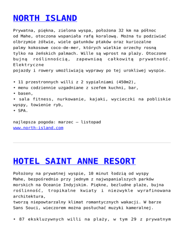 NORTH ISLAND Prywatna, piękna, zielona wyspa, położona 32 km na północ od Mahe, otoczona wspaniała rafą koralową. Można tu podziwiać olbrzymie żółwie, wiele gatunków ptaków oraz kuriozalne palmy kokosowe coco-de-mer, których wielkie orzechy rosną tylko na żeńskich palmach. Wille są wprost na plaży. Otoczone bujną roślinnością, zapewniaą całkowitą prywatność. Elektryczne pojazdy i rowery umożliwiają wyprawy po tej urokliwej wyspie. • 11 przestronnych willi z 2 sypialniami (450m2), • menu codziennie uzgadniane z szefem kuchni, bar, • basen, • sala fitness, nurkowanie, kajaki, wycieczki na pobliskie wyspy, łowienie ryb, • SPA. najlepsza pogoda: marzec – listopad www.north-island.com HOTEL SAINT ANNE RESORT Położony na prywatnej wyspie, 10 minut łodzią od wyspy Mahe, bezpośrednio przy jednym z najwspanialszych parków morskich na Oceanie Indyjskim. Piękne, bezludne plaże, bujna roślinność, tropikalne kwiaty i niezwykle wyrafinowana architektura, tworzą niepowtarzalny klimat romantycznych wakacji. W barze Sans Souci, wieczorem można posłuchać muzyki kameralnej. • 87 ekskluzywnych willi na plaży, w tym 29 z prywatnym basenem, • 4 restauracje, 2 bary, • basen, • sporty wodne niezmotoryzowane, korty tenisowe, rowery górskie, • trekking, wycieczki na inne wyspy, łowienie ryb, • Spa/Clarins. najlepsza pogoda: marzec – maj, wrzesień – grudzień www.beachcomber-hotels.com COUSINE ISLAND Prywatna wysepka położona 6 km na zachód od wyspy Praslin. Transfer na wyspę odbywa się helikopterem. Istnieje możliwość wynajęcia całej wyspy. • 4 luksusowe wille na plaży, • restauracja, bar, • basen, • nurkowanie, łowienie ryb, wycieczki jachtem, • spacery po lesie tropikalnym, obserwacja licznych gatunków ptaków i żółwi. najlepsza pogoda: listopad – kwiecień www.cousineisland.com Veranda Le Palmar Beach 3* Położony bezpośrednio przy pięknej, piaszczystej plaży Belle Mare na północno-zachodnim wybrzeżu wyspy. Turkusowe wody Oceanu świetnie nadają się do kąpieli oraz uprawiania wszelkich sportów wodnych. Do dyspozycji gości basen, 2 restauracje, 2 bary, serwis plażowy 77 pokoi z widokiem na ocean, klimatyzacją, balkonem lub tarasem, łazienką, suszarką do włosów, sejfem, czajnikiem do kawy/herbaty, mini barem, TV SAT W pokoju 2 osobowym „Comfort” istnieje możliwość zakwaterowania 2 osób dorosłych + 2 dzieci do lat 12-tu lub 3 osób dorosłych 2 restauracje (możliwość zamówienia dań wegetariańskich) : Regatta – menu à la carte lub bufet śniadania: 07.30 – 10.00 19.00 – 22.00 obiady 12.00 – 15.00 kolacje L’Horizon – dania z grilla, owoce morza Obiady: 12.30 – 15.00 Kolacje: 19.00 rezerwacja) – 22.00 (5 razy w tygodniu, wymagana 2 bary: L’Horizon : 11.00 – 17.00 (przy plaży) Barracuda: 11.00 – 23.00 (przy basenie) Sporty gratis: gimnastyka wodna, deski do windsurfingu, przejażdżki łodzią ze szklanym dnem z możliwością nurkowania z maską przy rafie koralowej, rowery wodne, kajaki, żaglówki, tenis stołowy, sala fitness Sporty płatne: narty wodne, katamarany, nurkowanie z butlami, rowery, bilard Cena przelotu skalkulowana została na podstawie przelotu rejsowego liniami EMIRATES (PLN 4000 od osoby), cena zależy od dostępności miejsc w danym terminie i w przyjętej taryfie cenowej. Ewentualna zmiana ceny i terminu przelotu zostanie zaproponowana klientowi do akceptacji. Istnieje możliwość zamówienia dowolnej liczby noclegów. Veranda Le Palmar Beach 3* 5 nocy/All Inclusive Przelot WAW-MRU-WAW Transfer lotnisko/hotel/lotnisko Ceny w PLN Miejsce w pokoju 2-os „Comfort” 01.10 – 31.10.14 noc 01.05 – 30.09.14 noc 6990 520 6480 420 1-sze dziecko do lat 12-tu na dostawce 2-gie dziecko do lat 12-tu bezpłatnie 1100 bezpłatnie 1100 na dostawce Oferty specjalne (noce gratis All Inclusive) podróż poślubna co 5-ta rocznica ślubu Megève, Feu*** 6 płatnych + 1 gratis 8 płatnych + 2 gratis 11 płatnych + 3 gratis Hotel – 25% – 25% Au 5 płatnych + 2 gratis 150 10 płatnych + 4 gratis – 25% – 25% Coin du Megève to niezwykle elegancki ośrodek narciarski położony w Alpach francuskich, w Górnej Sabaudii (Haute Savoie), 70km od Genewy. Jeżdżąc na nartach z Mont d’Arbois, Rochebrune i Jaillet możemy podziwiać wspaniałą panoramę na dominujący Mont Blanc i pobliskie szczyty górskie. Region Evasion Mont Blanc – to 445 km tras narciarskich oraz ponad 200 wyciągów. Świetnie przygotowane trasy o różnym stopniu trudności nadają się dla narciarzy i snowboardzistów. Region posiada również znakomite tereny dla dzieci, szkółki i przedszkola z instruktorami. Wspaniałe tereny narciarskie, autentyczna atmosfera miasteczka oraz dyskretny luksus sprawiają, że Megève od lat jest ulubionym miejscem najbardziej wymagających klientów z całego świata. W latach powojennych popularność Megève w paryskich kręgach artystycznych była tak duża, że Jean Cocteau nazwał miasteczko „21-szą dzielnicą Paryża”, a w restauracji „Enfants terribles”, którą ozdobił malowidłami ściennymi jadali m.in.: Brigitte Bardot, Françoise Sagan i Jean Marais. Dziś to jedna z 80 restauracji (37 leży na stokach), dzięki którym miejscowość Megève uznana jest za alpejską stolicę kulinarną. Hotel Au Coin du Feu 3* Położony w centrum miasteczka, kameralny z domową atmosferą, która zachęca do wieczornych spotkań przy kominku i kubku gorącej czekolady. Wystrój hotelu jest tradycyjny z niezwykłą dbałością o komfort gości i autentyczność miejsca. Do dyspozycji gości: 23 pokoje elegancko i tradycyjnie urządzone Restauracja Saint Nicolas Salon z wygodnymi kanapami wokół kominka SPA, sauna, hammam, sala fitness, masaże 12/12-24/12/14 20/12-26/12/14 27/12/14 05/01-04/02/15 22/03-11/04/15 05/02-07/03/15 04/01/15 08/03-21/03/15 Pokój Classique 700 950 1200 820 Pokój Club 820 1080 1290 900 Pokój Presti