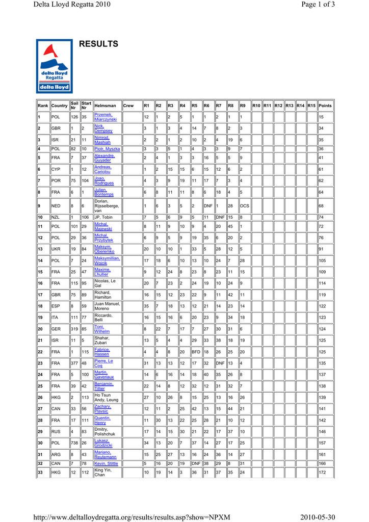Delta Lloyd Regatta 2010 Page 1 of 3 RESULTS Rank Country Sail Start Helmsman Nr Nr Crew R1 R2 R3 R4 R5 R6 R7 R8 R9 R10 R11 R12 R13 R14 R15 Points 12 1 2 5 1 1 2 1 1 15 1 POL 126 35 Przemek, Miarczynski 2 GBR 1 2 Nick, Dempsey 3 1 3 4 14 7 8 2 3 34 3 ISR 21 11 Nimrod, Mashiah 2 2 1 2 10 2 4 19 6 35 4 POL 82 10 Piotr, Myszka 3 3 5 1 4 3 3 9 7 36 37 Alexandre, Guyader 2 4 1 3 3 16 5 5 9 41 1 2 15 15 6 15 12 6 2 61 5 FRA 7 6 CYP 1 12 Andreas, Cariolou 7 POR 75 104 Joao, Rodrigues 4 3 9 19 11 17 7 3 4 62 8 FRA 6 1 Julien, Bontemps 6 8 11 11 8 6 18 4 5 64 Dorian, Rijsselberge, van 1 6 3 5 2 DNF 1 28 OCS 68 9 NED 8 6 10 NZL 1 106 JP, Tobin 7 5 6 9 5 11 DNF 15 8 74 11 POL 101 29 Michal, Majewski 8 11 9 10 9 4 20 45 1 72 12 POL 29 36 Michal, Przybytek 6 9 5 9 19 35 6 20 2 76 13 UKR 19 84 Maksym, Oberemko 20 10 10 1 33 5 28 12 5 91 17 18 6 10 13 10 24 7 28 105 14 POL 7 24 Maksymillian, Wojcik 15 FRA 25 47 Maxime, Lhullier 9 12 24 8 23 8 23 11 15 109 20 7 23 2 24 19 10 24 9 114 16 FRA 115 95 Nicolas, Le Gal 17 GBR 75 89 Richard, Hamilton 16 15 12 23 22 9 11 42 11 119 18 ESP 8 59 Juan Manuel, Moreno 35 7 18 13 12 21 14 23 14 122 16 15 16 6 20 23 9 34 18 123 19 ITA 111 77 Riccardo, Belli 20 GER 319 85 Toni, Wilhelm 8 22 7 17 7 27 30 31 6 124 21 ISR 11 5 Shahar, Zubari 13 5 4 4 29 33 38 18 19 125 22 FRA 1 115 Fabrice, Hassen 4 4 8 20 BFD 18 26 25 20 125 23 FRA 377 48 Pierre, Le Coq 31 13 13 12 17 32 DNF 13 4 135 14 6 16 14 18 40 35 26 8 137 24 FRA 5 100 Martin, Gaveriaux 25 FRA 39 42 Benjamin, Tillier 22 14 8 12 32 12 31 32 7 138 26 HKG 2 113 Ho Tsun Andy, Leung 27 10 26 8 15 25 13 16 26 139 27 CAN 33 56 Zachary, Plavsic 12 11 2 25 42 13 15 44 21 141 28 FRA 17 111 Quentin, Henry 11 30 13 22 25 28 21 10 12 142 83 Dmitry, Polishchuk 17 14 15 30 21 22 17 37 10 146 29 RUS 4 30 POL 738 26 Lukasz, Grodzicki 34 13 20 7 37 14 27 17 25 157 31 ARG 8 43 Mariano, Reutemann 15 25 27 13 16 24 36 14 27 161 32 CAN 7 78 Kevin, Stittle 5 16 20 19 DNF 38 29 8 31 166 112 King Yin, Chan 10 19 14 3 36 37 35 24 172 33 HKG 12 31 http://www.deltalloydregatta.org/results/results.asp?show=NPXM 2010-05-30 Delta Lloyd Regatta 2010 Page 2 of 3 34 FRA 170 0 Benjamin, Madec 25 26 7 28 35 GBR 7 64 Elliot, Carney 13 21 25 7 35 26 32 36 ISR 26 109 Shlomi, Ayoubi 14 18 10 15 30 36 39 37 THA 8 93 EK, Boonsawad 15 21 11 32 27 41 19 38 FRA 19 58 Louis Benoit, Hug 9 16 19 BFD 28 34 22 29 29 4 24 26 39 31 20 16 21 30 173 22 29 175 36 17 176 41 16 182 39 23 190 DNF 40 3 194 39 FRA 93 45 Gauthier, Lefevre 40 GRE 4 46 George, Fragos 18 31 12 18 39 42 34 38 13 203 114 Kwok Fai, Cheng 26 12 29 11 41 30 33 29 34 204 17 6 38 BFD DNF 33 32 208 41 HKG 18 42 FRA 112 82 Lavnay, Samvel 26 9 43 FRA 2 51 Andre, Vianney 22 BFD 19 27 34 BFD 25 30 22 225 44 FRA 8 41 Etienne, Saiz 11 30 32 16 40 37 40 27 33 226 94 Natthaphong, Phonopphara 5 28 39 21 43 29 41 43 36 242 19 36 18 14 44 DNF DNF DNF 35 260 45 THA 1 46 KOR 71 86 Wonwoo, Cho 47 FRA 15 63 Pierre, Noesmoen 27 24 34 18 7 11 3 1 12 103 48 FRA 9 57 Joseph, Gueguen 23 28 29 27 4 5 6 8 4 105 Martin, Berardo 7 31 21 37 1 4 33 4 11 112 49 ARG 5 40 50 CAN 11 76 David, Hayes 25 17 23 36 2 BFD 5 6 3 117 121 51 JPN 11 101 Makoto, Tomizawa 24 27 14 29 6 18 26 5 1 52 ISR 16 110 Ron, Asulin DPI 32 21 33 5 1 7 18 8 123 53 SVK 1 96 Patrik, Pollak 29 20 17 40 8 14 9 7 19 123 54 POL 4 34 Piotr, Myszkowski 32 19 22 31 16 3 11 12 10 124 10 23 31 30 10 19 16 2 22 132 55 FRA 26 31 Morgann, Behrel 56 LTU 14 38 Juozas, Bernotas 36 27 31 39 13 7 2 17 2 135 38 22 28 41 3 10 1 34 7 143 9 20 BFD 5 143 57 CZE 130 97 Karel, Lavicky 58 KOR 37 90 Hyung Kwon, Kim 31 25 22 17 14 59 ARG 75 44 Nahuel, Abram 39 17 36 40 9 12 12 9 20 154 60 TPE 8 99 Hao, Chang 36 20 30 22 12 30 13 22 9 158 61 FRA 230 22 Benoit, Bigot 19 26 30 34 11 20 28 14 18 166 1 79 Manfredi, Misuraca Via 32 Villareale 29 32 20 22 6 8 28 28 173 92 Sebastian, WangHansen 18 39 25 38 21 31 15 20 6 174 62 ITA 63 NOR 88 64 CRO 751 55 Luka, Mratovic 28 33 35 35 23 2 24 26 15 186 Matthieu, Vincent DPI 36 33 26 31 29 17 15 13 188 65 FRA 43 27 66 FRA 512 80 Guillaume, Jouhaud 24 23 24 28 32 8 18 33 32 189 67 FRA 311 33 Pierre, Embroise 42 8 28 33 20 32 10 BFD 17 190 68 FRA 442 62 Paul, Hirtzmann 39 38 36 31 17 15 23 16 192 69 LTU 1 39 Martynas, Juodeska 23 34 26 36 29 37 4 19 25 196 70 USA 78 91 Robert, Willis 37 35 27 42 15 21 14 38 14 201 71 FRA 54 61 Marc, Noesmoen 21 33 33 24 36 26 35 3 34 209 72 KOR 135 23 Sung Taek, Lim 35 35 39 26 27 13 37 11 31 215 73 FRA 833 30 Fabian, Pic 33 37 37 23 33 22 30 23 21 222 Alexandre, Gasparian DPI 40 41 16 26 33 36 13 27 224 32 16 74 FRA 83 75 FRA 412 81 Yannick, Causse 30 34 35 25 25 25 21 BFD 39 234 76 CZE 15 Petr, Kucera DPI 38 34 35 19 24 31 37 240 105 http://www.deltalloydregatta.org/results/results.asp?show=NPXM 26 2010-05-30 Delta Lloyd Regatta 2010 Page 3 of 3 77 FRA 84 25 Contal, Pierric 41 32 38 32 28 28 DNF 24 23 246 78 SLO 30 52 Aljaz, Maslo 42 37 38 29 18 16 39 37 249 79 COL 1 50 Nicolas, Lozano 37 24 37 42 24 17 DNF 29 DNF 254 80 CRO 9 53 Mihovil, Fantela 43 44 43 21 38 39 22 25 30 261 81 KOR 150 54 Lee, Hyoung Min 44 42 44 37 37 34 29 10 29 262 40 41 40 38 30 23 19 BFD 33 264 35 82 ISR 111 108 Liran, Machlev 83 NED 211 65 Marc, van Santen 38 43 42 34 35 35 32 27 24 267 40 39 41 43 34 27 34 32 35 282 84 FRA 108 28 Laurent, Braure 85 CAN 39 22 Martin, Lefebvre 41 42 43 41 41 DNF 25 21 40 294 86 UKR 74 98 Oleksandr, Zabiyakin 33 41 42 39 42 36 38 30 36 295 DNF DNF DNF DNF 40 40 27 31 38 314 38 40 36 41 317 DNF 350 87 NED 12 60 Paul, Meester 88 MEX 3 49 Matteo, Silva Bonomini 43 107 Baptiste, Guez DNF DNF DNF 43 89 CAN • • • • • • • • 38 40 40 44 39 DNF DNS DNF 39 DNC: Did not come to the starting area DNS: Did not start OCS: On the course side of the starting line DNF: Did not finish RAF: Retired after finishing DSQ: Disqualification RDG: Redress given BFD: Black flag discardible Disqualification © 2010 Trefpunt Hosting & Design by Mediaweb < BACK TO NAVIGATION Delta Lloyd Watersport http://www.deltalloydrega