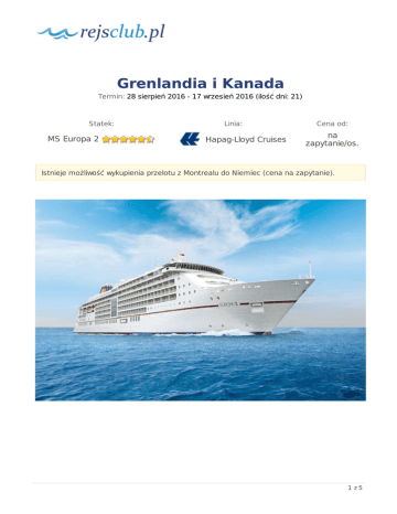 Grenlandia i Kanada Termin: 28 sierpień 2016 - 17 wrzesień 2016 (ilość dni: 21) Statek: MS Europa 2 Linia: Hapag-Lloyd Cruises Cena od: na zapytanie/os. Istnieje możliwość wykupienia przelotu z Montrealu do Niemiec (cena na zapytanie). 1 z5 TRASA REJSU Data Port Wpłynięcie Wypłynięcie Legenda dzień 1 niedziela 28.08.2016 Hamburg Niemcy --:-- 18:00 dzień 2 poniedziałek 29.08.2016 Dzień na morzu --:-- --:-- dzień 3 wtorek 30.08.2016 Bergen Norwegia 07:00 14:00 dzień 4 środa 31.08.2016 Dzień na morzu --:-- --:-- dzień 5 czwartek 01.09.2016 Heimaey Islandia 12:00 18:00 dzień 6 piątek 02.09.2016 Reykjavík Islandia 07:00 18:00 dzień 7 sobota 03.09.2016 Dzień na morzu --:-- --:-- dzień 8 niedziela 04.09.2016 Prins Christian Sund Grenlandia --:-- --:-- dzień 9 poniedziałek 05.09.2016 Nuuk Grenlandia 13:00 18:00 dzień 10 wtorek 06.09.2016 Eisfiord Grenlandia 16:00 19:00 dzień 11 środa 07.09.2016 Sisimiut Holsteinsborg Grenlandia 08:00 13:00 dzień 12 czwartek 08.09.2016 Dzień na morzu --:-- --:-- dzień 13 piątek 09.09.2016 Dzień na morzu --:-- --:-- dzień 14 sobota 10.09.2016 St. John's, Nowa Funlandia i Labrador Kanada 13:00 21:00 dzień 15 niedziela 11.09.2016 Dzień na morzu --:-- --:-- dzień 16 poniedziałek 12.09.2016 Gaspe Kanada 08:00 19:00 dzień 17 wtorek 13.09.2016 Dzień na morzu --:-- --:-- 2 z5 dzień 18 środa 14.09.2016 Saguenay Kanada 08:00 19:00 dzień 19 czwartek 15.09.2016 Quebec Kanada 08:00 --:-- dzień 20 piątek 16.09.2016 Quebec Kanada --:-- 06:30 dzień 20 piątek 16.09.2016 Trois-Rivieres Kanada 14:00 23:00 dzień 21 sobota 17.09.2016 Montreal Kanada 07:00 --:-- 3 z5 CENNIK Cena katalogowa Suite (apartament) €10 726.00 €19 618.00 Kabina gwarantowana €9 966.00 Kabina jednoosobowa €19 931.00 €35 312.00 3 osoba dorosła w kabinie na zapytanie dziecko od 2 do 12 lat jako 3 i 4 osoba w kabinie na zapytanie Opłaty portowe Cena promocyjna w cenie Uwaga! Ceny za osobę w kabinie dwuosobowej. Cena zawiera: zakwaterowanie w kabinie wybranej kategorii; opłaty portowe; przeloty do portu zaokrętowania i wyokrętowania (z lotnisk niemieckich) wyżywienie - 3 główne posiłki, przekąski między posiłkami, wieczorny bufet; wykłady, projekcje filmowe, rowery i kijki Nordic walking (w zależności od trasy), napoje serwowane do śniadania i w bufetach samoobsługowych; mini bar uzupełniany w napoje i piwo podczas rejsu; wodę butelkowaną podczas wycieczek fakultatywnych; serwis bagażowy podczas wejścia i zejścia ze statku; serwis kabinowy; korzystanie ze wszystkich urządzeń sportowo - rekreacyjnych znajdujących się na pokładzie statku (basen, jacuzzi, sala fitness, itp.); udział we wszystkich imprezach organizowanych na statku (przedstawienia w teatrze, koncerty, programy animacyjne itp.); napiwki dla obsługi na statku. Cena nie zawiera: ewentualnych noclegów w hotelu przed/po rejsie i transferów; wycieczek fakultatywnych w trakcie rejsu; korzystania z barów, mini baru w kabinie oraz napojów zamawianych w restauracji; korzystania z punktów usługowych (fryzjer, pralnia, fotograf, salon piękności i odnowy biologicznej, internet) i wydatków osobistych; ubezpieczenia KL, NNW i bagaż (około 1 - 1,5 EUR/osoba/dzień), kosztów wiz (tam gdzie wymagane). Ważna informacja: Armator niemieckojęzyczny, wybrane rejsy i terminy oferowane są jako "International" z obsługą anglojęzyczną. 4 z5 5 z5