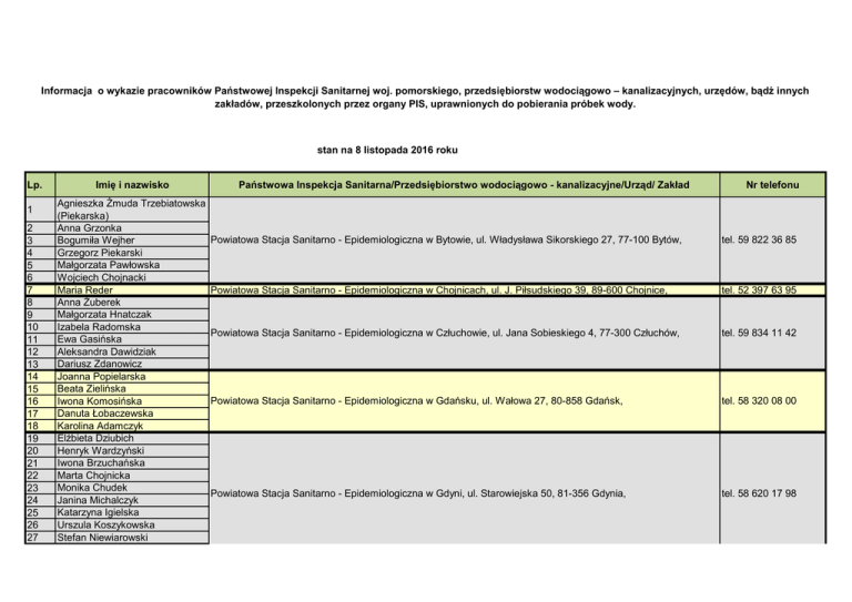 Informacja o wykazie pracowników Państwowej Inspekcji Sanitarnej woj. pomorskiego, przedsiębiorstw wodociągowo – kanalizacyjnych, urzędów, bądź innych zakładów, przeszkolonych przez organy PIS, uprawnionych do pobierania próbek wody. stan na 8 listopada 2016 roku Lp. 1 2 3 4 5 6 7 8 9 10 11 12 13 14 15 16 17 18 19 20 21 22 23 24 25 26 27 Imię i nazwisko Agnieszka Żmuda Trzebiatowska (Piekarska) Anna Grzonka Bogumiła Wejher Grzegorz Piekarski Małgorzata Pawłowska Wojciech Chojnacki Maria Reder Anna Żuberek Małgorzata Hnatczak Izabela Radomska Ewa Gasińska Aleksandra Dawidziak Dariusz Zdanowicz Joanna Popielarska Beata Zielińska Iwona Komosińska Danuta Łobaczewska Karolina Adamczyk Elżbieta Dziubich Henryk Wardzyński Iwona Brzuchańska Marta Chojnicka Monika Chudek Janina Michalczyk Katarzyna Igielska Urszula Koszykowska Stefan Niewiarowski Państwowa Inspekcja Sanitarna/Przedsiębiorstwo wodociągowo - kanalizacyjne/Urząd/ Zakład Nr telefonu Powiatowa Stacja Sanitarno - Epidemiologiczna w Bytowie, ul. Władysława Sikorskiego 27, 77-100 Bytów, tel. 59 822 36 85 Powiatowa Stacja Sanitarno - Epidemiologiczna w Chojnicach, ul. J. Piłsudskiego 39, 89-600 Chojnice, tel. 52 397 63 95 Powiatowa Stacja Sanitarno - Epidemiologiczna w Człuchowie, ul. Jana Sobieskiego 4, 77-300 Człuchów, tel. 59 834 11 42 Powiatowa Stacja Sanitarno - Epidemiologiczna w Gdańsku, ul. Wałowa 27, 80-858 Gdańsk, tel. 58 320 08 00 Powiatowa Stacja Sanitarno - Epidemiologiczna w Gdyni, ul. Starowiejska 50, 81-356 Gdynia, tel. 58 620 17 98 28 Wojciech Grzenkowski 29 Alicja Kowalkowska (Jeżewska) 30 31 32 33 34 35 36 37 38 39 40 41 42 43 44 45 46 47 48 49 Ewa Richert Gabriela Gackowska Maria Łęcka Emilia Koszałka (Sikora) Maria Wenta Teresa Adamczyk Alicja Pek Barbara Żelewska Elżbieta Dąbrowska Tomasz Wojak Wiesława Jereczek Magdalena Pipczyńska Marcin Jaszczor Gabriela Szumalska Wiesława Otlewska Agnieszka Powęska Karolina Samp Krystyna Kulesza Maria Wyrzykowska Renata Zając 50 Anna Pawelec (Lamkiewicz) 51 52 53 54 Hanna Klukowska Adela Fierka Anna Rubel Hanna Podeszwik 55 Sylwia Romańczyk (Jelińska) 56 57 58 59 60 61 Teresa Fierka Grzegorz Kowalski Jarosław Święcicki Iwona Knut Joanna Symula Katarzyna Błochowicz Dominika Jackiewicz Barańska (Mucha) 62 Powiatowa Stacja Sanitarno - Epidemiologiczna w Gdyni, ul. Starowiejska 50, 81-356 Gdynia, tel. 58 620 17 98 Powiatowa Stacja Sanitarno - Epidemiologiczna w Kartuzach, ul. Sambora 30a, 83-300 Kartuzy, tel. 58 681 24 88 Powiatowa Stacja Sanitarno - Epidemiologiczna w Kościerzynie, ul. Wodna 15, 83-400 Kościerzyna, tel. 58 686 69 48 Powiatowa Stacja Sanitarno - Epidemiologiczna w Kwidzynie, ul. F. Chopina 40, 82-500 Kwidzyn, tel.55 279 38 15 Powiatowa Stacja Sanitarno - Epidemiologiczna w Lęborku, ul. Gdańska 63, 84-300 Lębork, tel. 59 862 10 10 Powiatowa Stacja Sanitarno - Epidemiologiczna w Malborku, ul. Słowackiego 64, 82-200 Malbork, tel. 55 647 25 55 Powiatowa Stacja Sanitarno - Epidemiologiczna w Nowym Dworze Gdańskim, ul. Morska 1, 82-100 Nowy Dwór Gdański, tel. 55 247 57 01 Powiatowa Stacja Sanitarno - Epidemiologiczna w Pruszczu Gdańskim, ul. Grunwaldzka 25, 83-000 Pruszcz Gdański, tel. 58 683 54 12 63 64 Henryka Bodus Sylwia Radzajewska (Kurkowska) 65 Daria Ładkowska 66 Magdalena Blaszke 67 68 69 Renata Czerska Bożena Rąpca Iwona Dampc 70 Lucyna Chmielecka-Wittbrodt 71 72 73 Wiesława Bollin Adam Caliński Artur Bałaszewicz 74 Justyna Chełminiak (Jeżewska) 75 76 77 78 79 80 81 Małgorzata Szymczak Mirosław Anuszewski Ewa Łaga Witold Ringwelski Włodzimierz Sławny Małgorzata Dębińska (Kubicka) Paweł Downar-Zapolski 82 Ewelina Kościńska (Sobiecka) 83 84 85 86 87 88 89 90 91 92 93 94 95 Arkadiusz Racław Katarzyna Herman Karolina Solecka Jacek Bartoszko Marcin Motek Iwona Rojewska Wojciech Polak Michał Szarugiewicz Alicja Juhas Aleksandra Papuga Barbara Warign Joanna Liput Joanna Maćkowiak Powiatowa Stacja Sanitarno - Epidemiologiczna w Pruszczu Gdańskim, ul. Grunwaldzka 25, 83-000 Pruszcz Gdański, tel. 58 683 54 12 Powiatowa Stacja Sanitarno - Epidemiologiczna w Pucku, ul. Wojska Polskiego 16, 84-100 Puck, tel. 58 673 03 41 Powiatowa Stacja Sanitarno - Epidemiologiczna w Słupsku, ul. Piotra Skargi 8, 76-200 Słupsk, tel. 59 843 81 55 96 97 98 99 100 101 102 103 104 105 106 107 108 109 110 111 112 113 114 115 116 117 118 119 120 121 122 123 124 125 126 127 128 129 130 131 132 133 Roman Szturo Marzena Dargac Monika Ropiak Cezary Kowalski Rafał Mikucki Agnieszka Kamińska Małgorzata Kamińska Piotr Łaga Ewa Ciesielska Teresa Orlikowska Anna Czarnecka Gizela Frischmut Alicja Latuszewska Ireneusz Felski Justyna Reszczyńska Wiesława Skarzynska Maria Kordynowska Iwona Kiżewska Bartłomiej Baruchowski Monika Michna Jolanta Targońska Beata Wieloch Daria Stefanowska (Skolimowska) Natalia Świeczkowska Karolina Rożek Leszek Bieniek Anna Graczykowska (Zielińska) Danuta Osipiuk Marzena Szymańska Izabela Stadnicka Romualda Jarzembińska Aleksandra Jarocka Lucyna Szlaga Danuta Ukleja Janina Majewska Małgorzata Narloch Ilona Pielas Aleksandra Aleksandrowska Powiatowa Stacja Sanitarno - Epidemiologiczna w Starogardzie Gdańskim, ul. Kanałowa 5, 83-200 Starogard Gdański, tel. 58 562 40 11 Powiatowa Stacja Sanitarno - Epidemiologiczna w Sopocie, ul. Kościuszki 23, 81-704 Sopot, tel. 58 551 06 35 Powiatowa Stacja Sanitarno - Epidemiologiczna w Tczewie, ul. Obrońcow Westerplatte 10, 83-100 Tczew, tel. 58 531 39 31 Powiatowa Stacja Sanitarno - Epidemiologiczna w Wejherowie, ul. Obrońców Helu 3, 84-200 Wejherowo, tel. 58 672 74 27 134 135 136 137 138 139 140 141 142 143 144 145 146 147 148 149 150 151 152 153 154 155 156 157 158 159 160 161 162 163 164 165 Ahmed Abrahim Alsughari Elżbieta Staszek Iwona Tusińska Zbigniew Karczewski Dorota Tomaszewska Błażej Zieliński Marta Czarnecka Ewa Dziurzyńska Gabriela Rocławska Agnieszka Kietlińska Alina Siłakowska Magdalena Sieradzan Małgorz