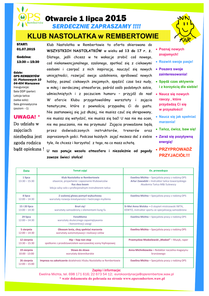 Otwarcie 1 lipca 2015 SERDECZNIE ZAPRASZAMY !!!! KLUB NASTOLATKA w REMBERTOWIE START: 01.07.2015 Klub Nastolatka w Rembertowie to oferta skierowana do Godzina: 13:30 — 15:30 Dlatego, jeśli chcesz w te wakacje zrobić coś nowego, WSZYSTKICH NASTOLATKÓW w wieku od 13 do 17 r. ż. Gdzie: OPS REMBERTÓW Ul. Plutonowych 10 04-404 Warszawa coś niekonwencjonalnego, szalonego, spotkać się z ciekawymi Rozwiń swoje pasje! osobami i czerpać z nich inspirację, nauczyć się nowych Poszerz swoje zainteresowania! umiejętności, rozwijać swoje uzdolnienia, spróbować nowych hobby, poznać ciekawych znajomych, spędzić czas bez nudy, w miłej i serdecznej atmosferze, pośród osób podobnych sobie, Inauguracja: Sala DDP (parter) Lekcja tańca (salsa solo): Sala gimnastyczna (poziom –1) uśmiechniętych i z poczuciem humoru – przyjdź do nas! W UWAGA! * Do udziału w zajęciach niezbędna jest zgoda rodzica bądź opiekuna ! Poznaj nowych znajomych! ofercie Klubu przygotowaliśmy tematyczne, które z pewnością warsztaty przypadną Ci i zajęcia do gustu. Nie zastanawiaj się już dłużej, nie musisz czuć się skrępowany, nie musisz się wstydzić, nie musisz się bać! U nas nie ma ocen, nie ma pouczania, nie ma przymusu! Zajęcia prowadzone będą przez doświadczonych instruktorów, trenerów oraz zaproszonych gości. Podczas każdych zajęć możesz dać z siebie Spędź czas aktywnie i z korzyścią dla siebie! Naucz się nowych rzeczy , które przydadzą Ci się w przyszłości! Naucz się jak spełniać marzenia! Tańcz, ćwicz, baw się! tyle, ile chcesz i korzystać z tego, na co masz ochotę. Zaraź się pozytywną energią! U nas panuje wesoła atmosfera i niezależnie od pogody zawsze świeci słońce! PRZYPROWADŹ PRZYJACIÓŁ!!! Data Temat zajęć Os. prowadząca 1 lipca 13:30 – 15:30 Klub Nastolatka w Rembertowie otwarcie, przywitanie i zapoznanie Klubowiczów Raz dwa boom lekcja salsy solo z profesjonalnym instruktorem tańca Ewelina Michta – Specjalista pracy z rodziną OPS Artur Zawadzki – Instruktor tańca towarzyskiego Akademia Tańca M&I Sulewscy 8 lipca 12:00 – 14:30 Z szalonej głowy pomysł wybuchowy warsztaty rozwoju kreatywności i twórczego myślenia Ewelina Michta – Specjalista pracy z rodziną OPS 15 i 20 lipca 13:00 – 14:30 Broń się! warsztaty samoobrony z elementami kung fu 29 lipca 12:00 – 14:30 FenoMemo warsztaty skutecznego zapamiętywania i koncentracji uwagi Ewelina Michta – Specjalista pracy z rodziną OPS 5 sierpnia 12:00 – 14:30 Olewam lenia, chcę spełniać marzenia warsztaty automotywacji i realizacji celów Ewelina Michta – Specjalista pracy z rodziną OPS 12 sierpnia 13:30 – 15:30 Hip – hop non stop spotkanie z przedstawicielem warszawskiej sceny hiphopowej Przemysław Modzelewski „Modzel” – Muzyk, raper 19 sierpnia 10:00 - 13:00 Słowo do słowa warsztaty dziennikarskie Anna Michnikowska – Redaktor naczelna magazynu branżowego 26 sierpnia 12:00 – 15:00 Impreza na zakończenie działalności Klubu Nastolatka w Rembertowie Ewelina Michta – Specjalista pracy z rodziną OPS Si-Moi Anna Wolska —3 stopień mistrzowski IWTA, EEWTO, instruktor sportu ze specjalizacją samoobrona Zapisy i informacje: Ewelina Michta, tel. 698 171 616; 22 673 54 12; [email protected] * wzór dokumentu do pobrania na stronie www.opsrembertow.waw.pl